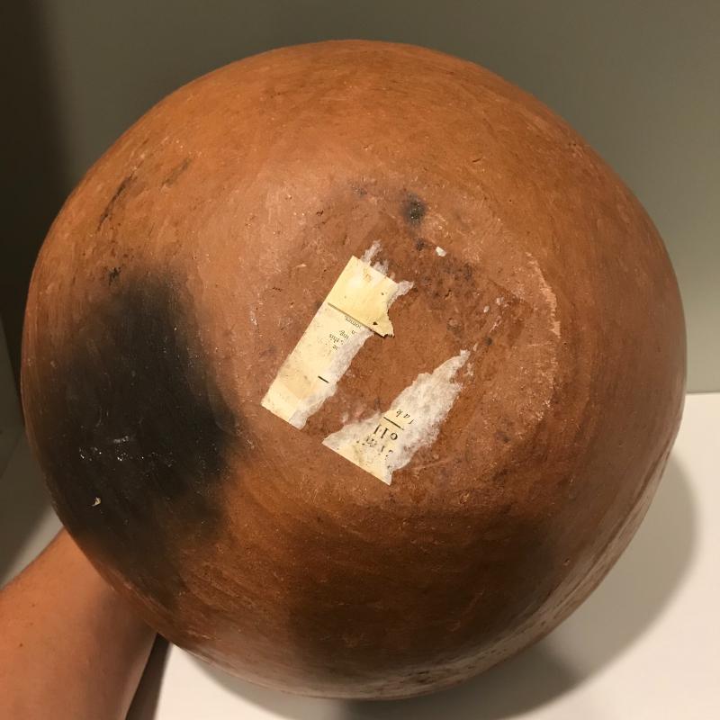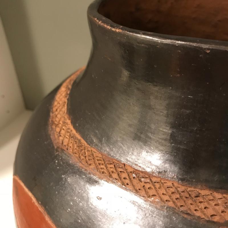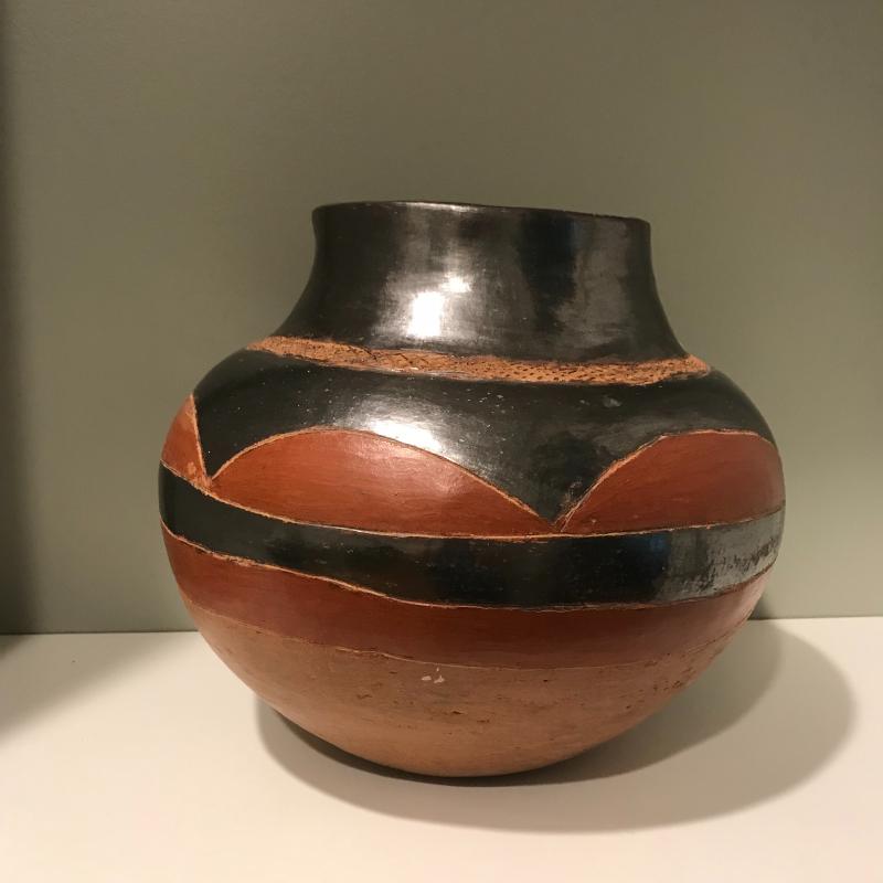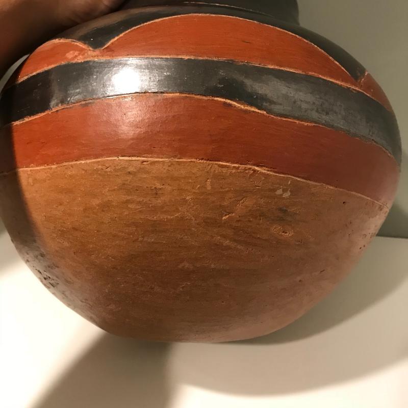 Large clay pot with silver and red hues appears to be hand made, textured, and painted. Pot has approx diameter of 11” and is 9.25” tall. Shipping available or local pick up in Arden, N.C.