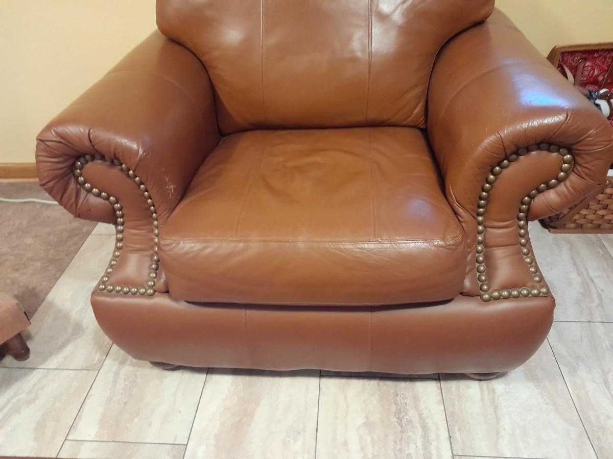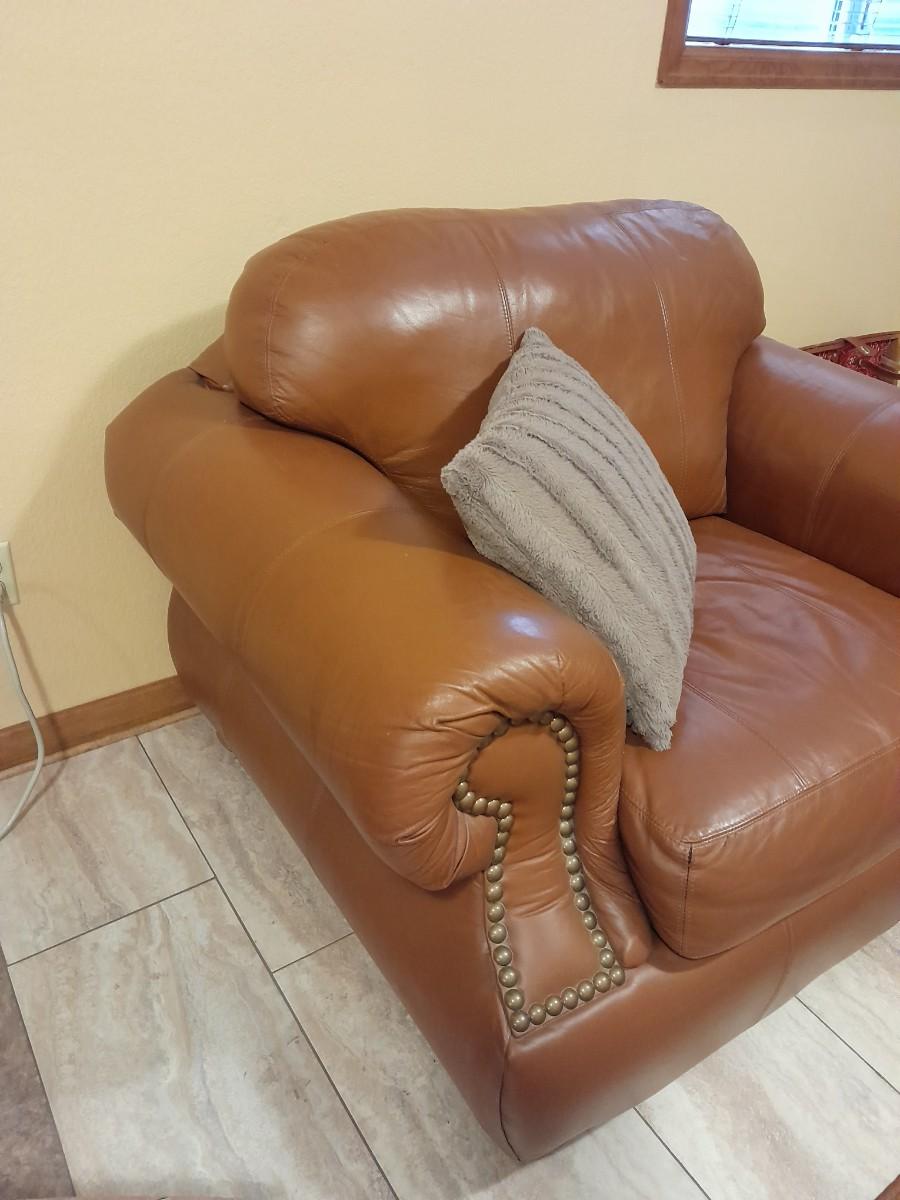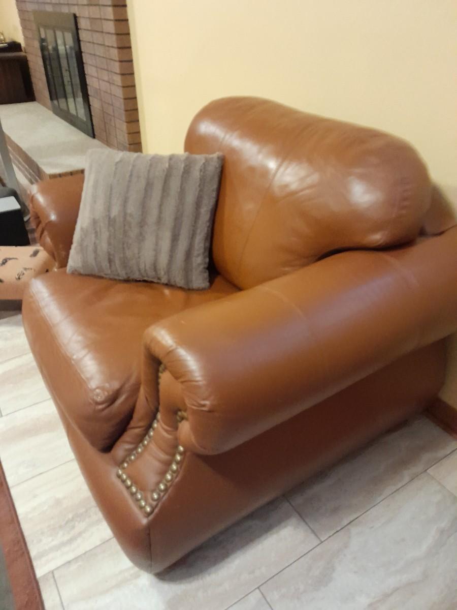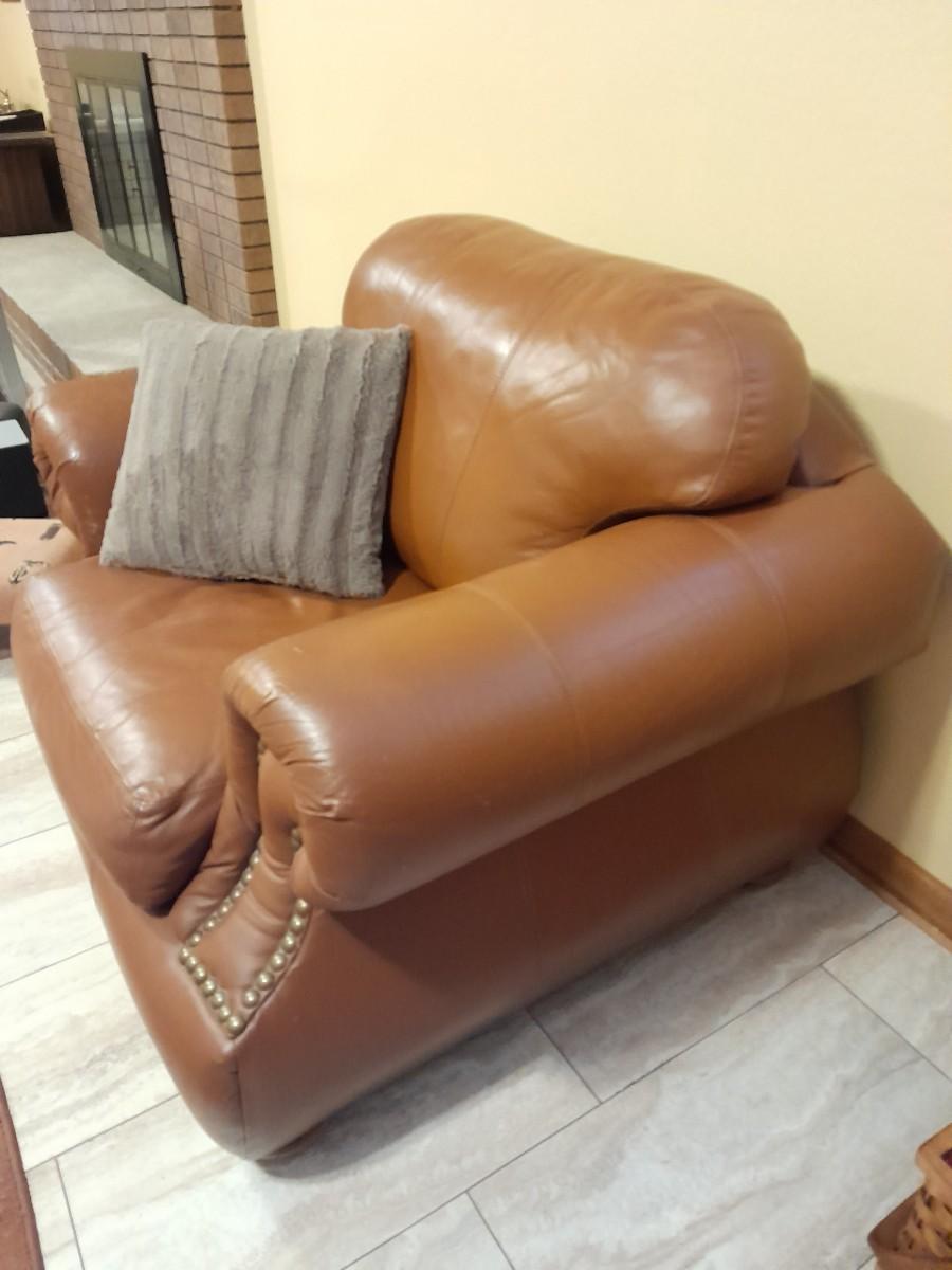 COMFORTABLE LOUNGING CHAIR 58" X 41" X 20" (has some peeling on arm as shown)