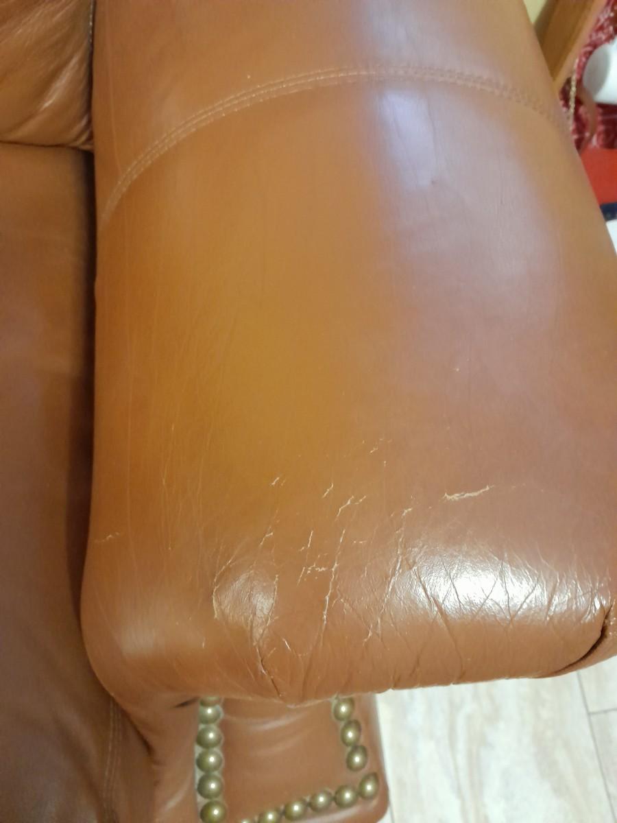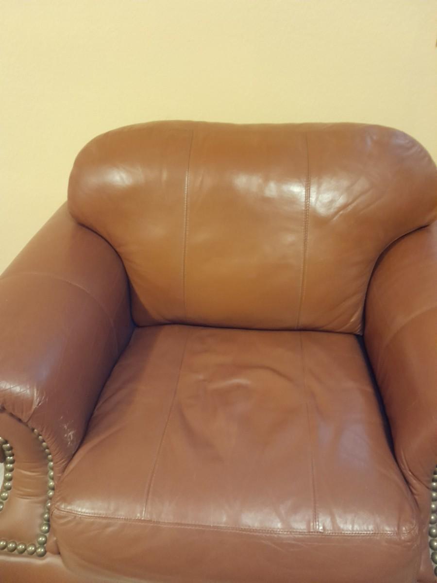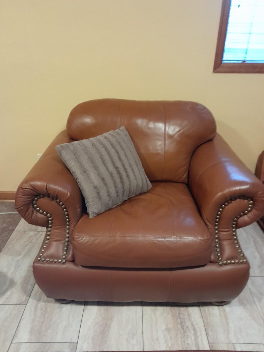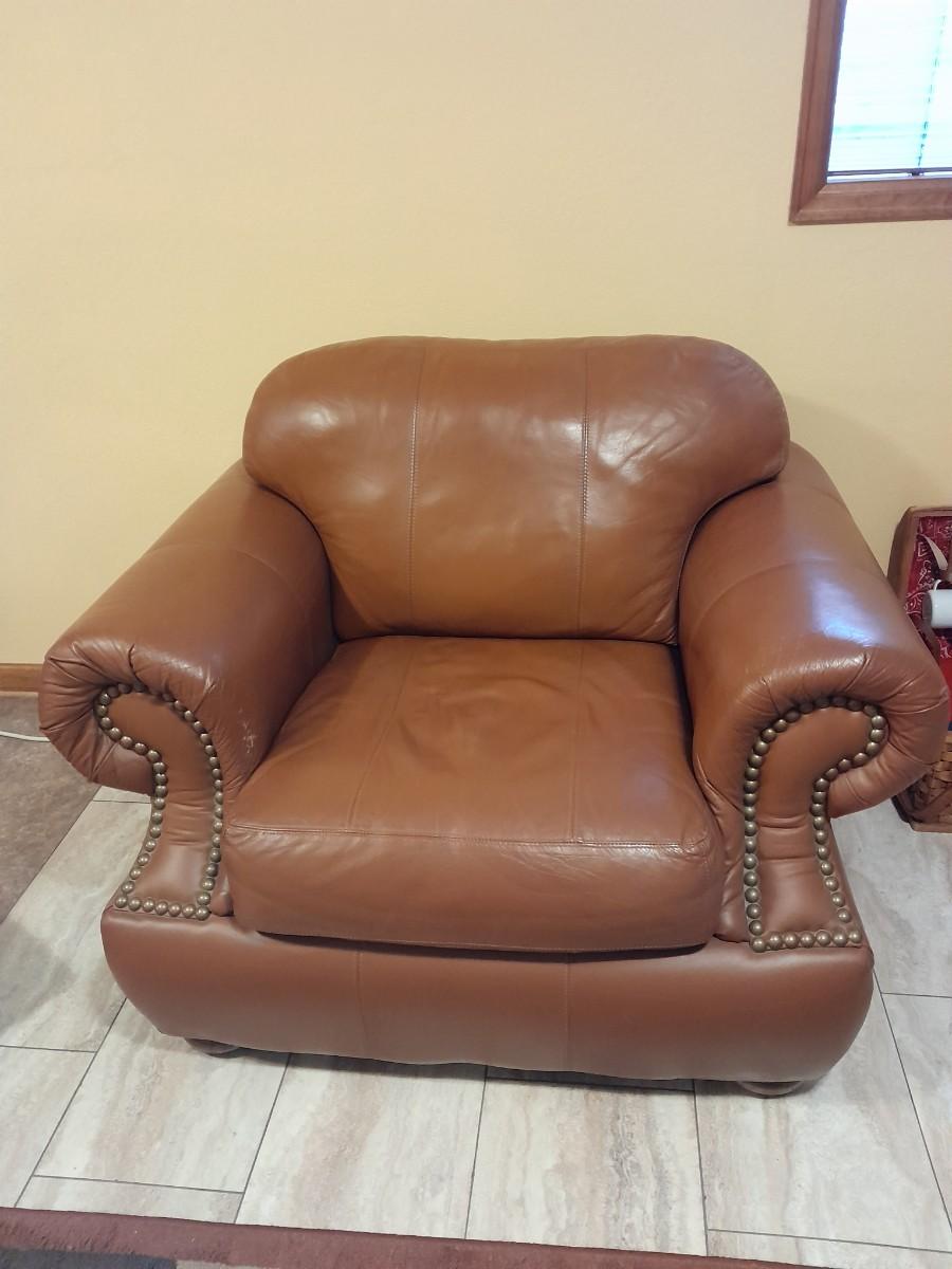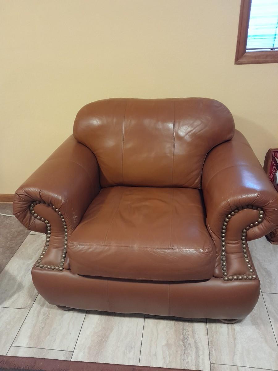COMFORTABLE LOUNGING CHAIR 58" X 41" X 20" (has some peeling on arm as shown)