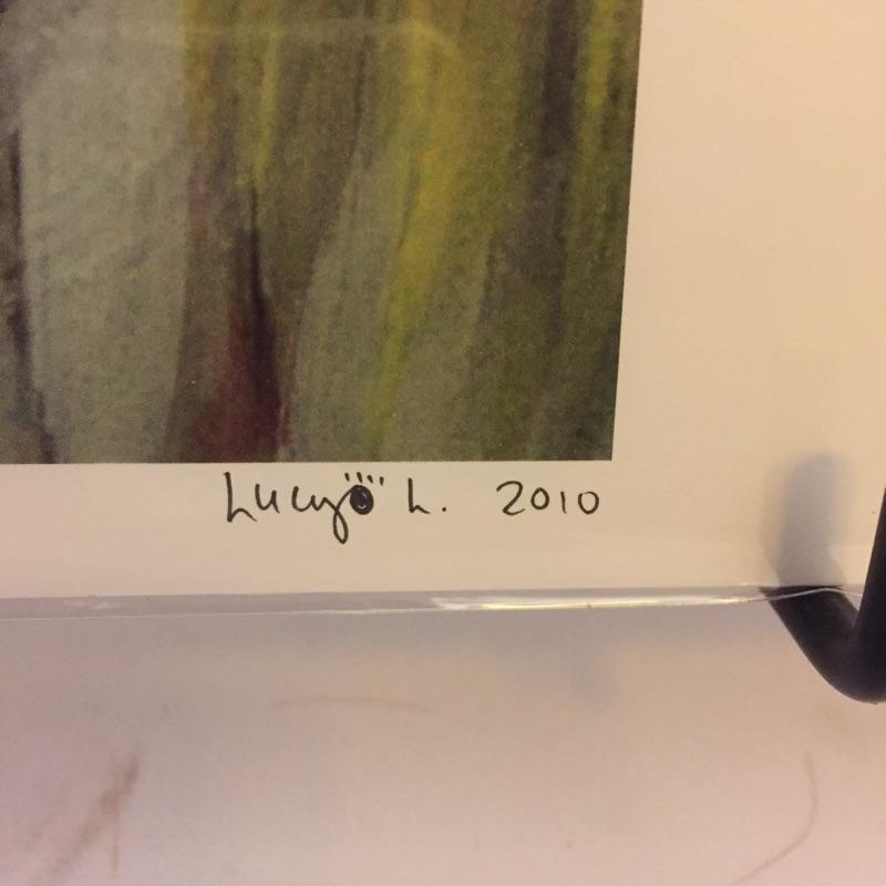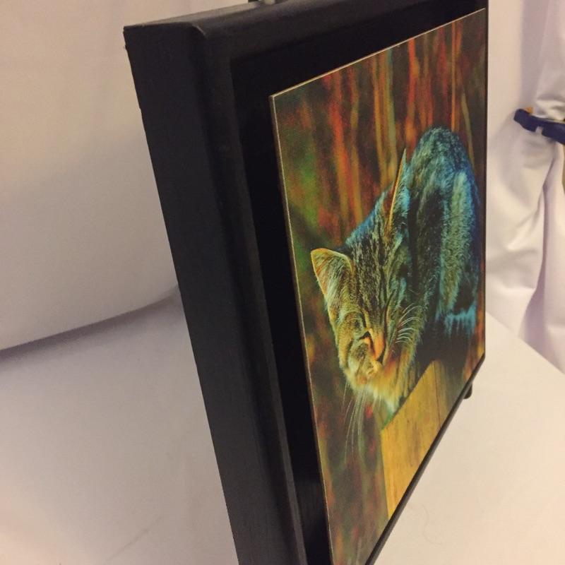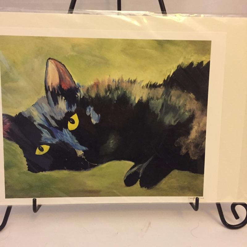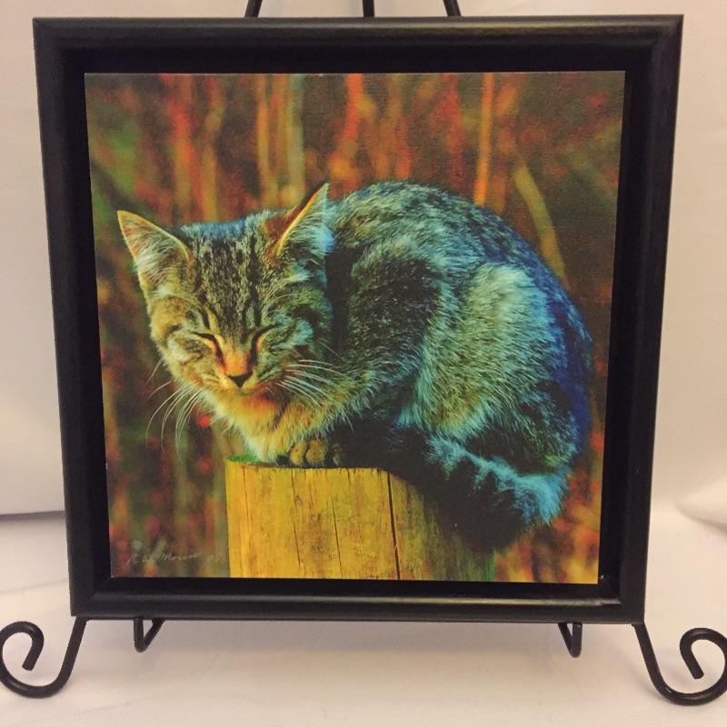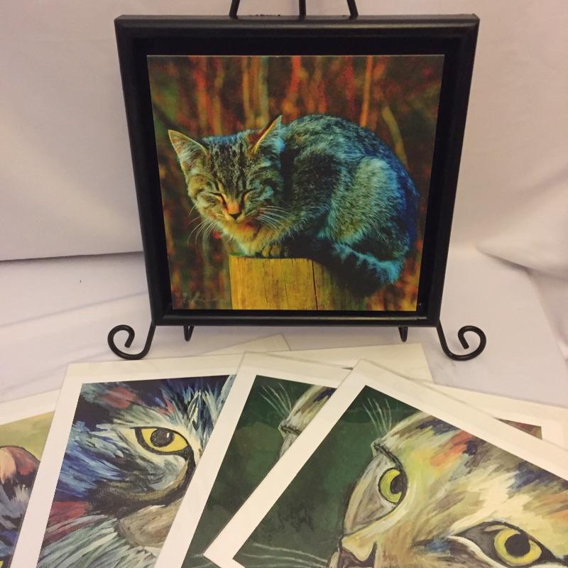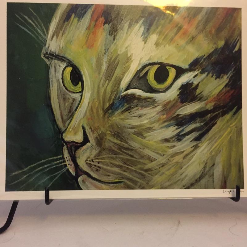Fantastic felines aplenty with this assortment of lovely cat art. Only one framed piece is a signed and dated photograph beautifully displayed in a wooden black frame; the photograph appears to be imprinted on a particle type board that then seems to float within the frame. This piece measures 14” x 14”. Then we have four signed and dated prints by North Carolina artist Lucy Lofland. The first of the three images has a duplicate(so four altogether), all equally stunning and still in their sleeves and signed.