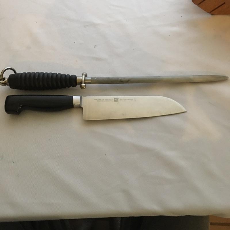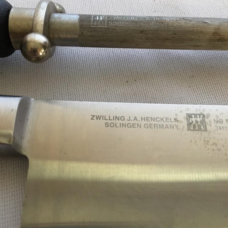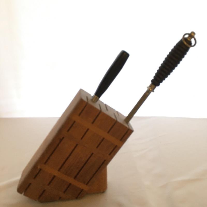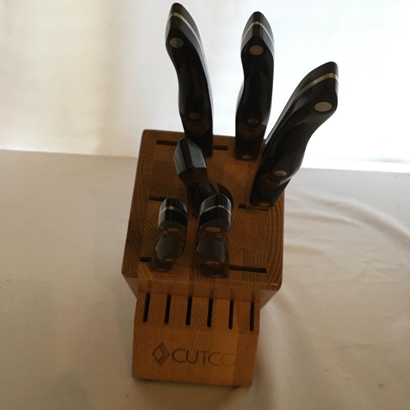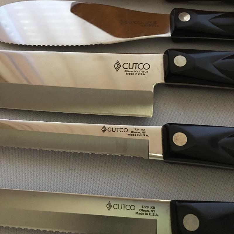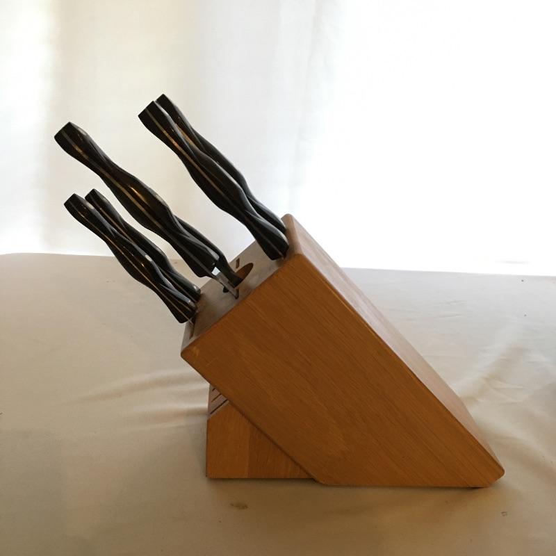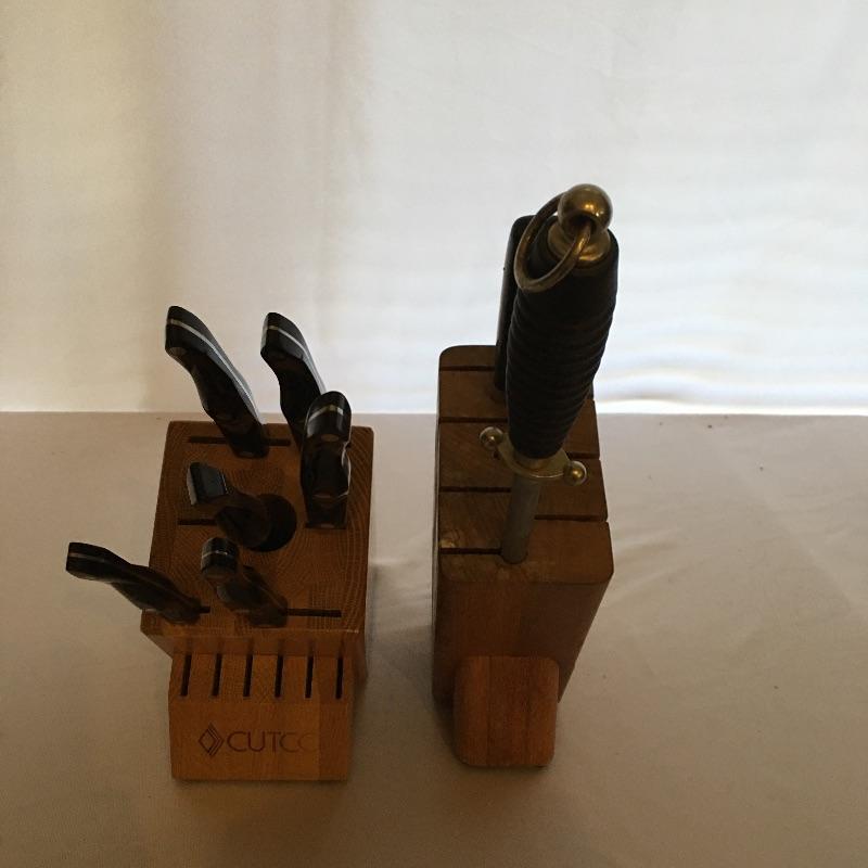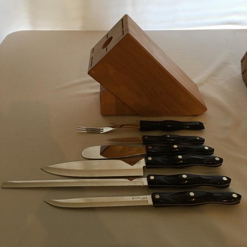 Cutco and J. A. Henckels knives. Lot includes five Cutco knives and one serving fork and one J. A. Henckels knife and a sharpener both with wooden blocks. Keep on the cutting edge with this sharp lot. Shipping Available.