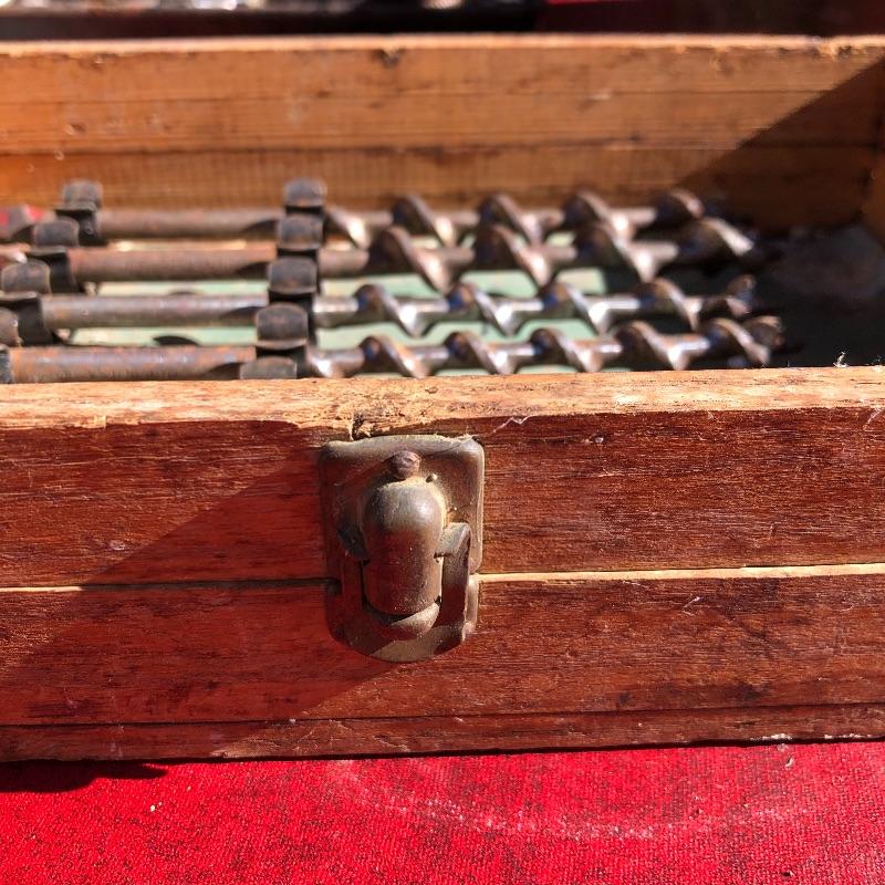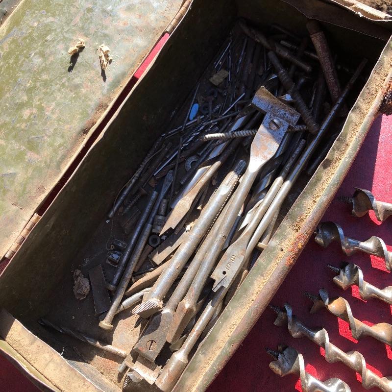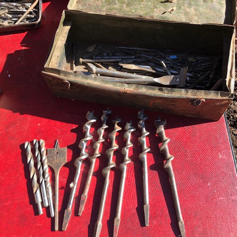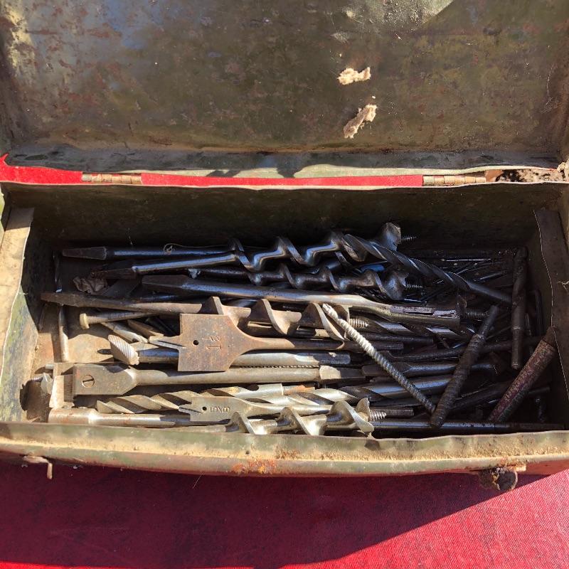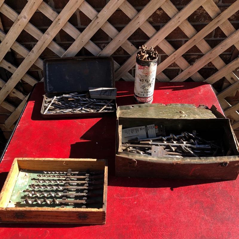 This lot contains all the drill bits you could ever need! It comes with two small metal boxes filled with drill bits of varying sizes and styles. Along with those, it has a metal tin labeled “Woodhill Plastic” that also contains various drill bits. Lastly, there is a wooden box with a set of seven drill bits that measure in order. Local pickup only.