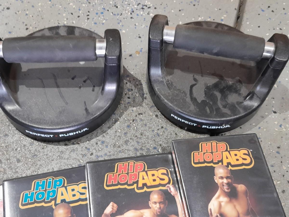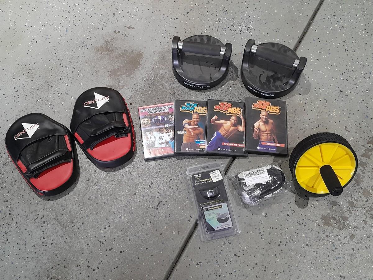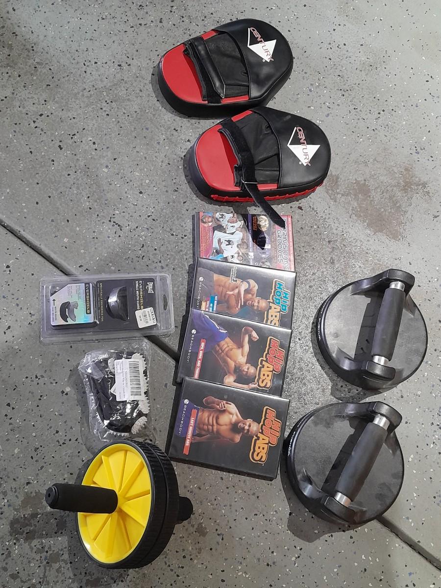 EXERCISE TIME! FOUR DVD'S THREE HIP HOP ABS, AND ONE DANCE MUSIC, EVERLAST MOUTH SHIELD, SUPVOX ACUPRESSURE MUSCLE STREE WRAP, PUSHUP BARS, HAND MITS FOR BOXING, AND MORE