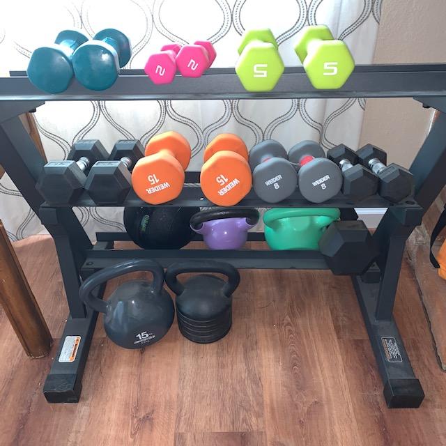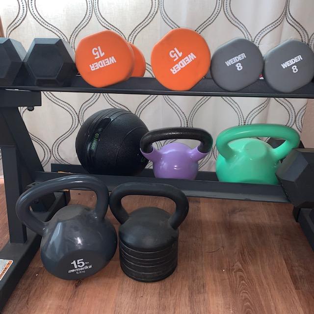 Metal Rack with exercise weight. Dumb Bells & Kettle Bells.