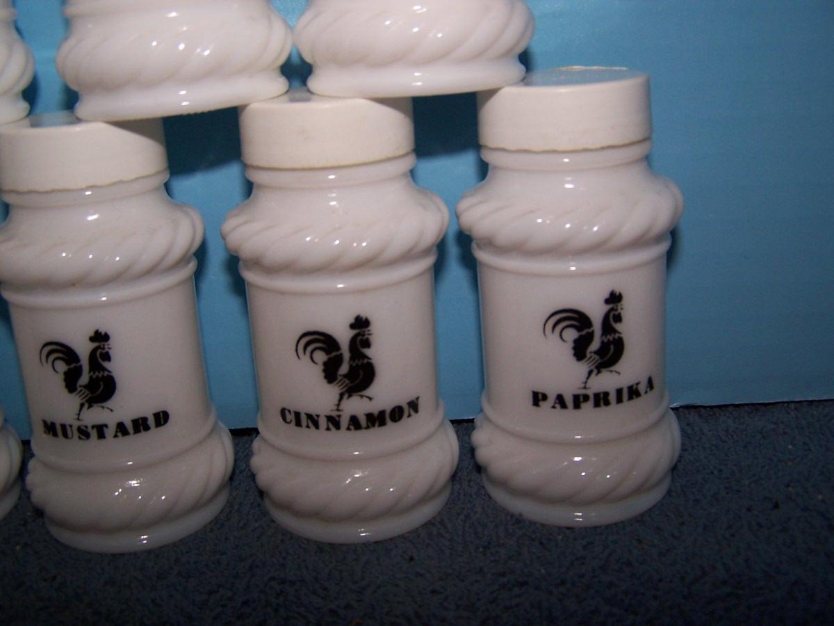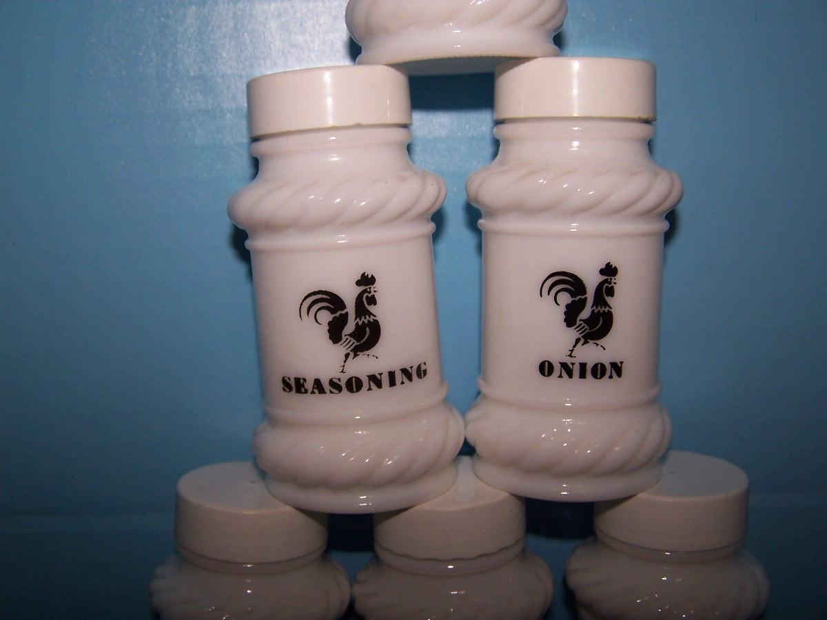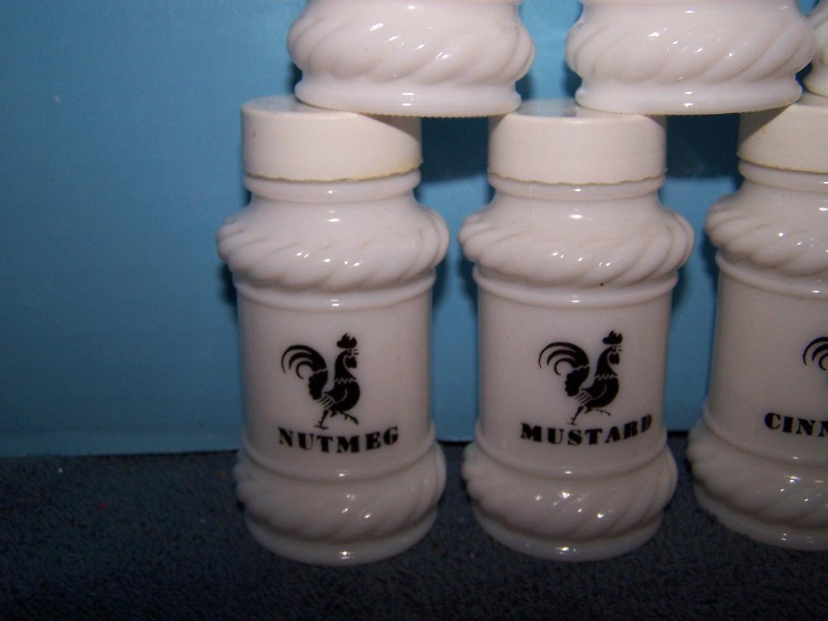 THESE ARE GREAT VINTAGE MCM MILK GLASS ROOSTER SPICE JARS!!! UNMARKED.. 3 1/2'' TALL.. 1 PLASTIC LID HAS A MELT SPOT, OTHERWISE,LIGHT WEAR..
