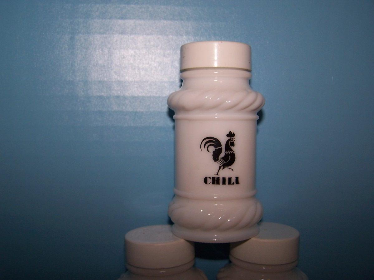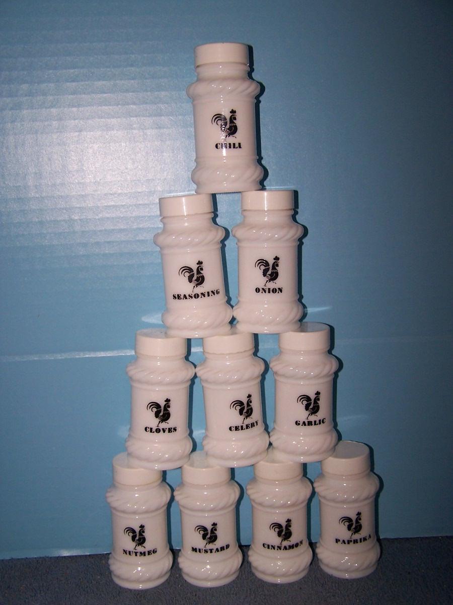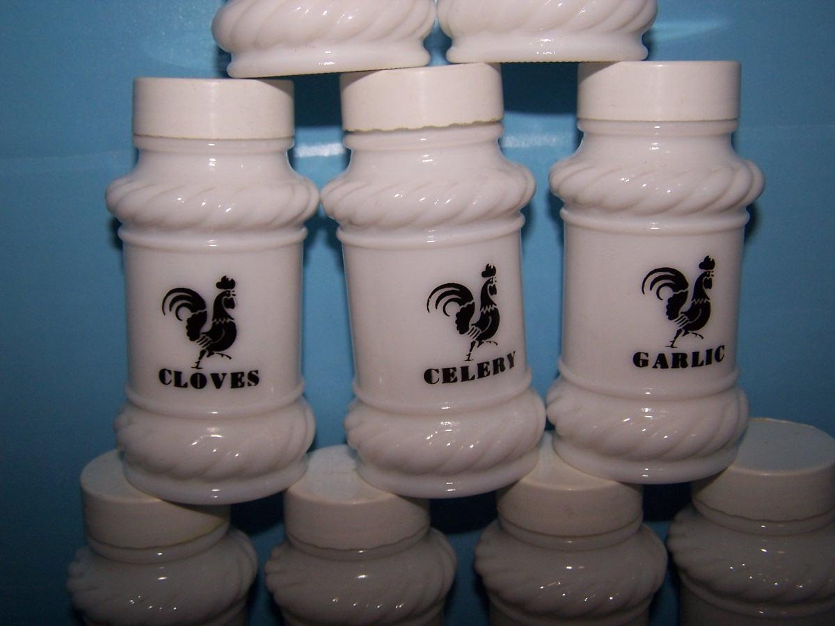 THESE ARE GREAT VINTAGE MCM MILK GLASS ROOSTER SPICE JARS!!! UNMARKED.. 3 1/2'' TALL.. 1 PLASTIC LID HAS A MELT SPOT, OTHERWISE,LIGHT WEAR..