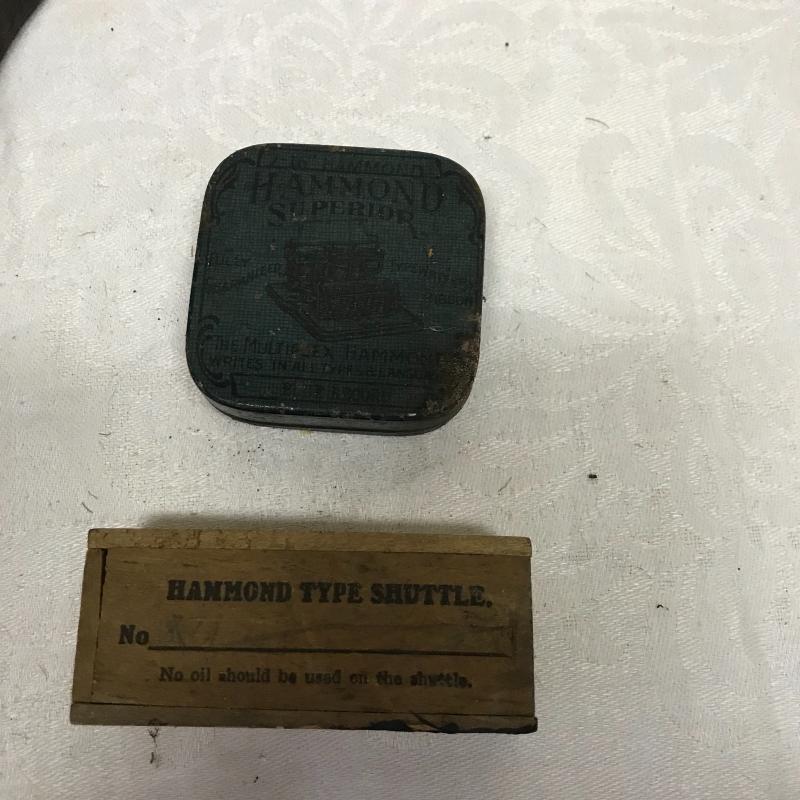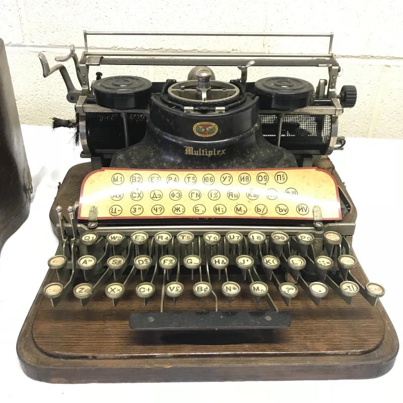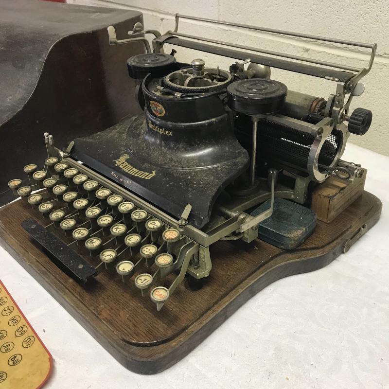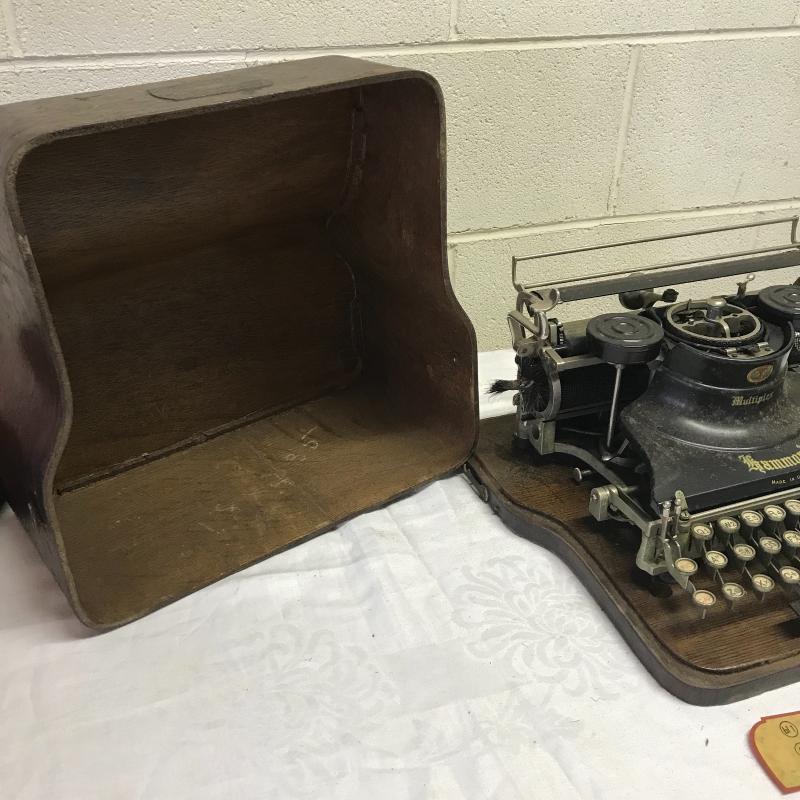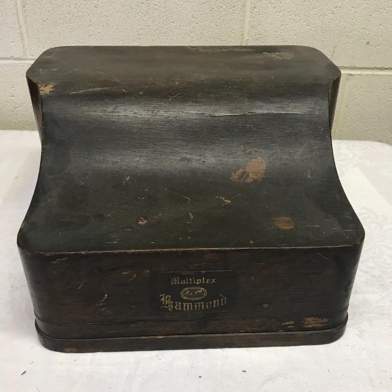 Vintage Hammond Multiplex Typewriter is on a wooden base and has a wood cover in great shape. Lot is available for local pick up in Asheville, NC.