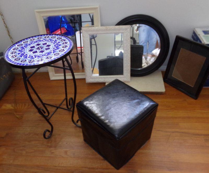 3 WALL MIRRORS, PICTURE FRAME, STORAGE OTTOMAN AND MOSAIC TOP TABLE