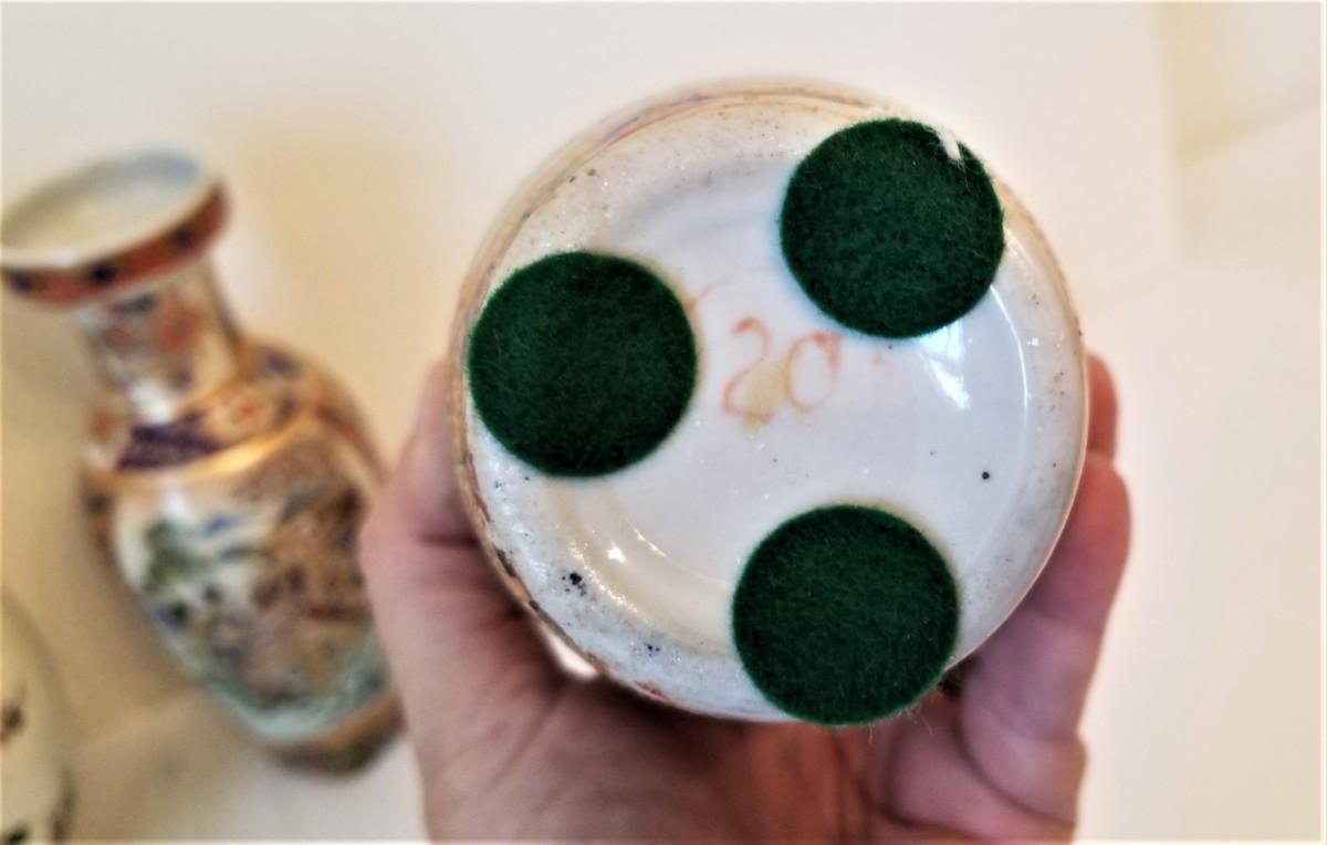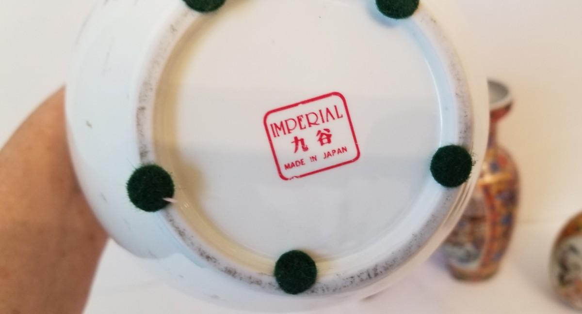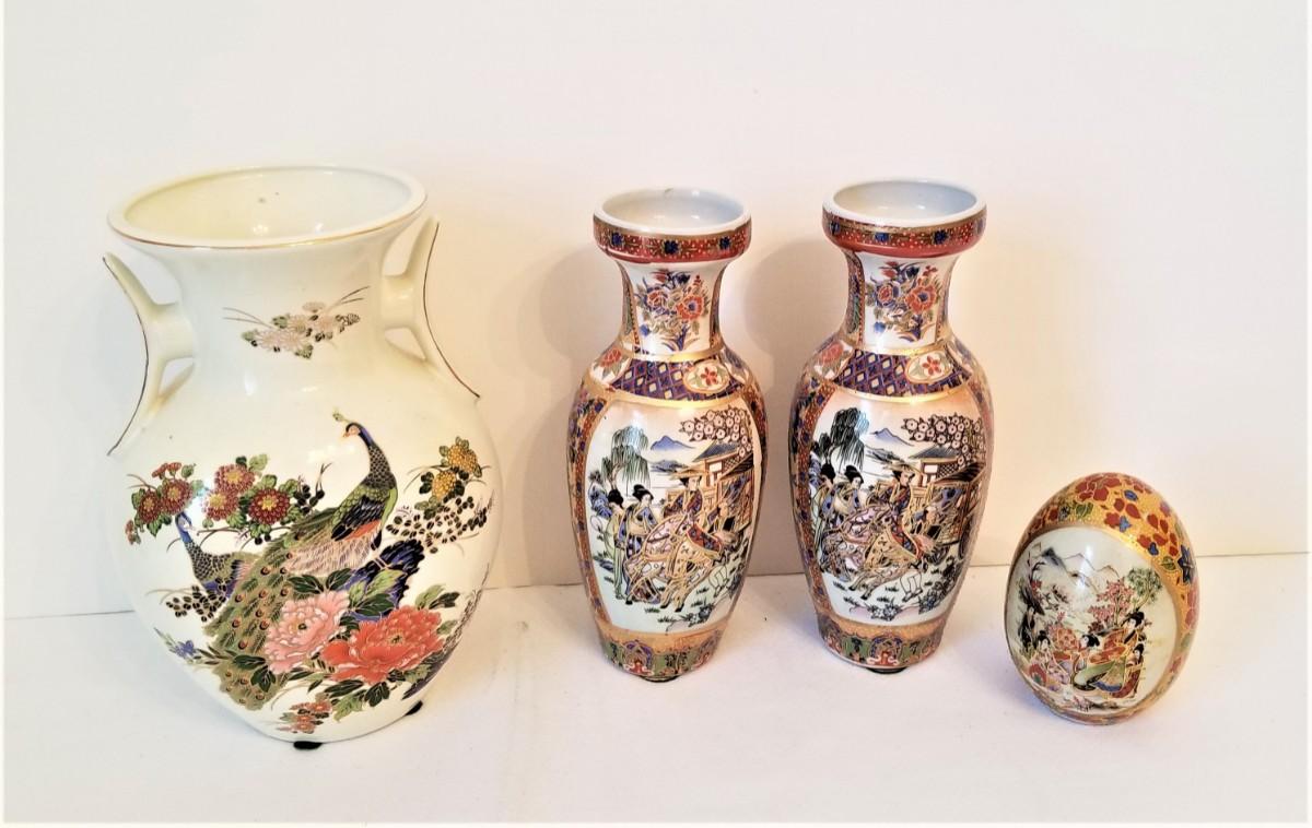 You get all you see here - nice pair of older Japanese vases, a vintage vase on the left, and a small egg shaped decorative object. Vase on left labeled "Imperial Japan" - pair measures 8" tall. All in good vintage condition.