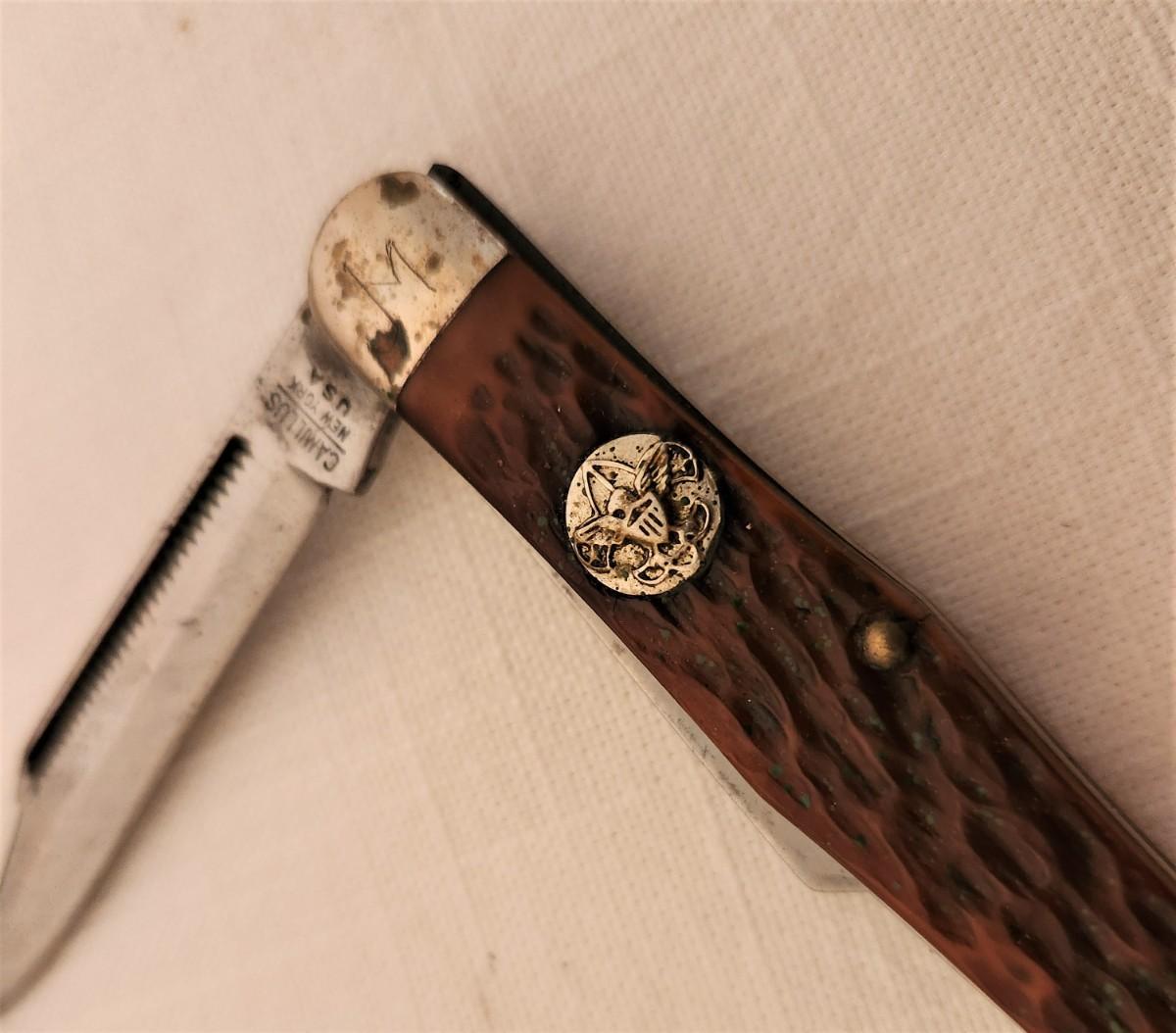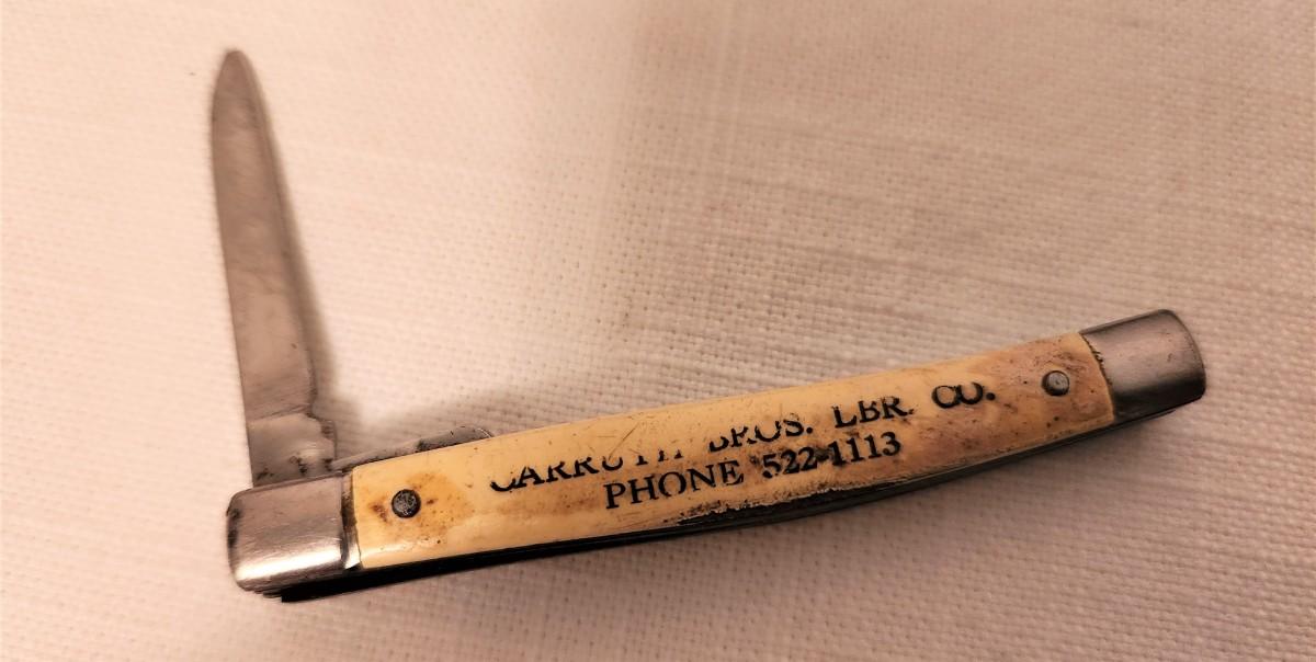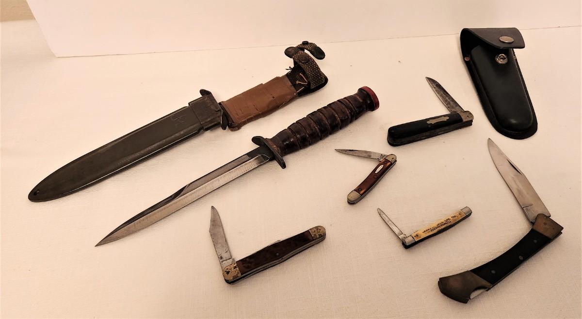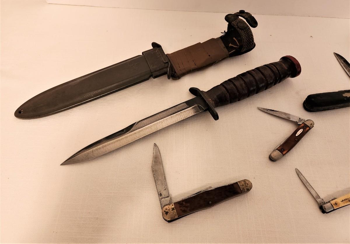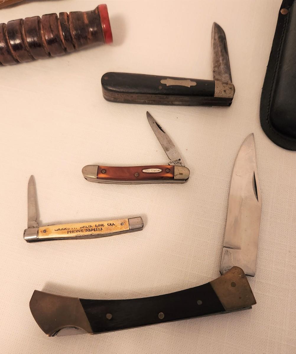 You get all you see here - trench knife with scabbard (11.5" long), Boy Scout Knife, Advertising Knife (New Orleans), Old Cutter Knife, 6 in all. All in used condition.