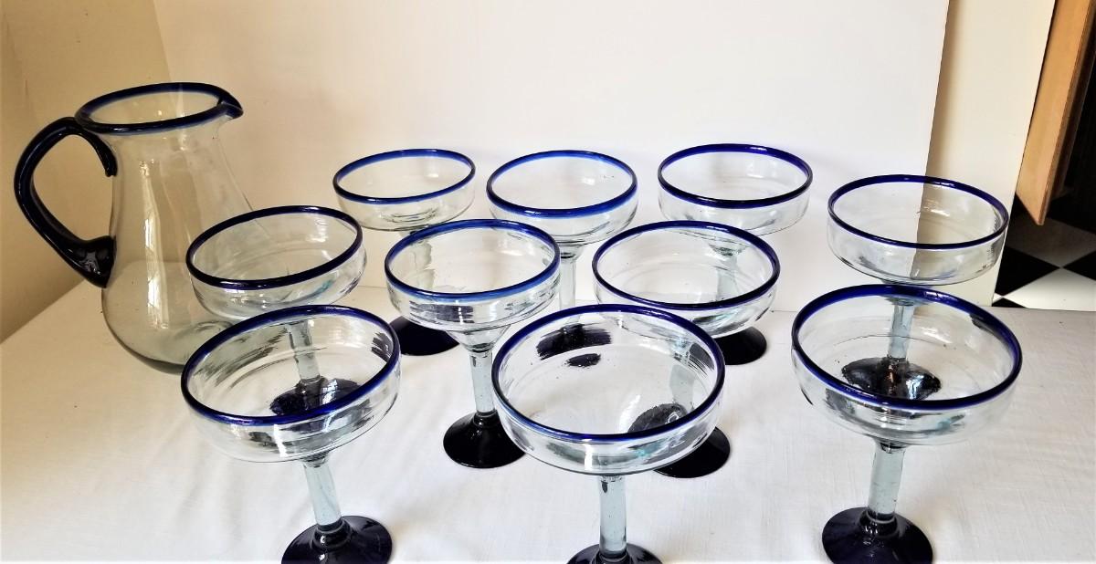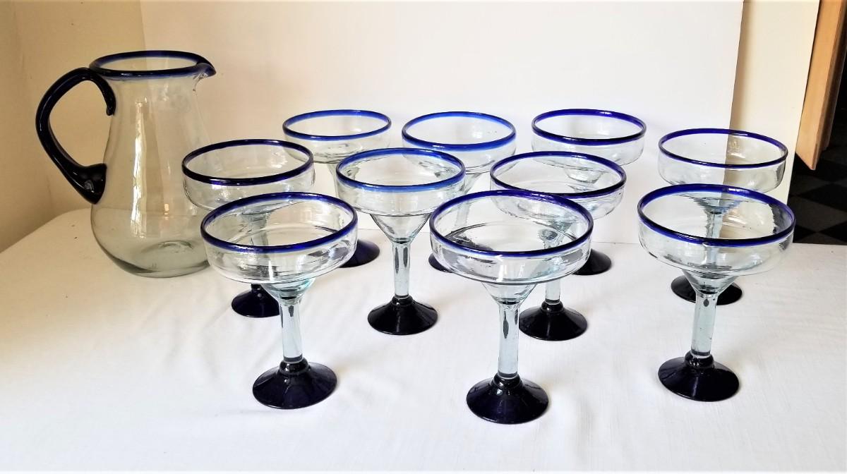Lot of 10 matching blue/white Margarita glasses with matching pitcher. Heavy/well made. Glasses are 7" tall and 5" across - pitcher is 10" tall. Good condition.