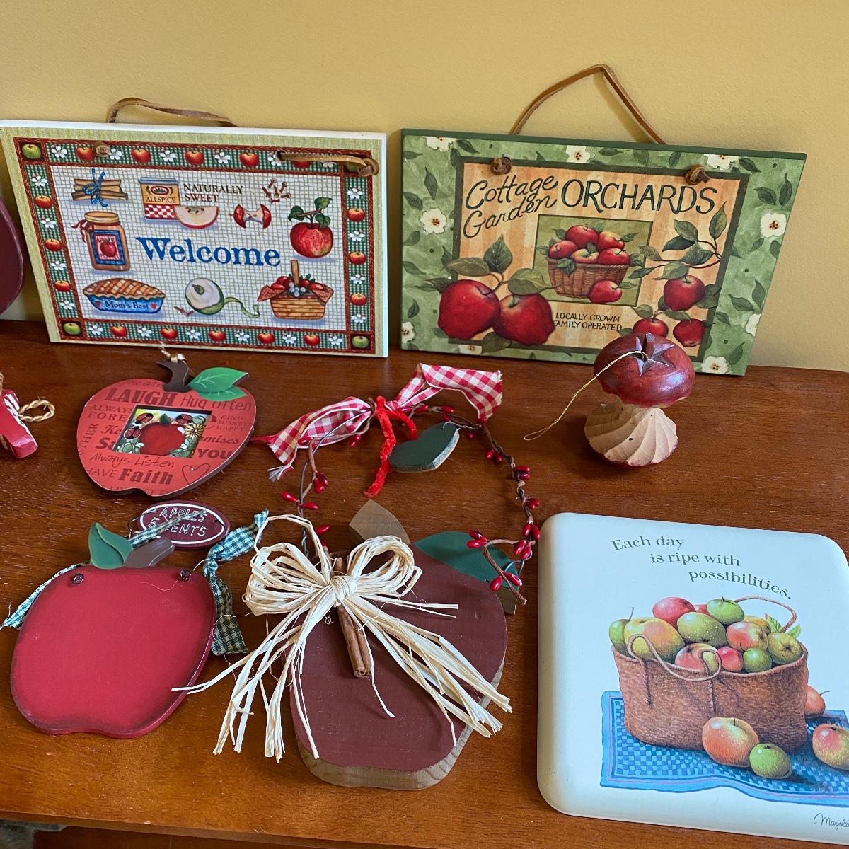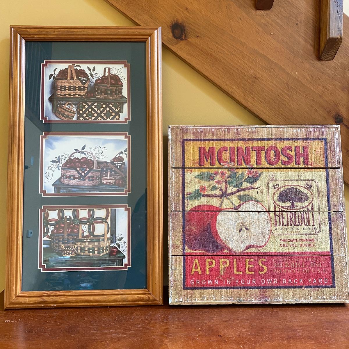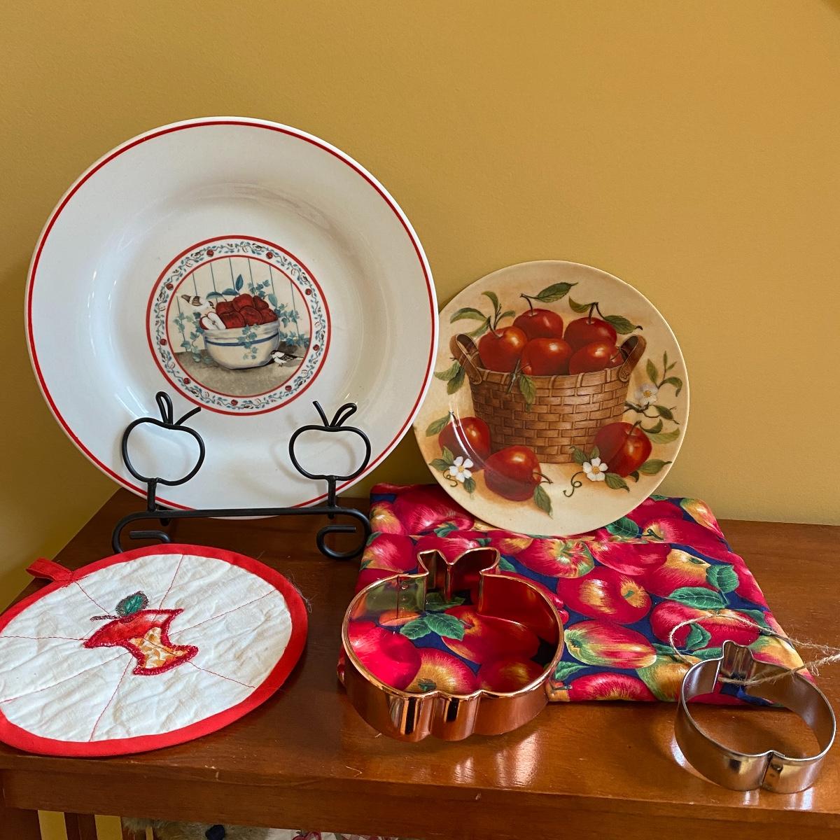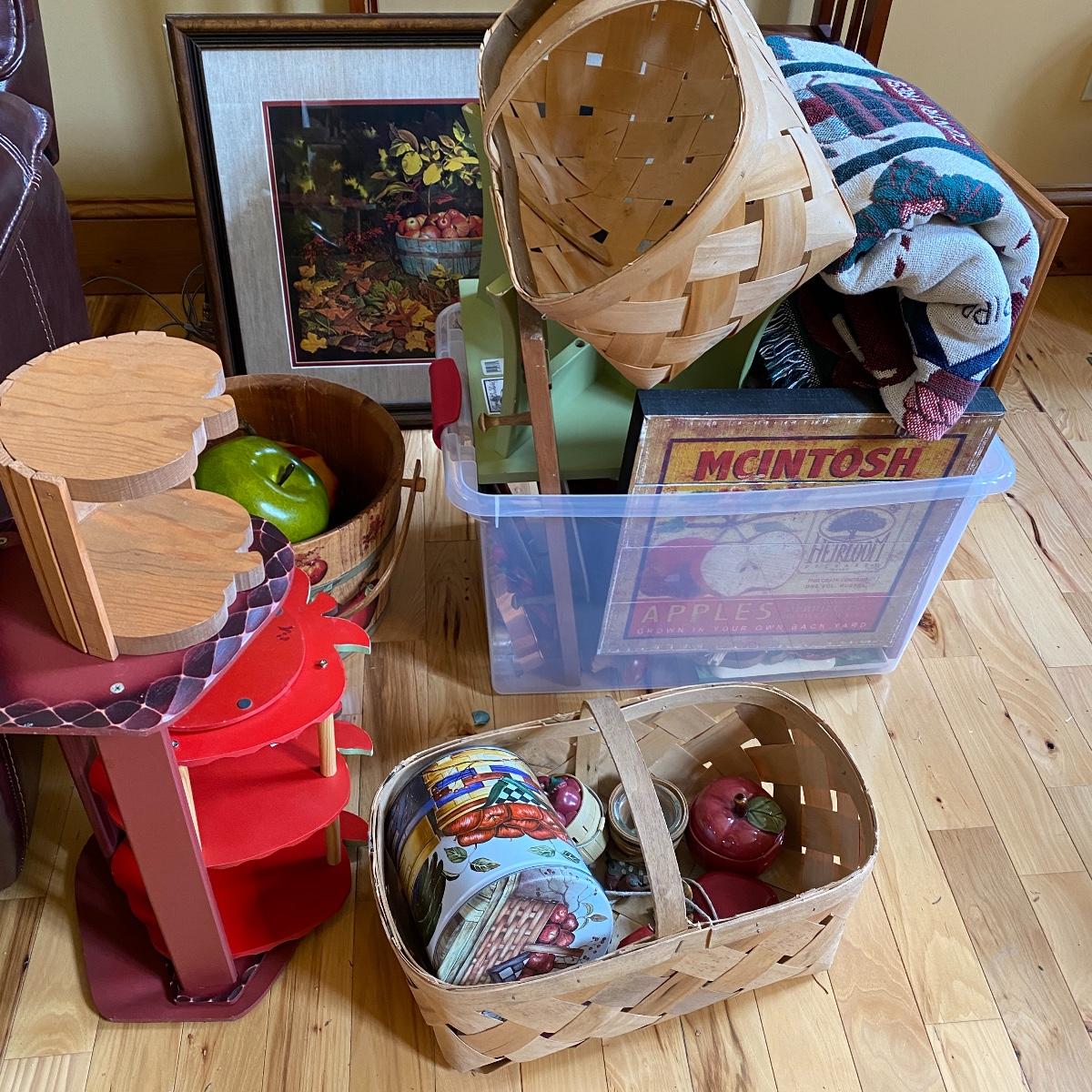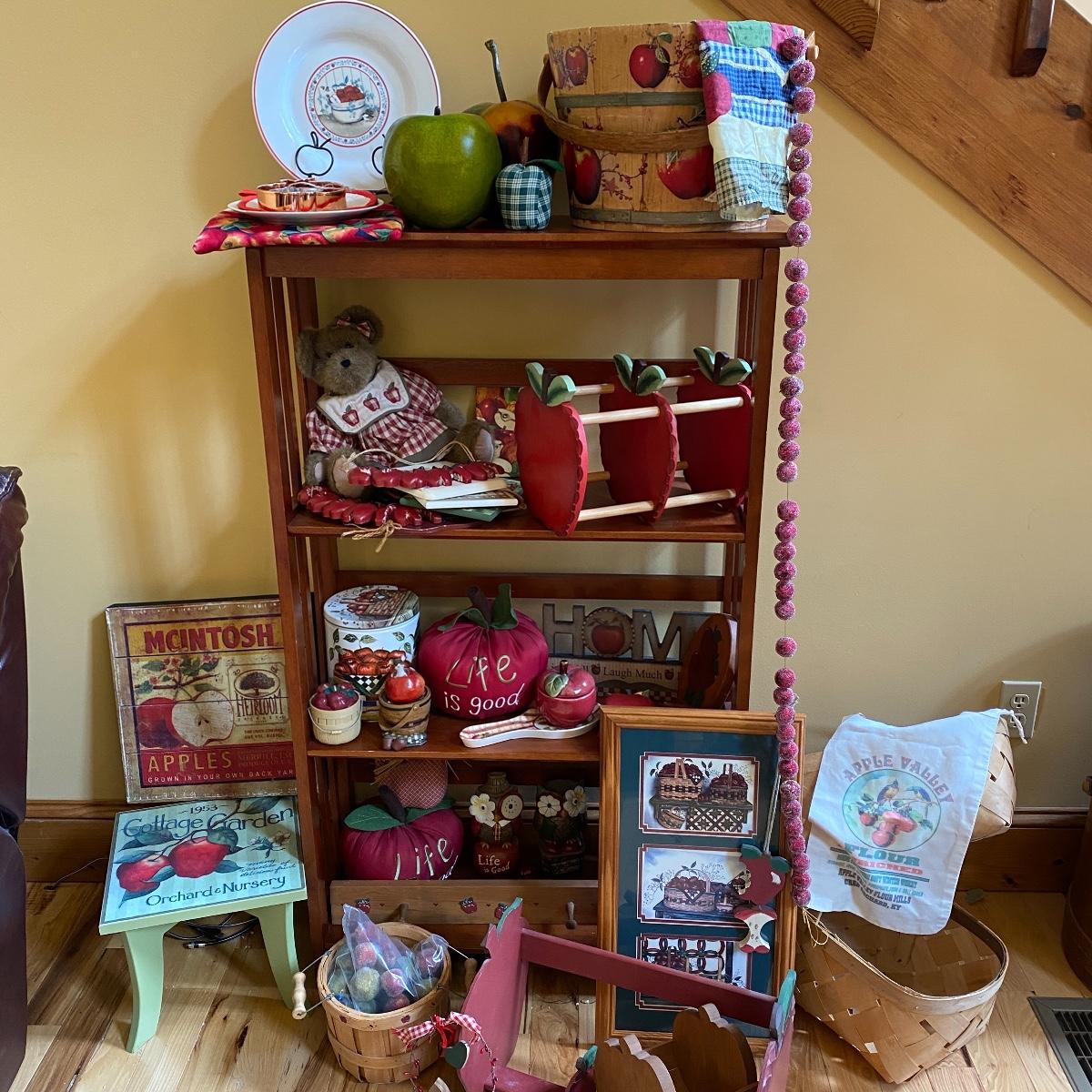 This is the heart of apple country and this lot has all you need to satisfy your cravings. There are apple baskets, art work, stool, plates, storage racks, and signs all with apple motifs. There is a stuffed Boyds bear in apple clothing, several apples made out of ceramics, wood and cloth. There are also sparkly apples to fill your baskets and even an apple apron and an apple blanket. This great lot has fun gifts or just fun decor for your home. Shelving not included. (Tall Shelf is in lot 141.) Large wooden basket with apple motif measures 15”diameter by 9.5” tall. Stool measures 12” square by 10” tall. Largest framed art is by Bob Timberlake and measures 26.5” x 22.5”. Please note that second picture in three picture frame has slid down. See pix. Local pick up only. Clear bin included to help you transport your items.