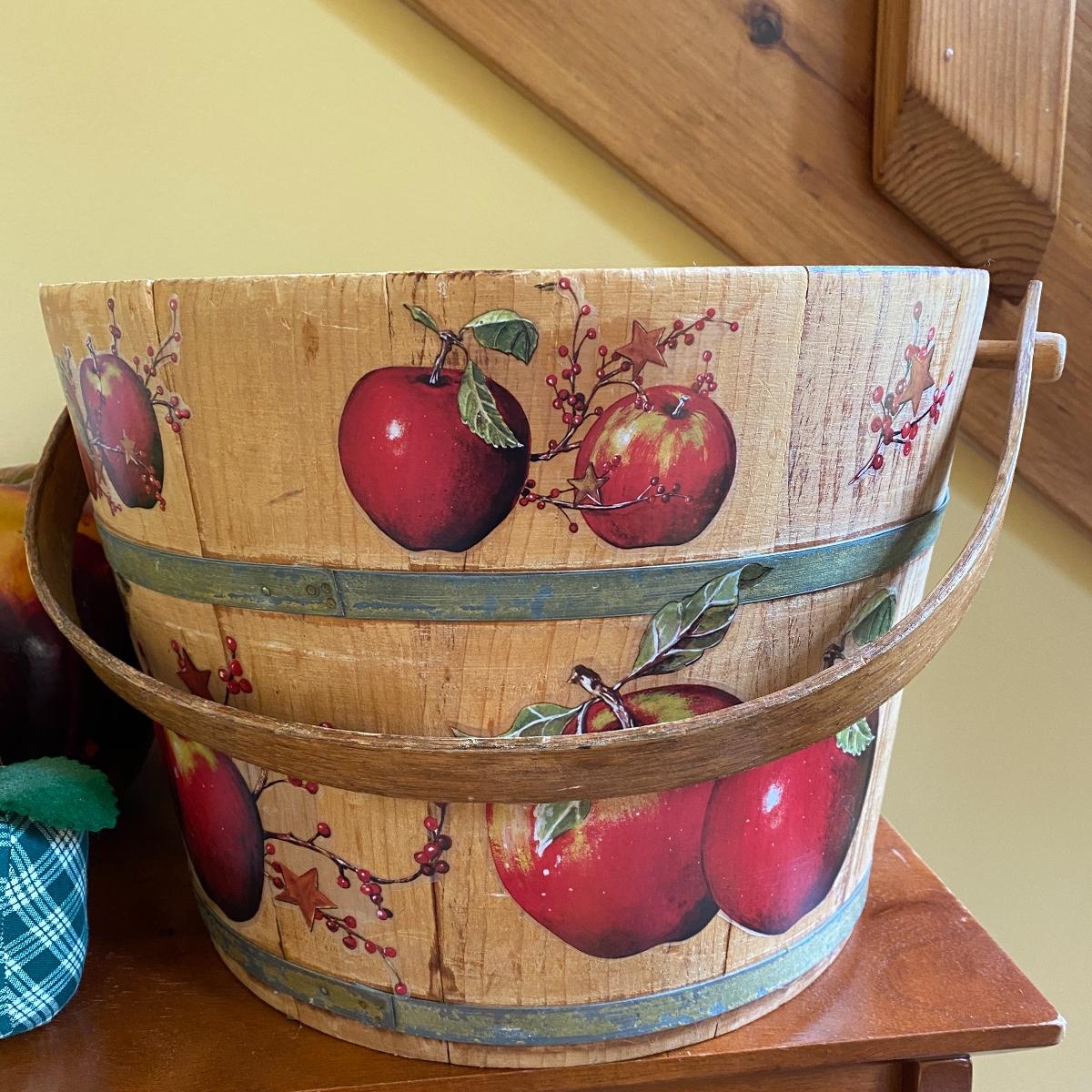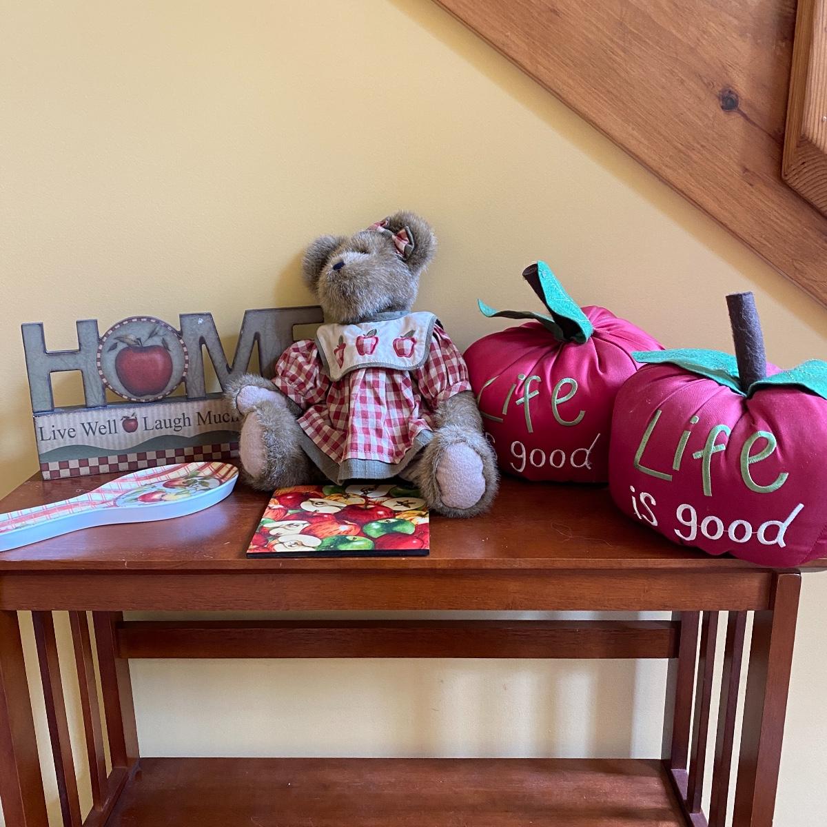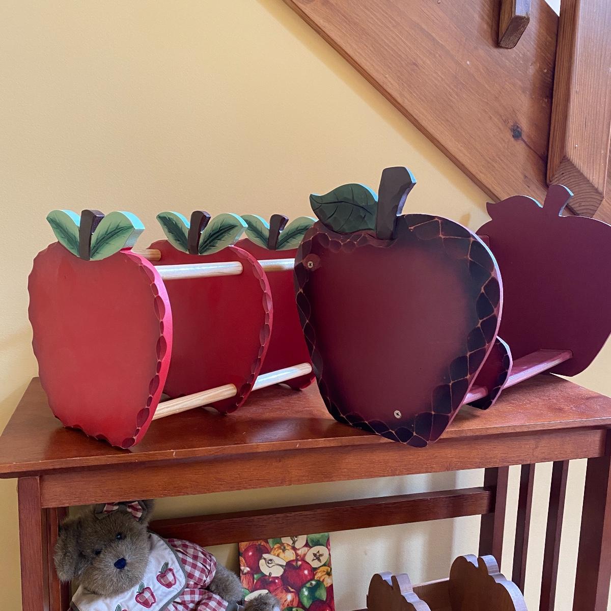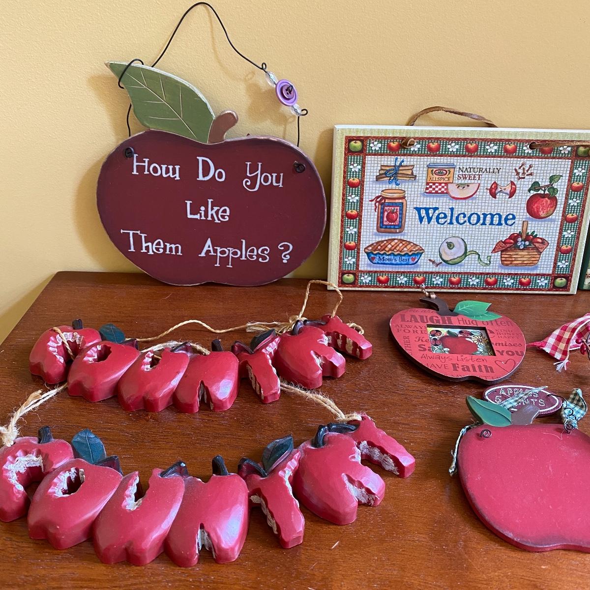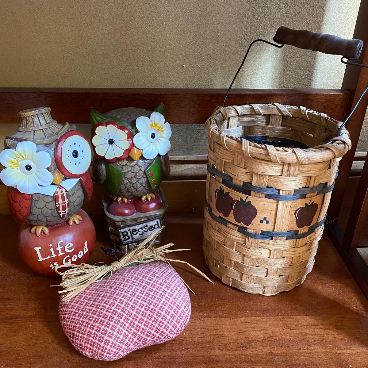 This is the heart of apple country and this lot has all you need to satisfy your cravings. There are apple baskets, art work, stool, plates, storage racks, and signs all with apple motifs. There is a stuffed Boyds bear in apple clothing, several apples made out of ceramics, wood and cloth. There are also sparkly apples to fill your baskets and even an apple apron and an apple blanket. This great lot has fun gifts or just fun decor for your home. Shelving not included. (Tall Shelf is in lot 141.) Large wooden basket with apple motif measures 15”diameter by 9.5” tall. Stool measures 12” square by 10” tall. Largest framed art is by Bob Timberlake and measures 26.5” x 22.5”. Please note that second picture in three picture frame has slid down. See pix. Local pick up only. Clear bin included to help you transport your items.