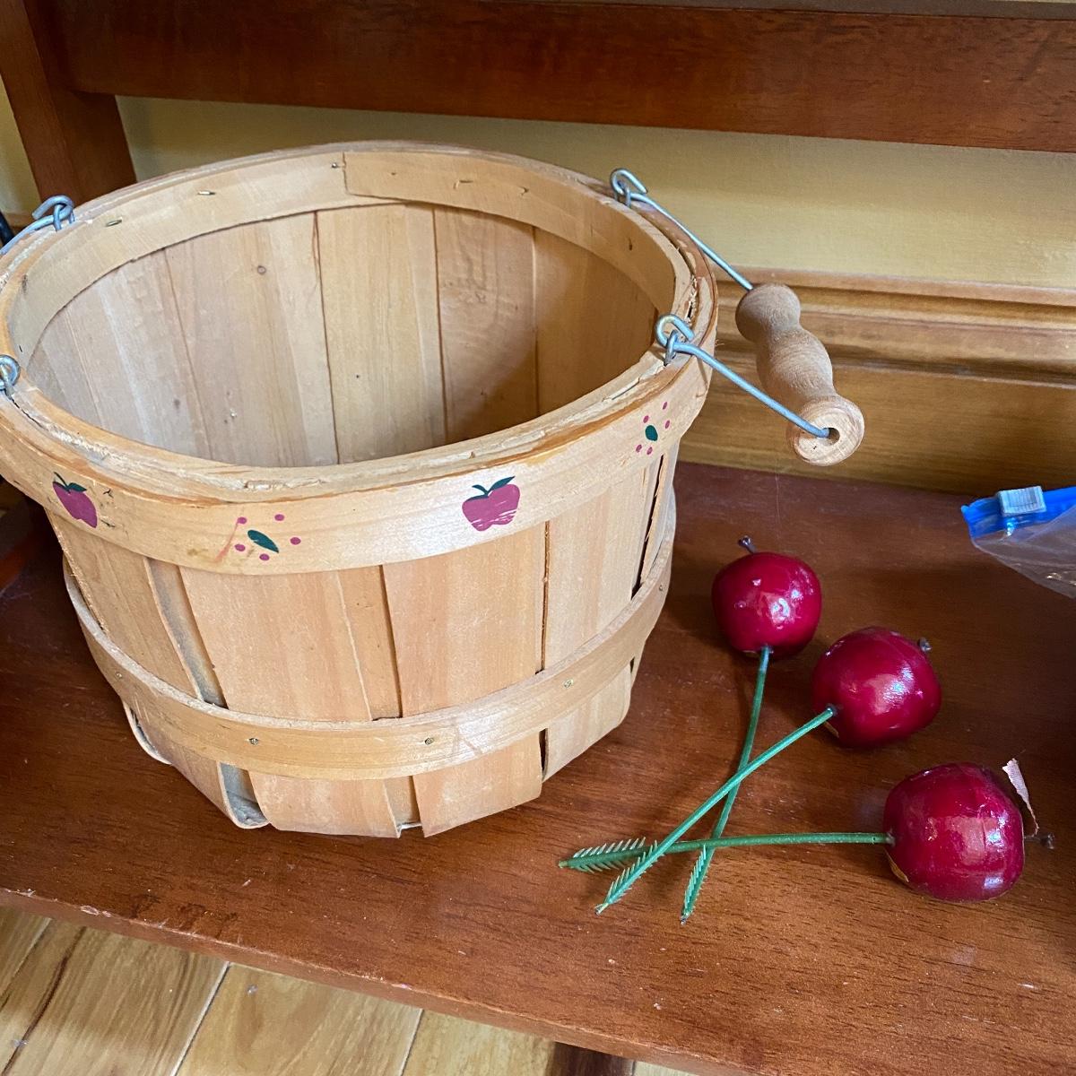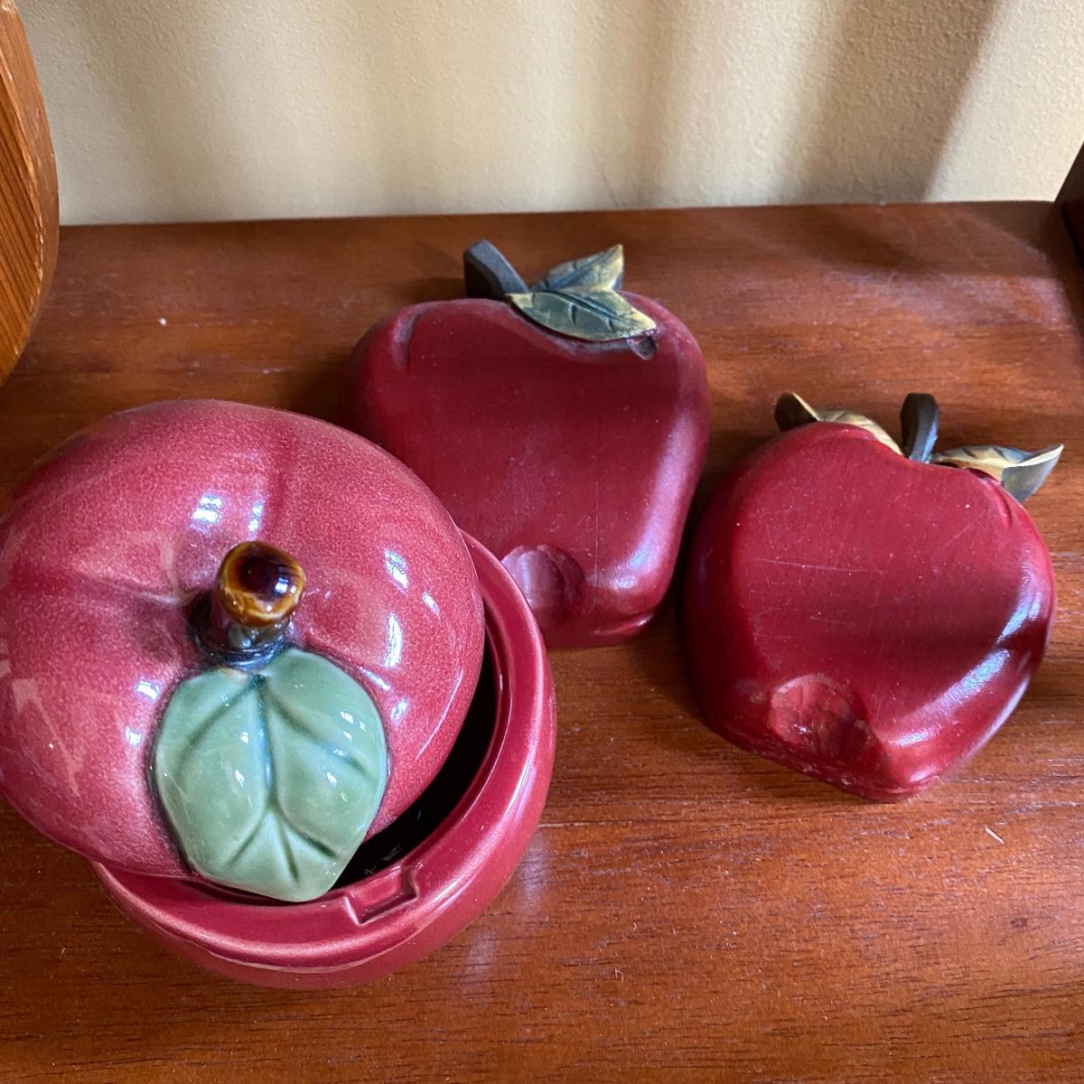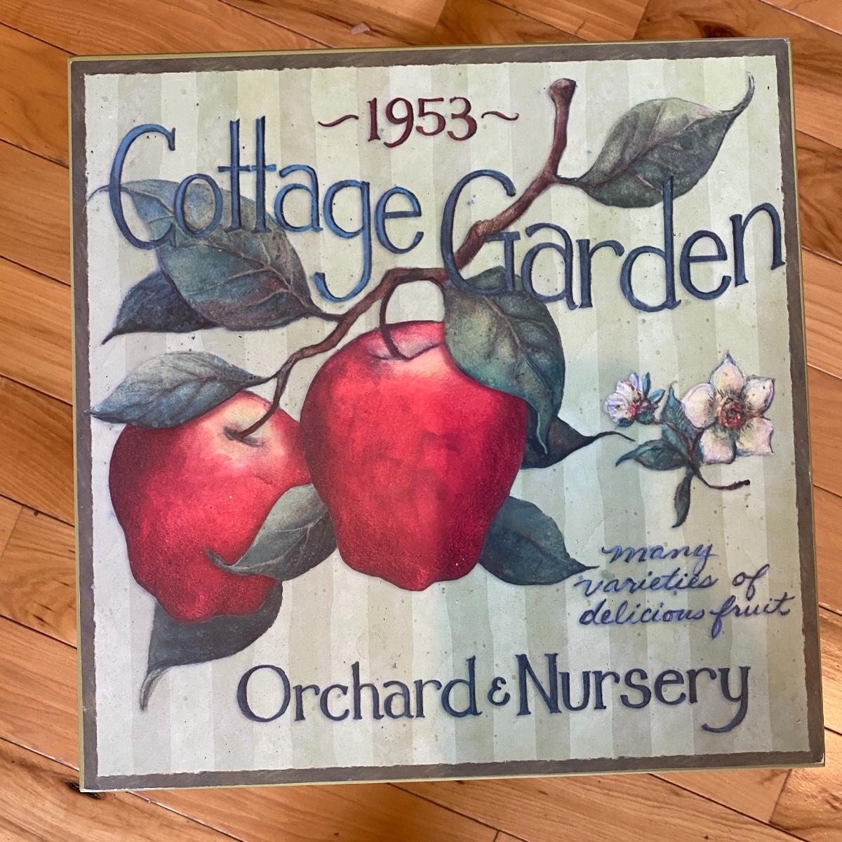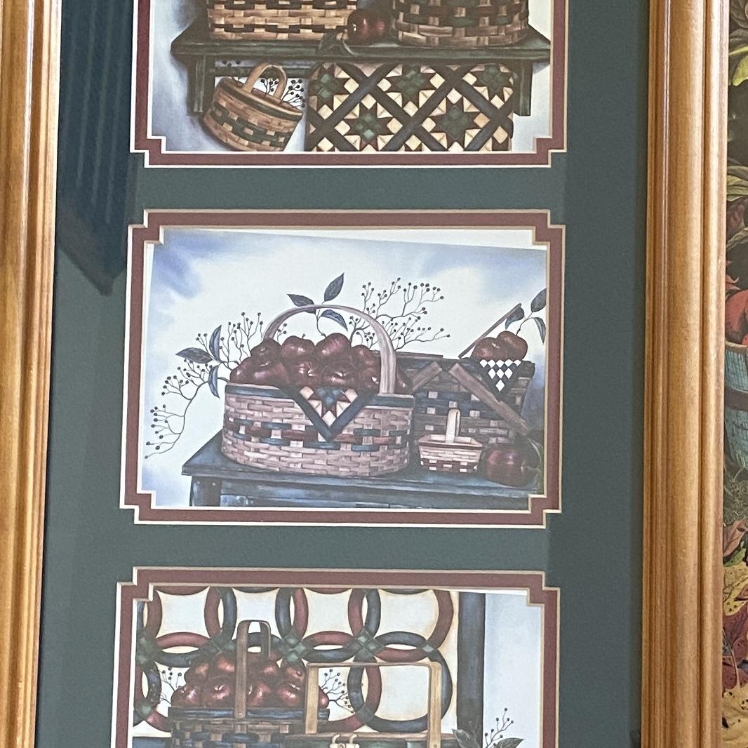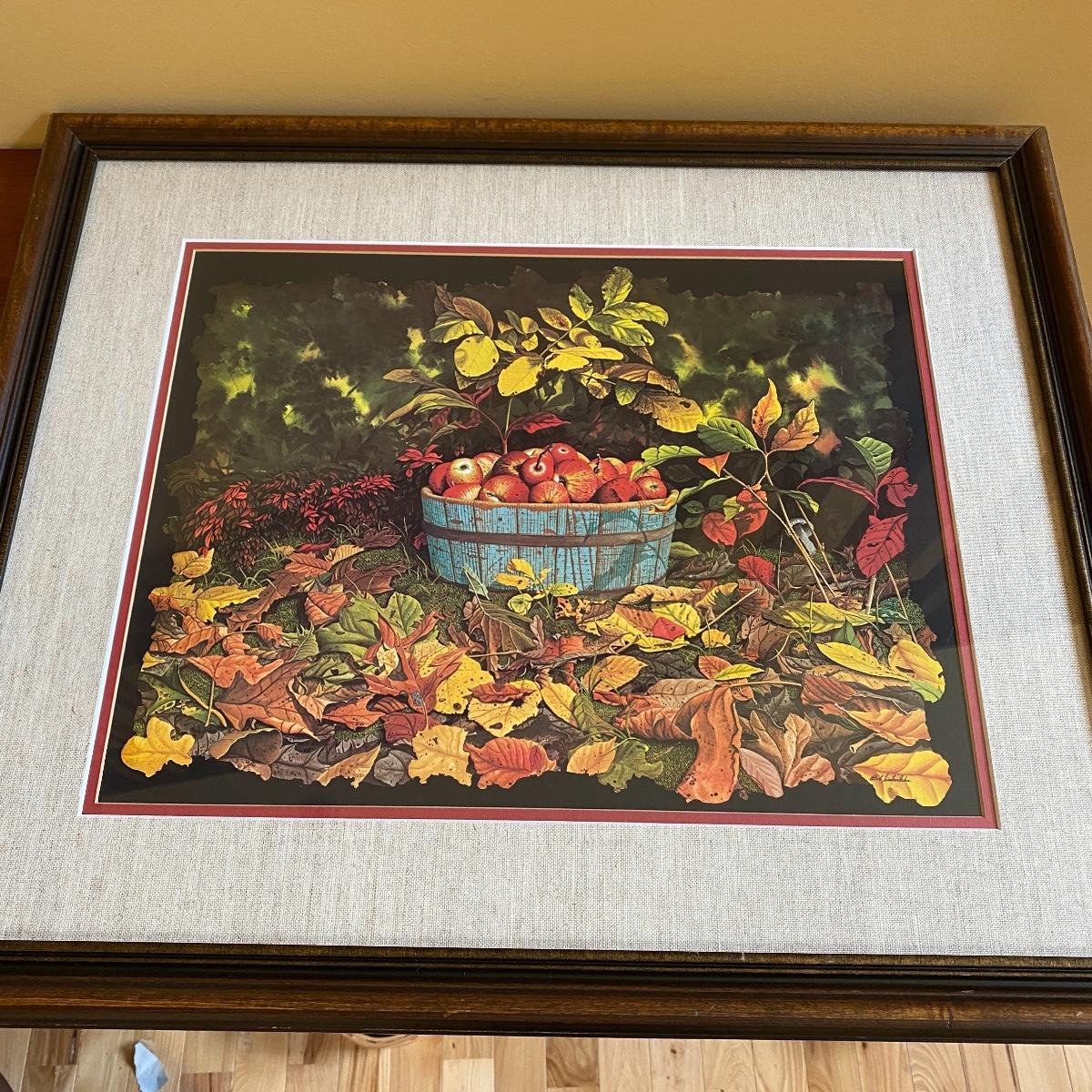 This is the heart of apple country and this lot has all you need to satisfy your cravings. There are apple baskets, art work, stool, plates, storage racks, and signs all with apple motifs. There is a stuffed Boyds bear in apple clothing, several apples made out of ceramics, wood and cloth. There are also sparkly apples to fill your baskets and even an apple apron and an apple blanket. This great lot has fun gifts or just fun decor for your home. Shelving not included. (Tall Shelf is in lot 141.) Large wooden basket with apple motif measures 15”diameter by 9.5” tall. Stool measures 12” square by 10” tall. Largest framed art is by Bob Timberlake and measures 26.5” x 22.5”. Please note that second picture in three picture frame has slid down. See pix. Local pick up only. Clear bin included to help you transport your items.