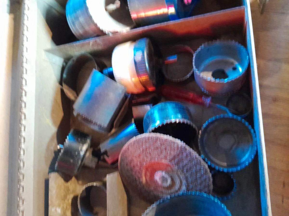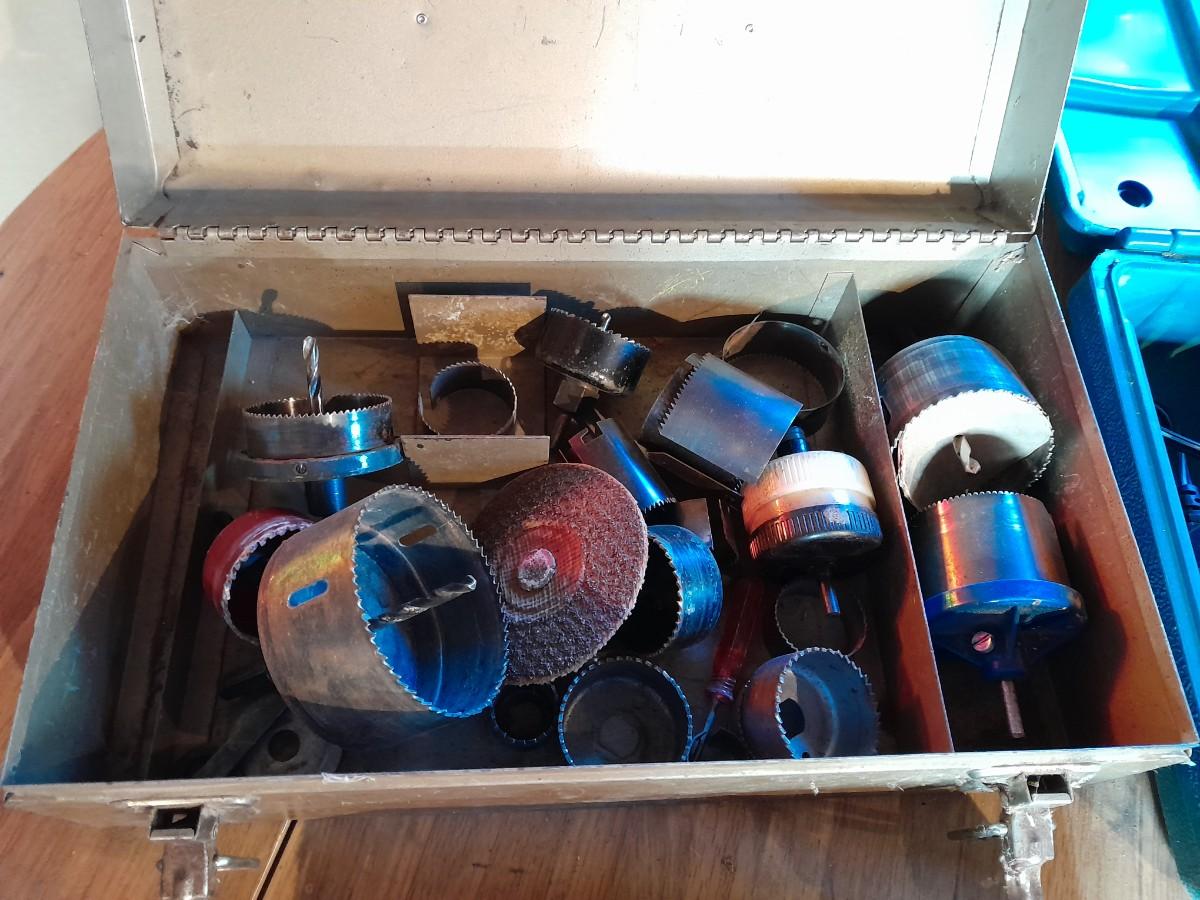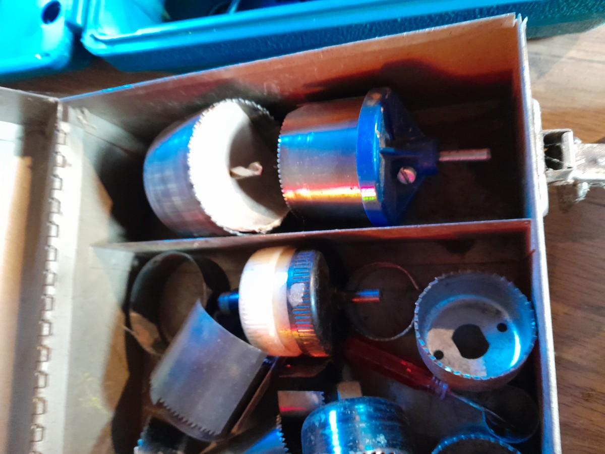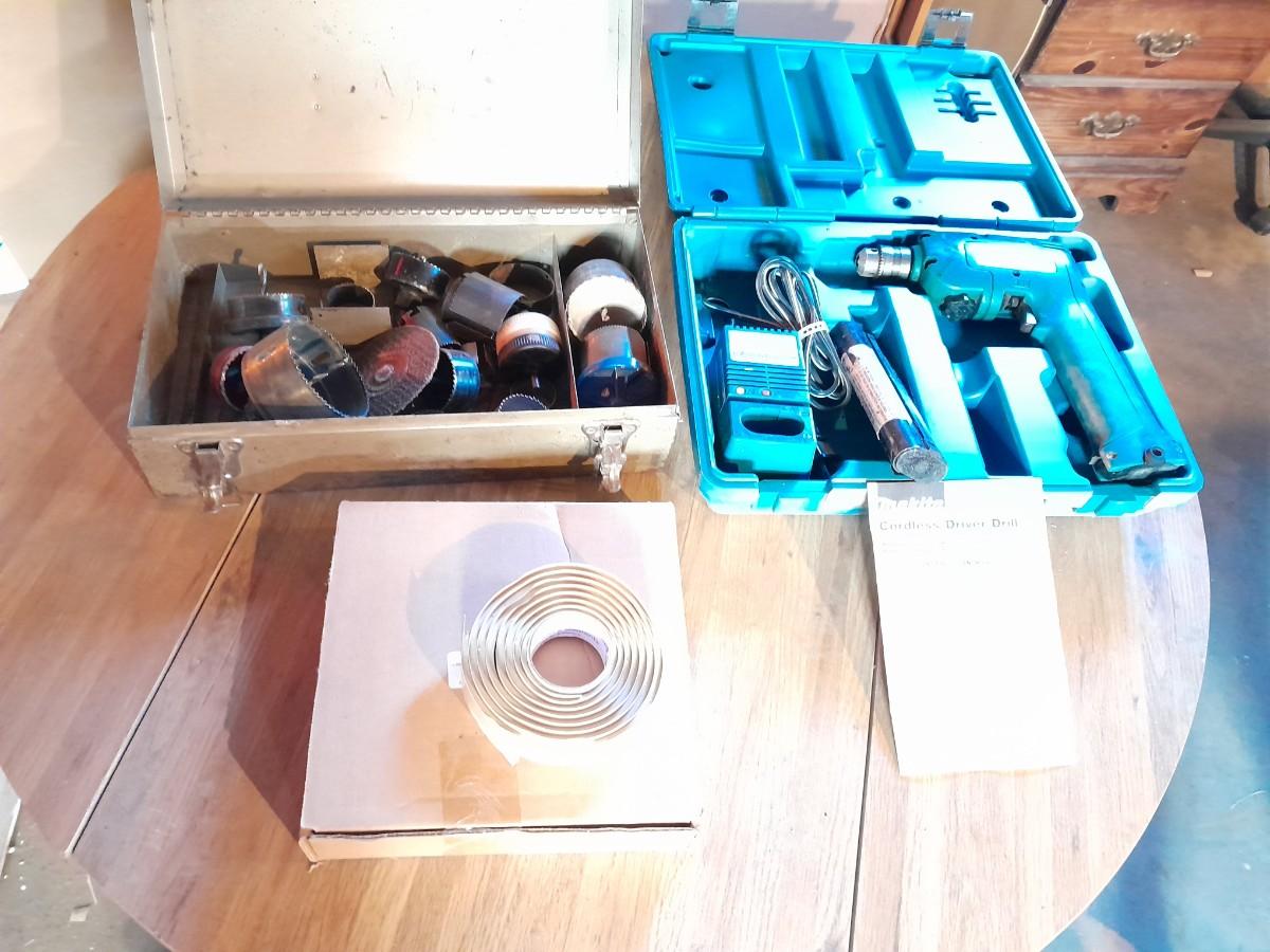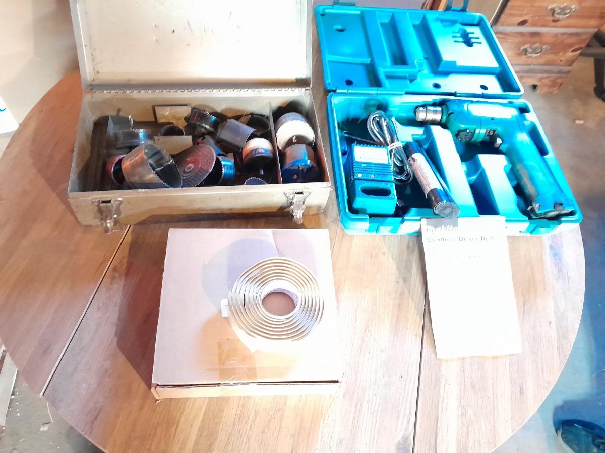 MAKITA CORDLESS DRIVEN DRILL AND BATTERY WITH CHARGER AND A MOLDED CASE AND A METAL BOX WITH HOLE SAW BITS.
