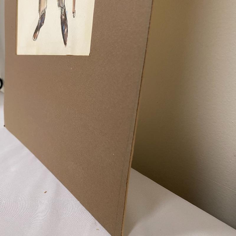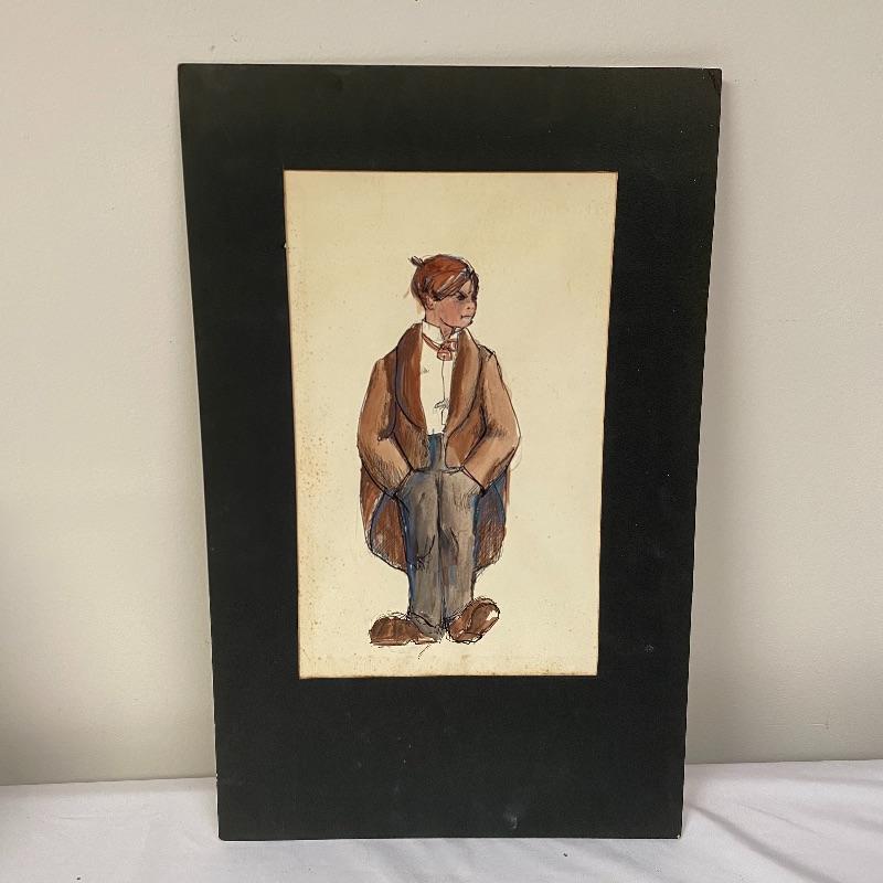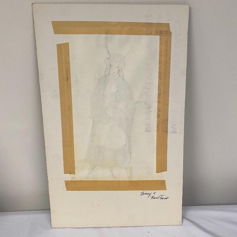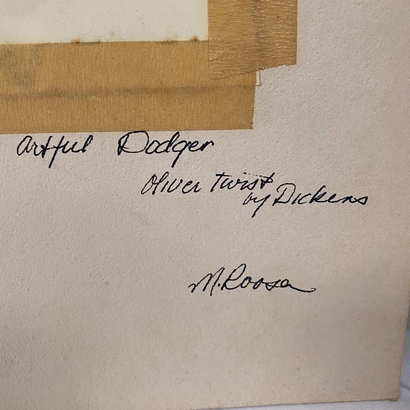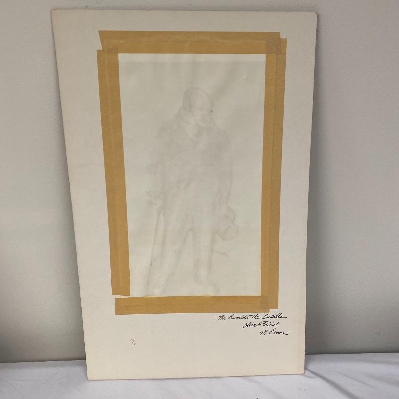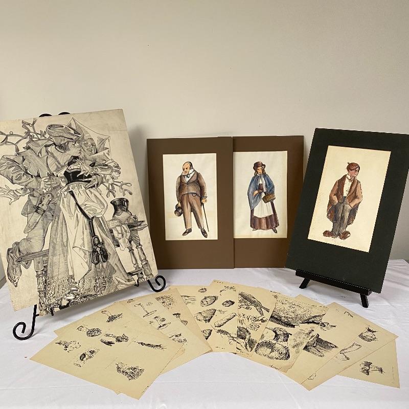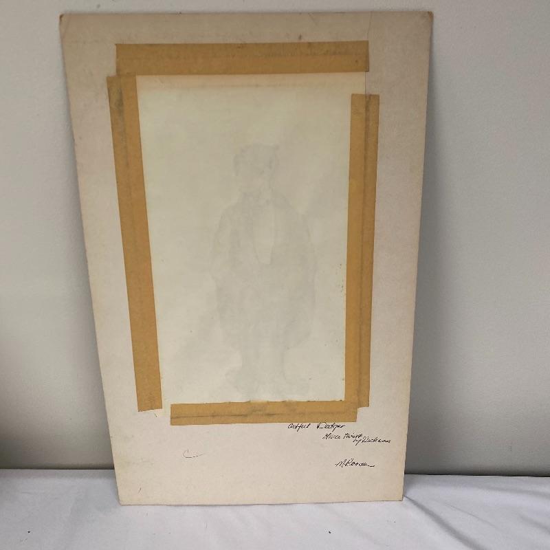 This lot includes three 20in x 13in matted pen drawings of people, one large 23.5in x 18in pen drawing on a board, and 10 pen designs on paper that measure about 15in x 9in. The large board piece has a signature in pencil and a chunk missing from the side (see pictures). Signature reads J Fredrick. The three matted drawings of Oliver Twist characters have writing on the back that appear to be signed M. Roosa. The drawings on paper all have signatures which read M.F Wrench.