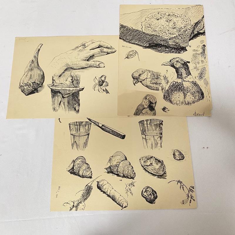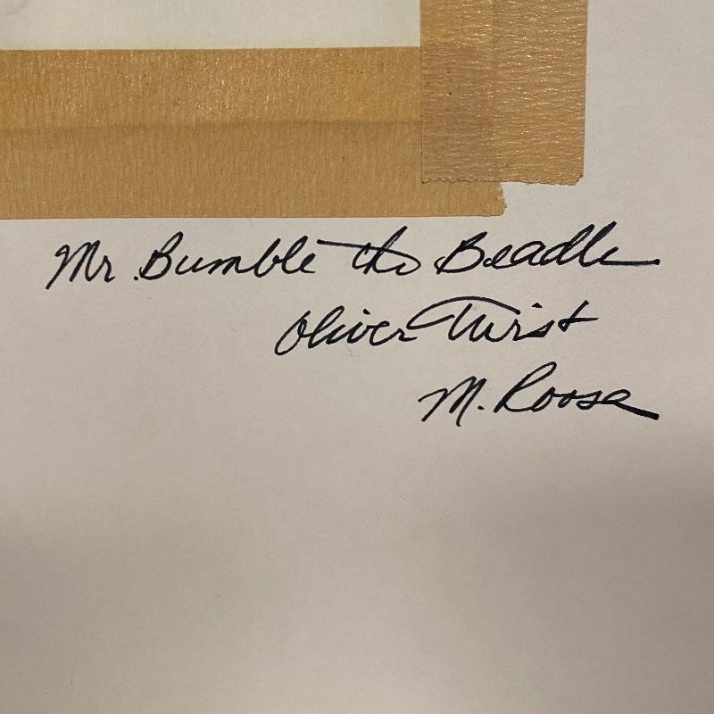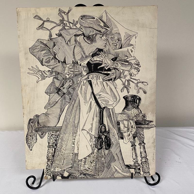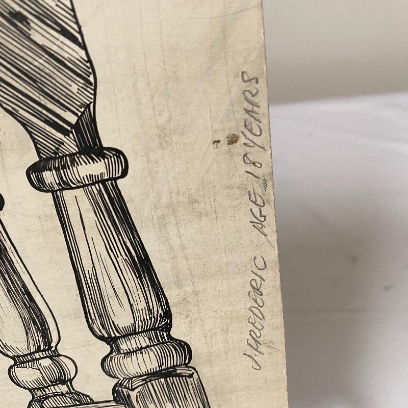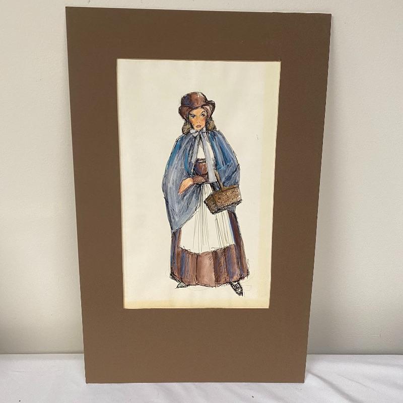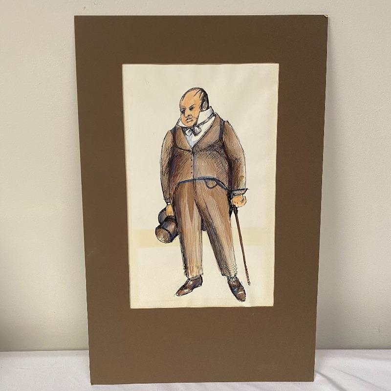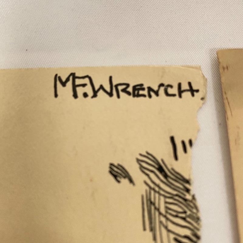 This lot includes three 20in x 13in matted pen drawings of people, one large 23.5in x 18in pen drawing on a board, and 10 pen designs on paper that measure about 15in x 9in. The large board piece has a signature in pencil and a chunk missing from the side (see pictures). Signature reads J Fredrick. The three matted drawings of Oliver Twist characters have writing on the back that appear to be signed M. Roosa. The drawings on paper all have signatures which read M.F Wrench.