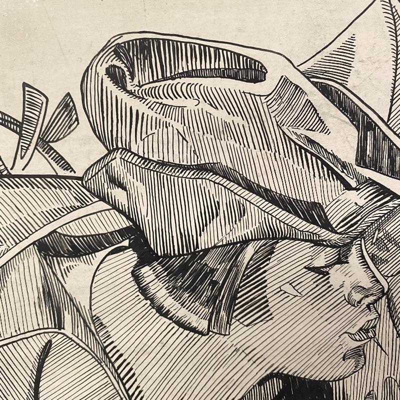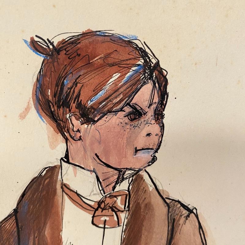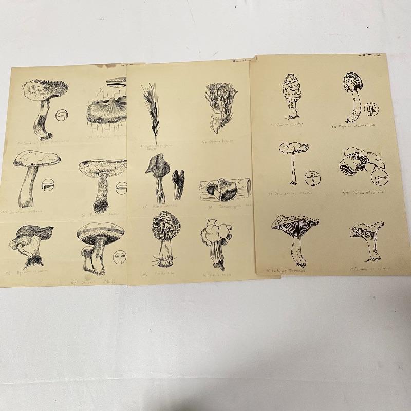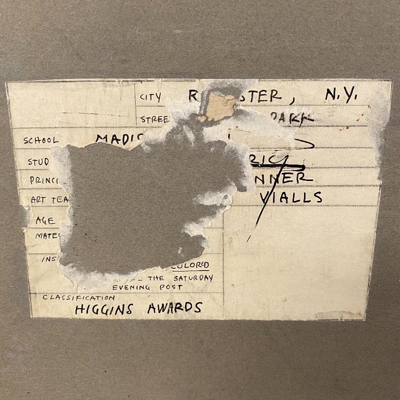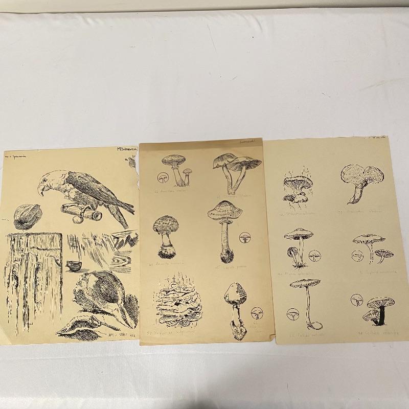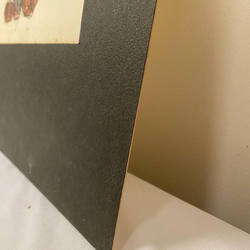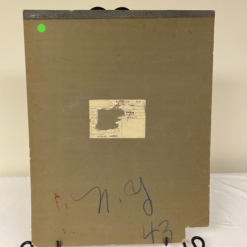 This lot includes three 20in x 13in matted pen drawings of people, one large 23.5in x 18in pen drawing on a board, and 10 pen designs on paper that measure about 15in x 9in. The large board piece has a signature in pencil and a chunk missing from the side (see pictures). Signature reads J Fredrick. The three matted drawings of Oliver Twist characters have writing on the back that appear to be signed M. Roosa. The drawings on paper all have signatures which read M.F Wrench.