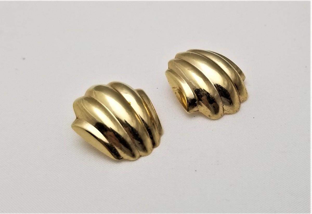 These clip earrings are marked and tested 14kt gold. Light weight on the ears. Good condition - shell motif. Each measures about .75" tall. The opening bid is the scrap price.