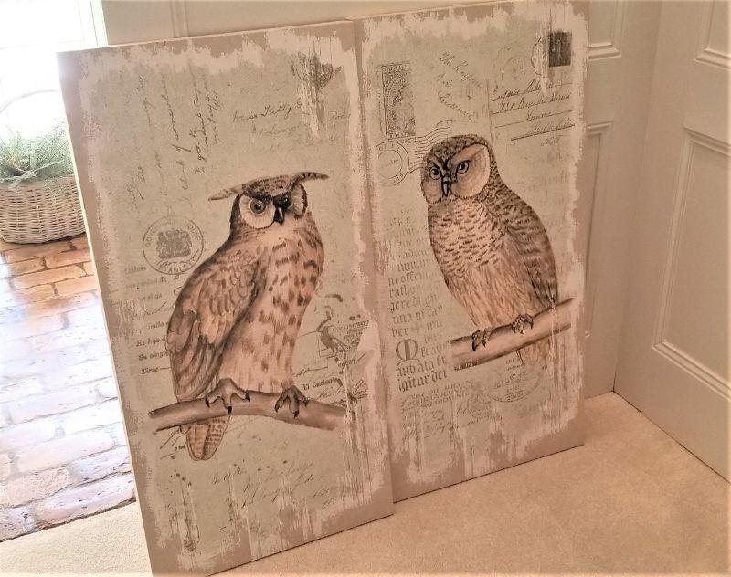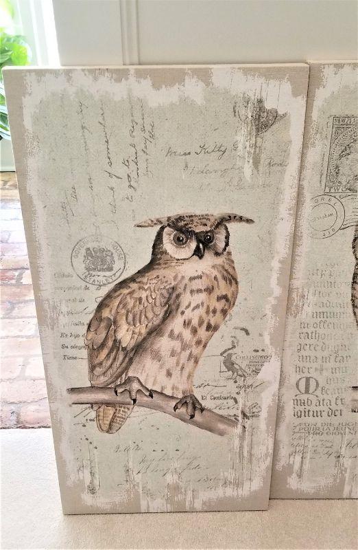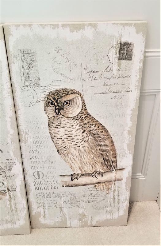 Pair of Contemporary Owl prints on canvas. 20" across, 39.5" tall, 1.5" thick. Good condition.