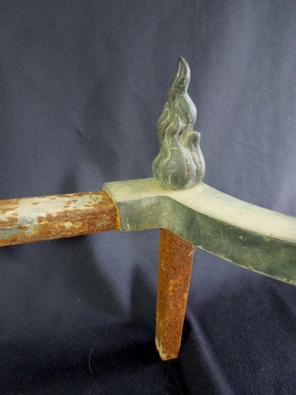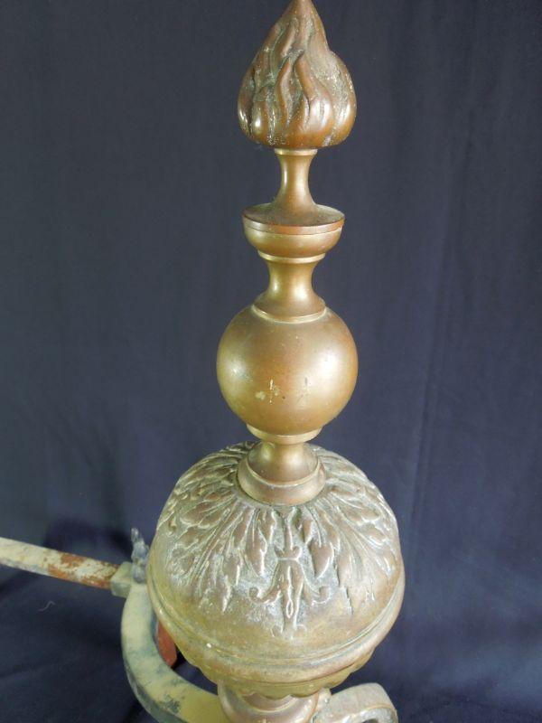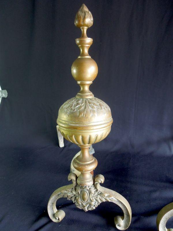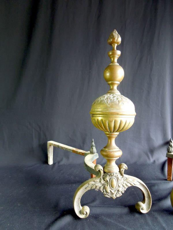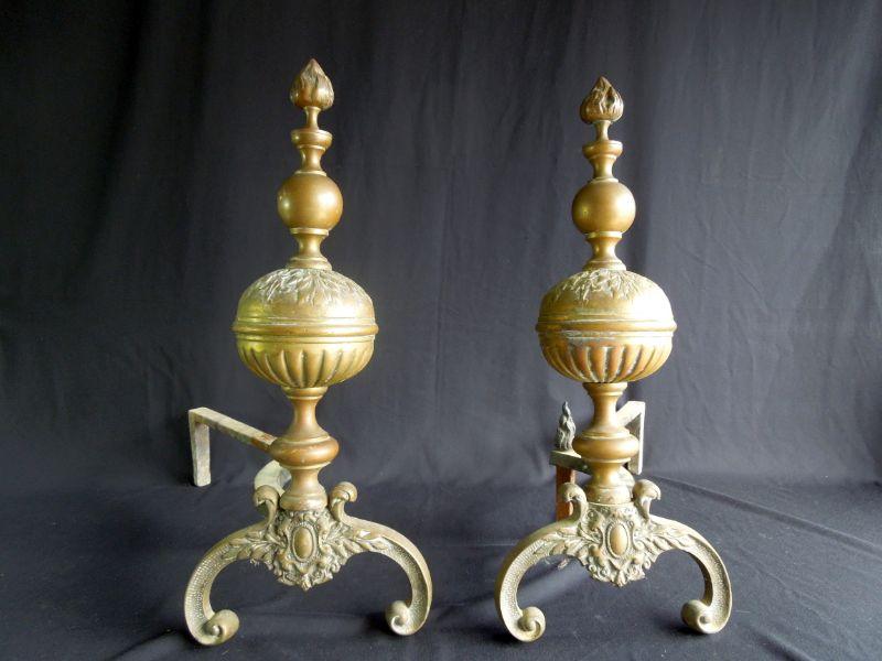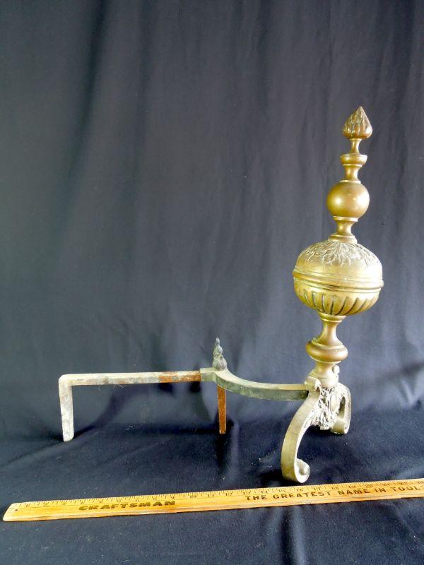 Beuatiful set of antiqye Victorian era brass andirons. 21" L x 22" H. These are wobbly and need tightening. Orbs are hollow and the rest is solid brass. Stunning with nice patina.