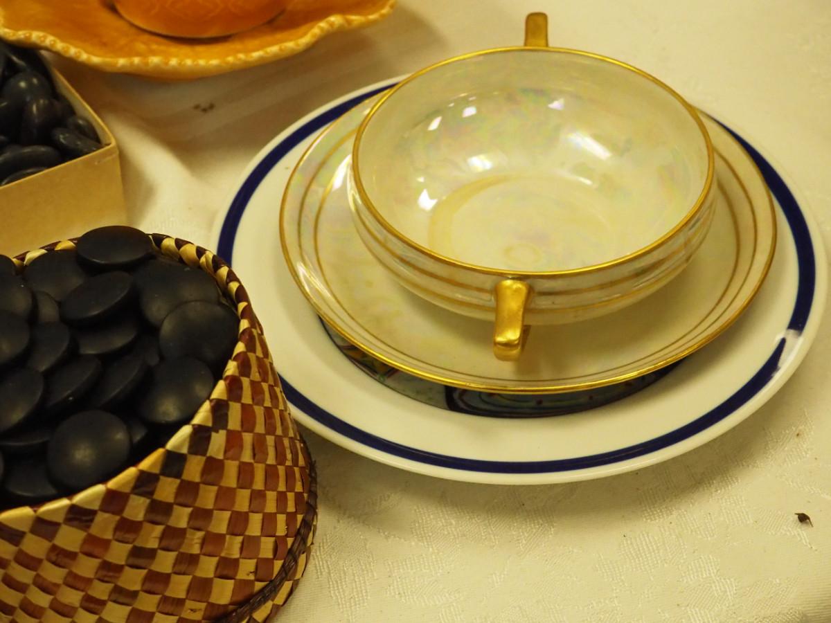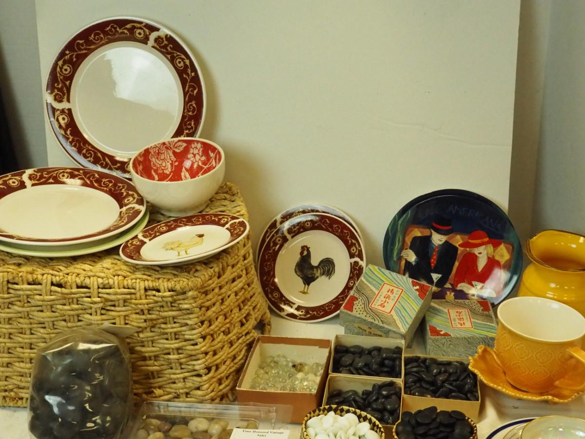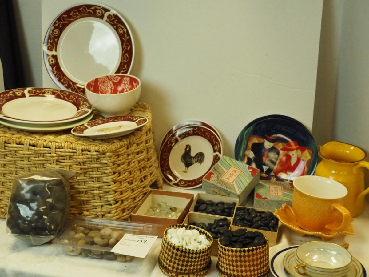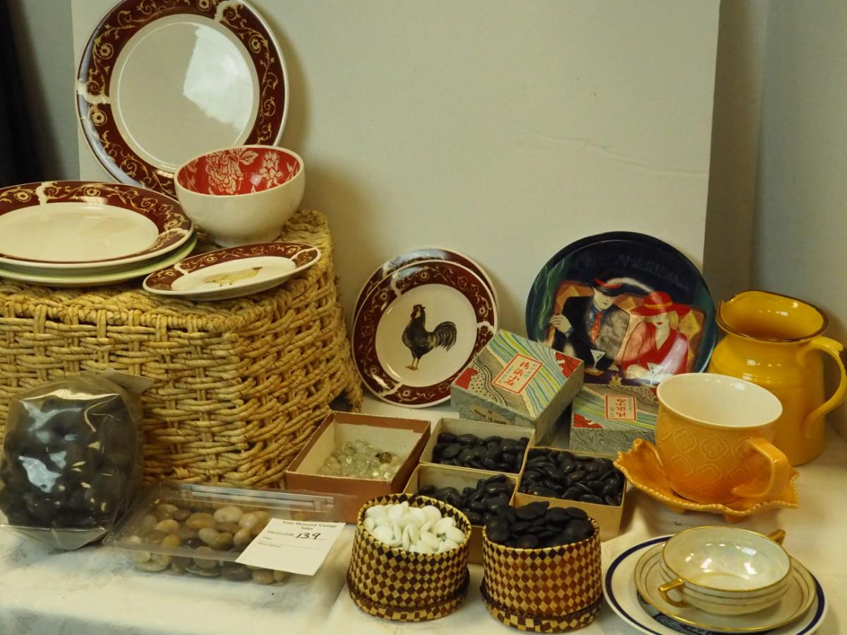 Lot 139: Raffia basket, vintage white and black stones small to large, glass marbles, vintage plates, yellow ceramics, Paris scene plates, antique pottery.