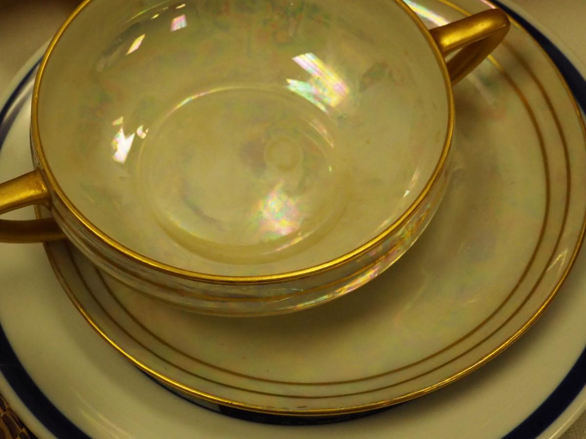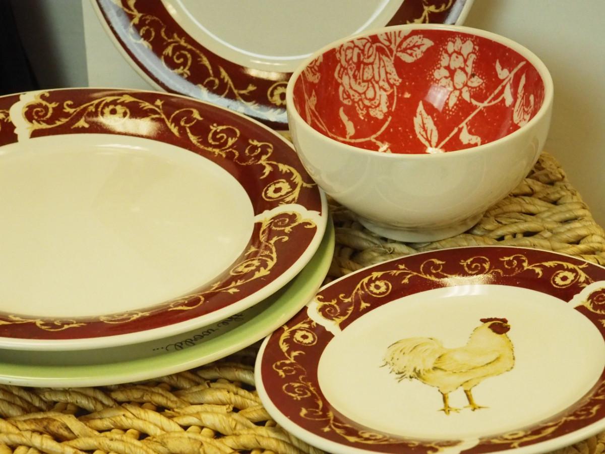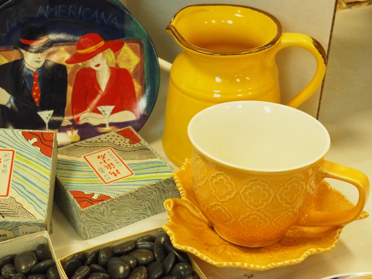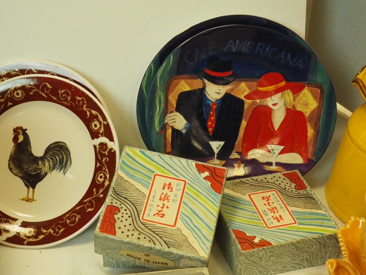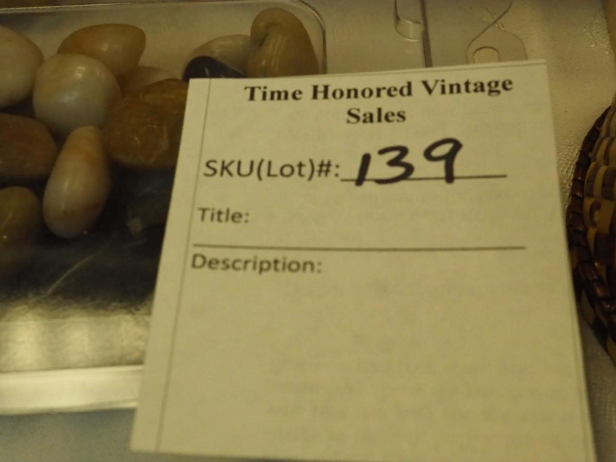 Lot 139: Raffia basket, vintage white and black stones small to large, glass marbles, vintage plates, yellow ceramics, Paris scene plates, antique pottery.
