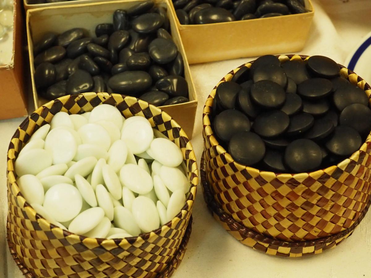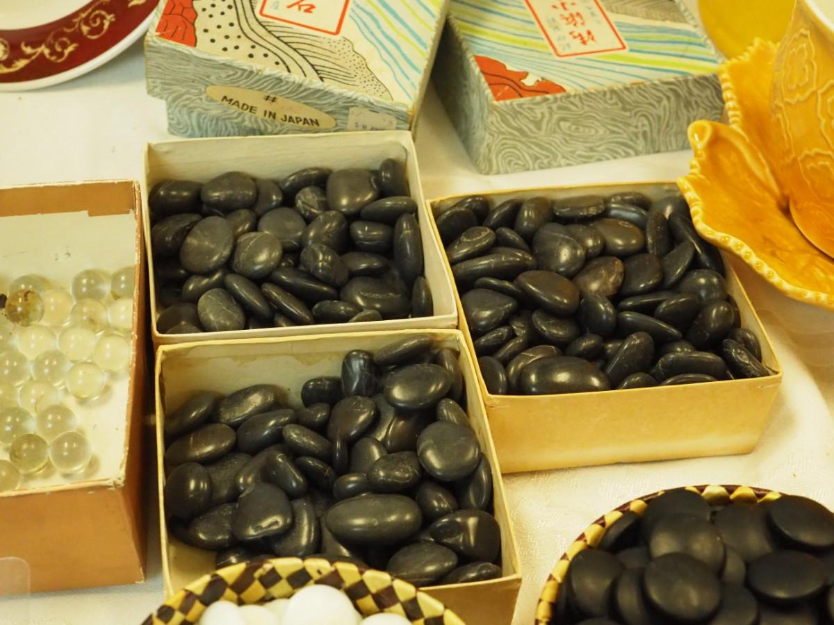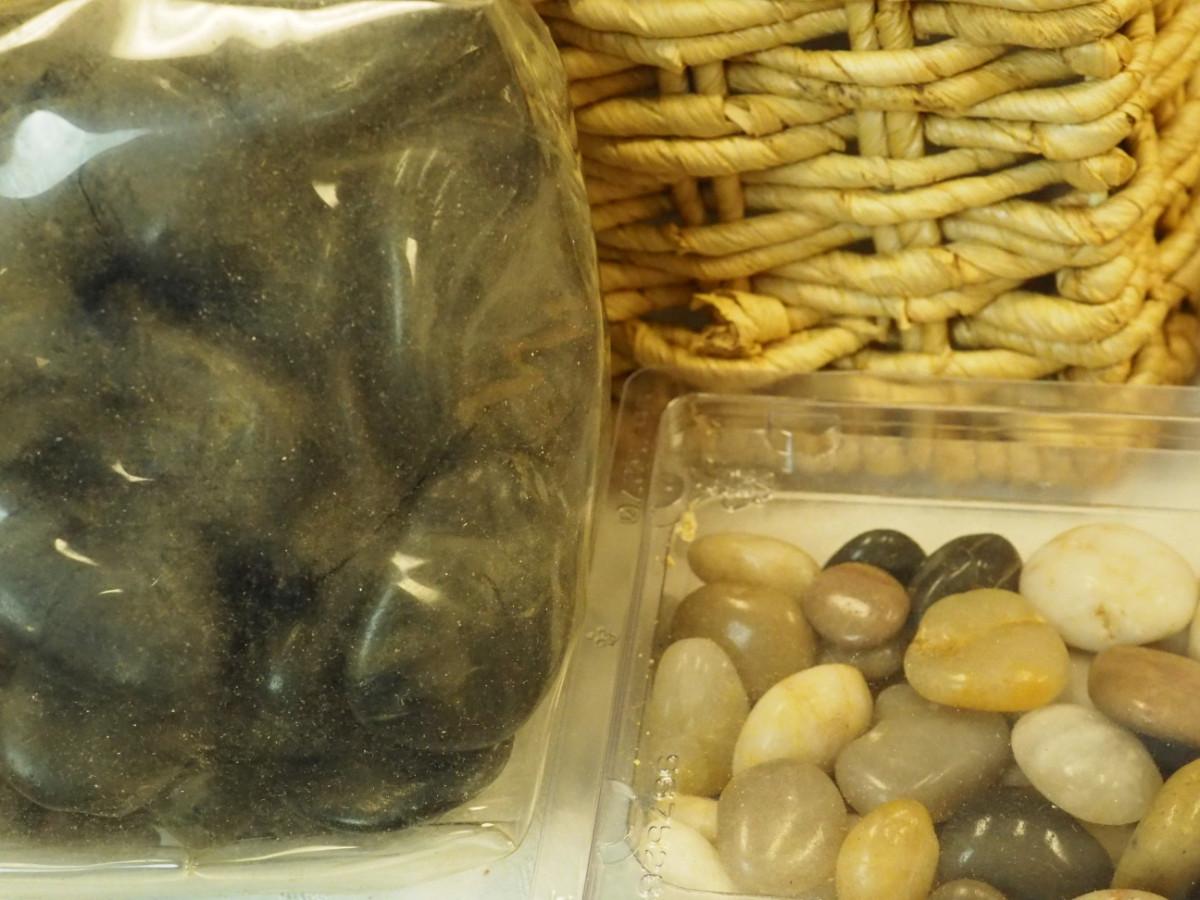 Lot 139- raffia basket, white and black stones, glass marbles, plates