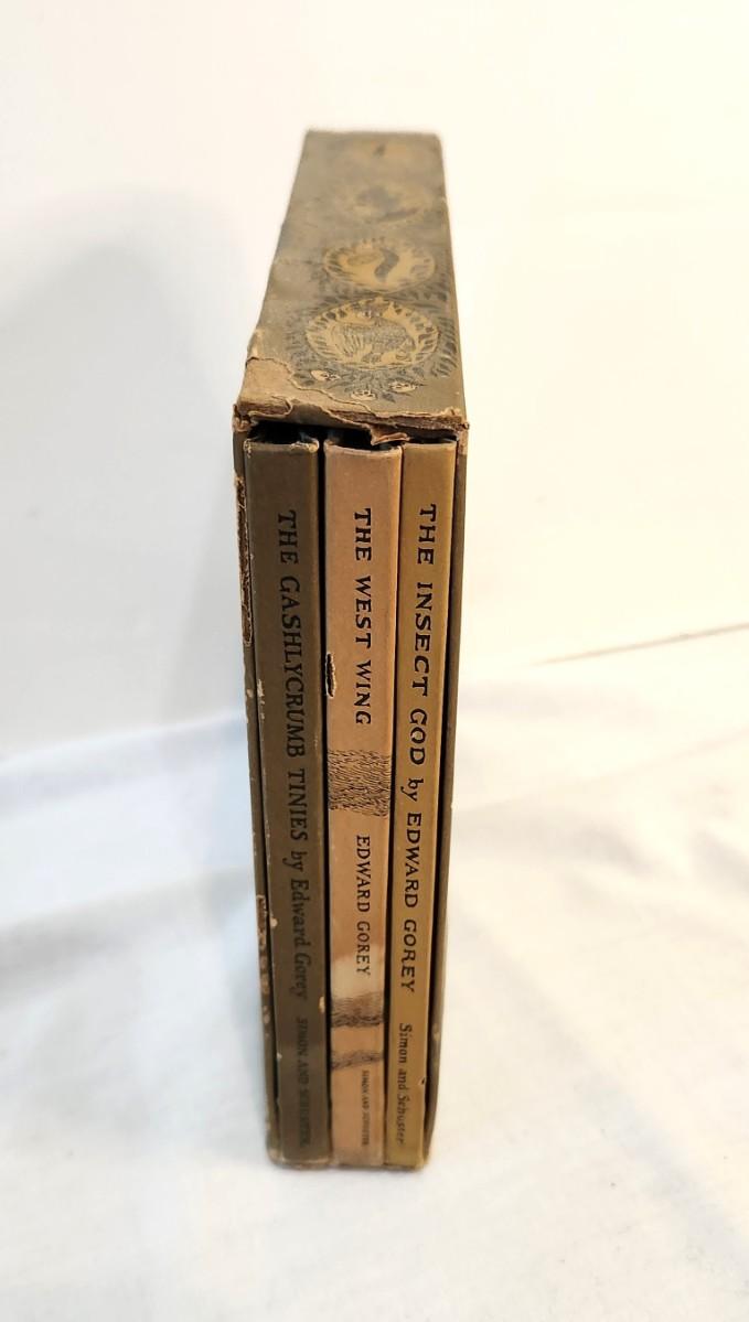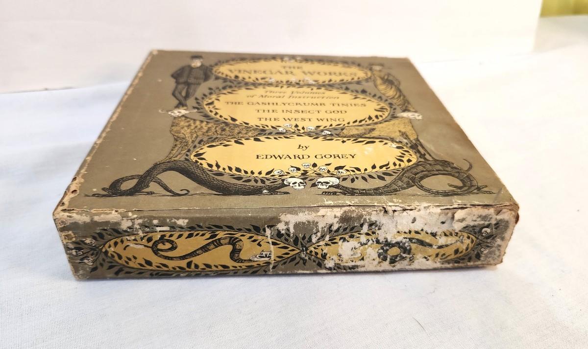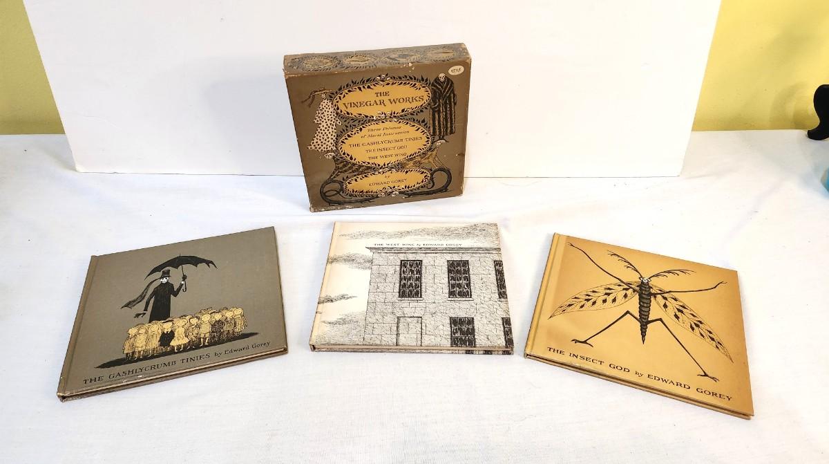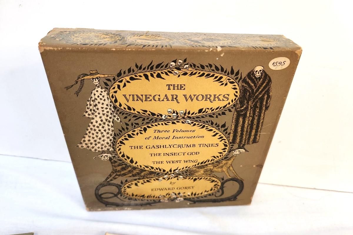 Scarce Slip cased set of The Vinegar Works by Edward Gorey - First Printing, 1963, Simon & Schuster. Macabre Alphabet book detailing the deaths of Victorian Children, a creepy book with rendering of The West Wing, and the saga of the Insect God. Very Good condition. In 14 years of doing this, this is the first copy I've seen of these books.