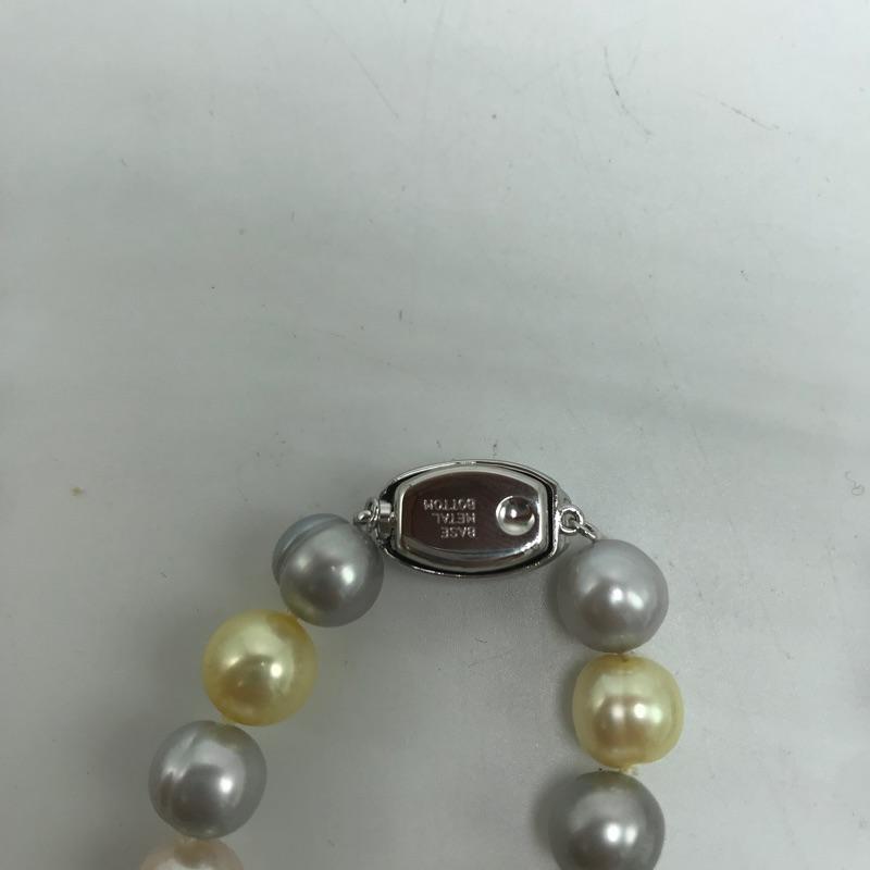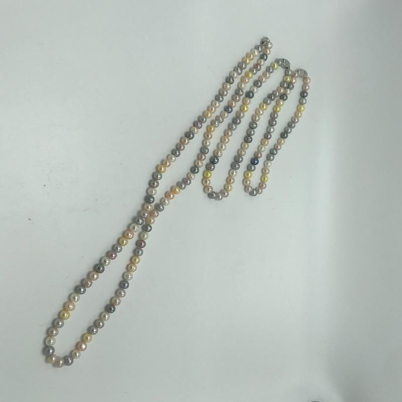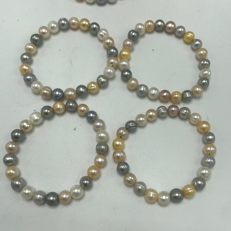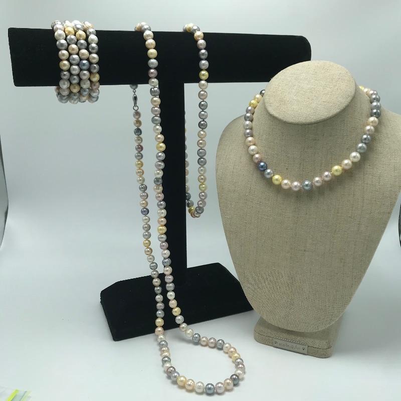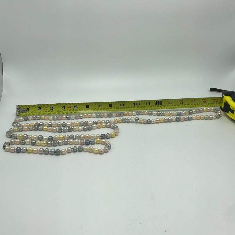 Seven pc collection of multicolored pearl like beads. We can not verify if authentic but pearls show natural striating lines adding class and character. Lot includes four stretch bracelets and three necklaces. Two necklaces are almost identical, one is slightly longer, both have metal button clasps marked 925. The other necklace has a lobster clasp also marked 925.
