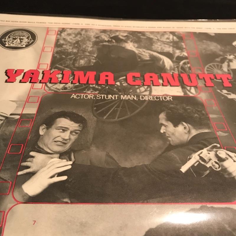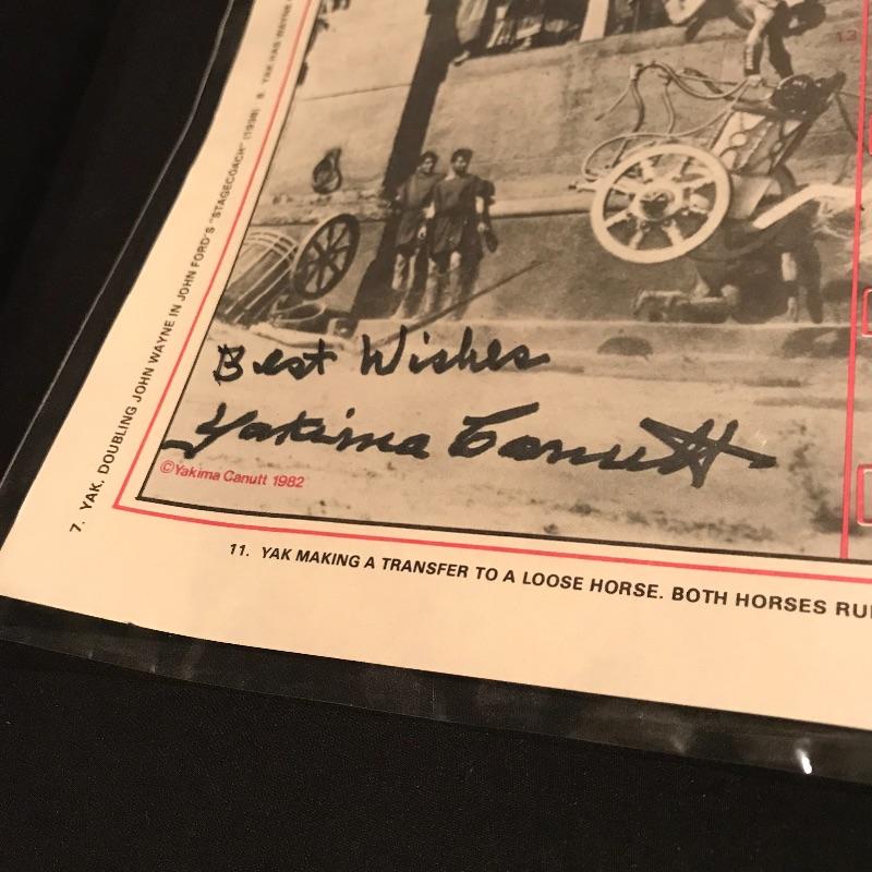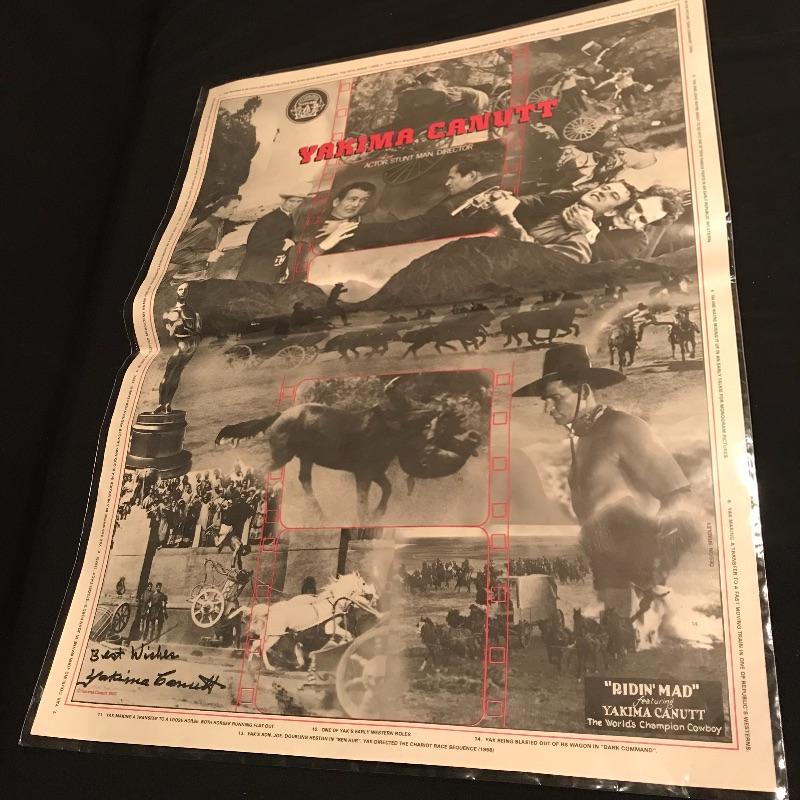 Still in plastic, multiple movie poster signed “Best Wishes Yakima Canutt”. Poster boasts “Actor, Stunt Man, Director” and has multiple scenes with fourteen corresponding movie titles along the border. Poster has an even crease along the middle and measures approximately 18” x 24”. No COA. Shipping available.