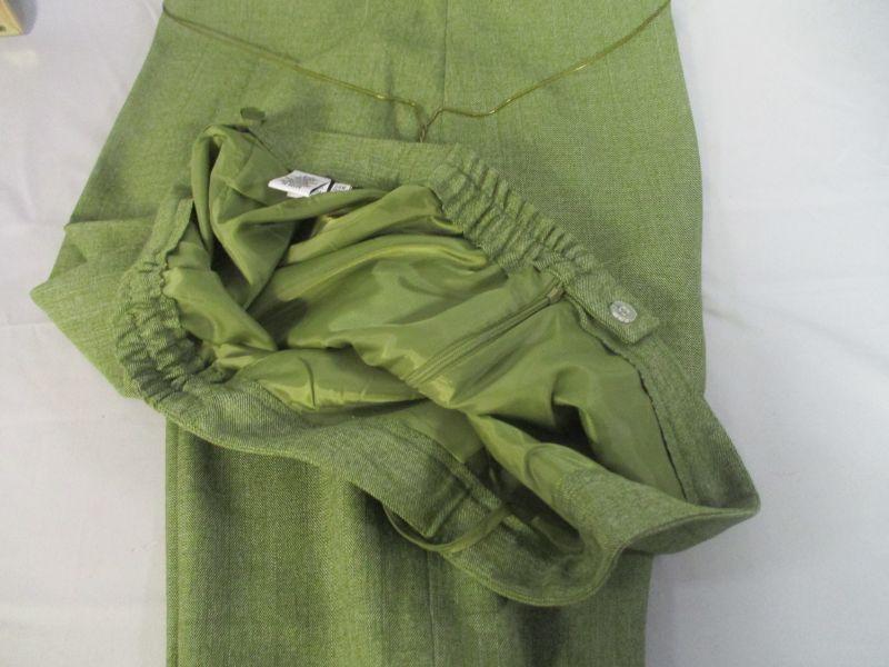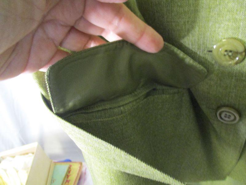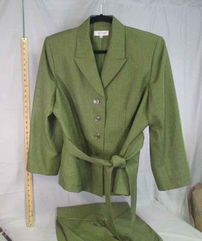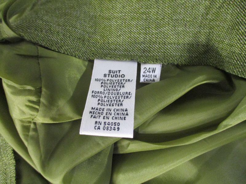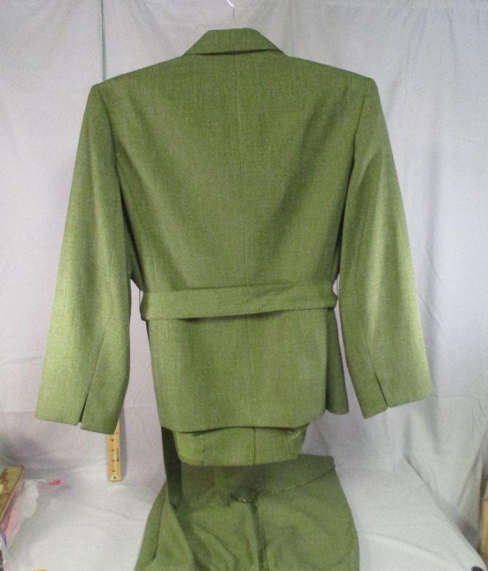 This suit doesn't have the tags, but it shows no signs of being worn. It is 100% Polyester and is Dry Clean Only. There are fully functioning pockets on the front and the pants have a side zipper. The belt is a nice touch to add some shape to outfit.