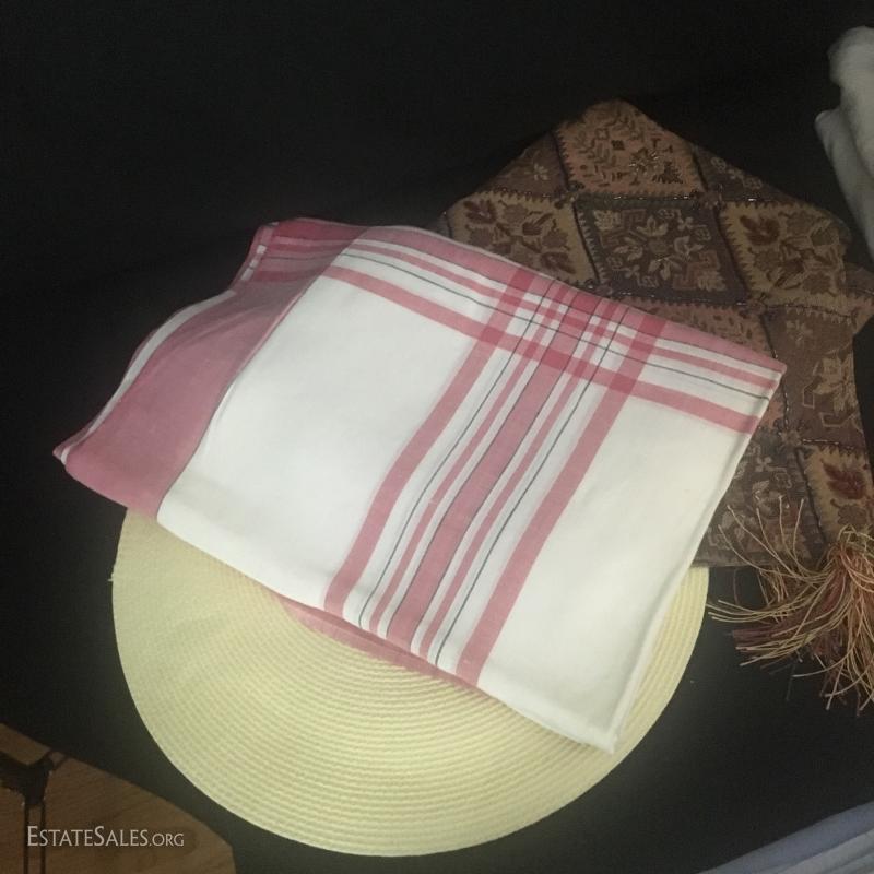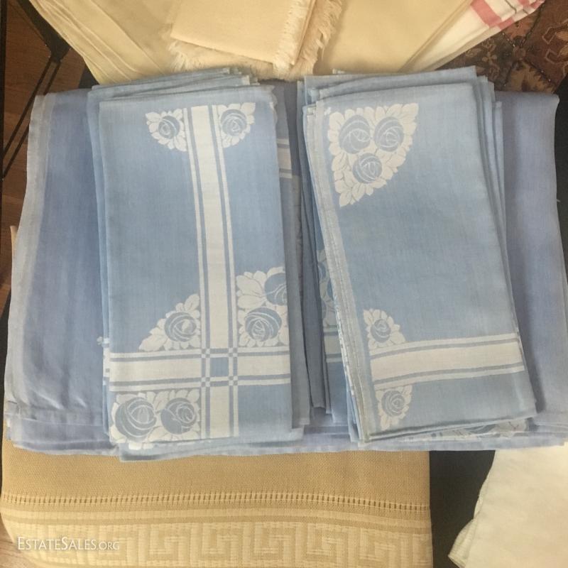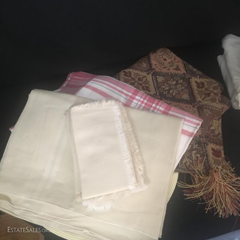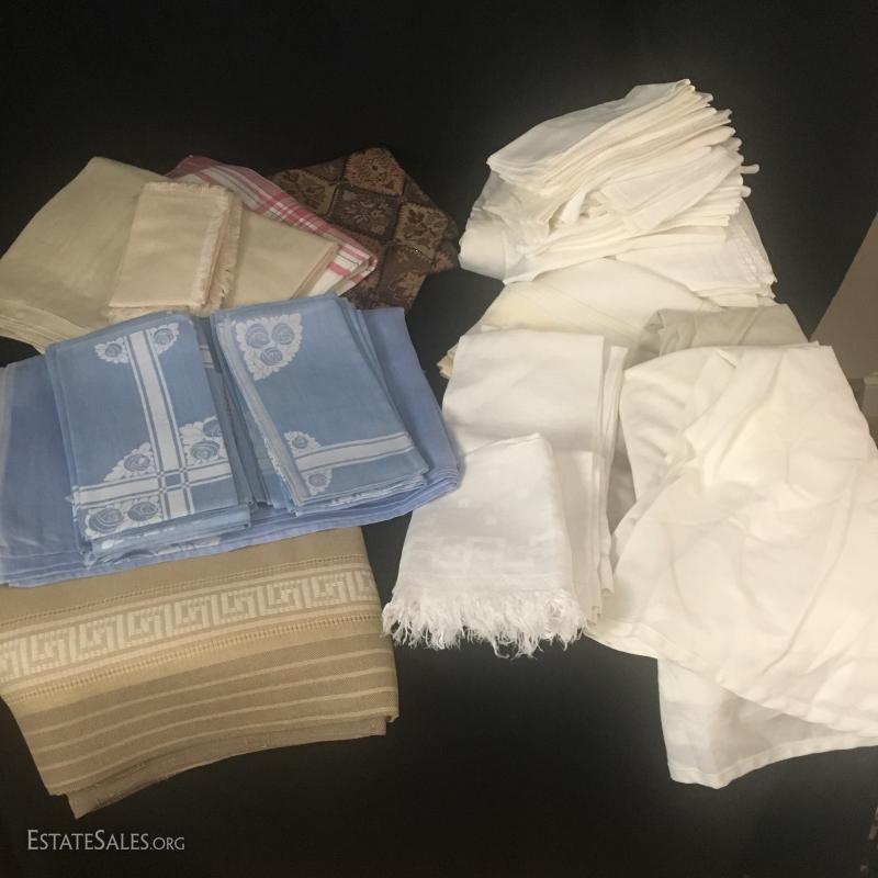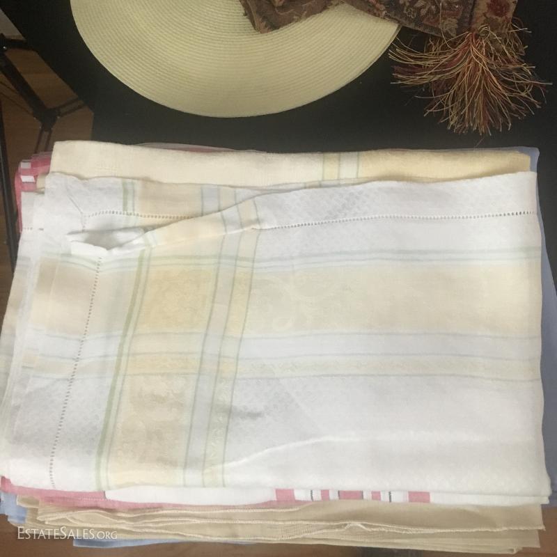Small round table cloths, larger square and rectangle table cloths, and napkins. Fabrics in Cotton, polyester and more. One dark runner and a set of cream colored place mats. This lot is available for local pick up in Asheville, NC.