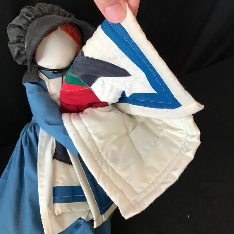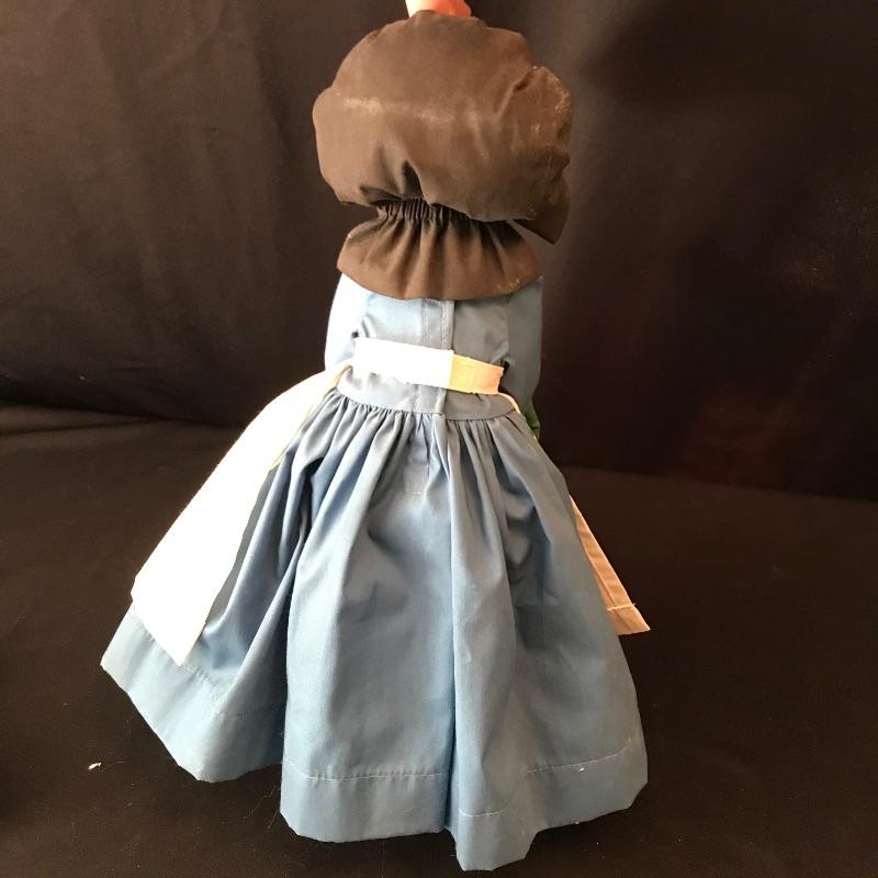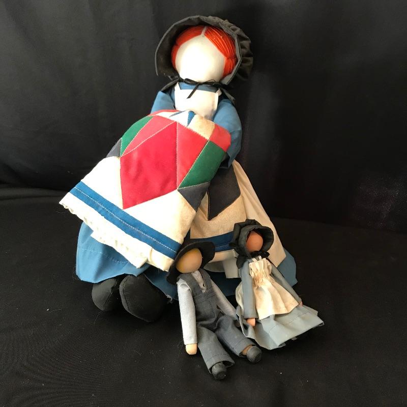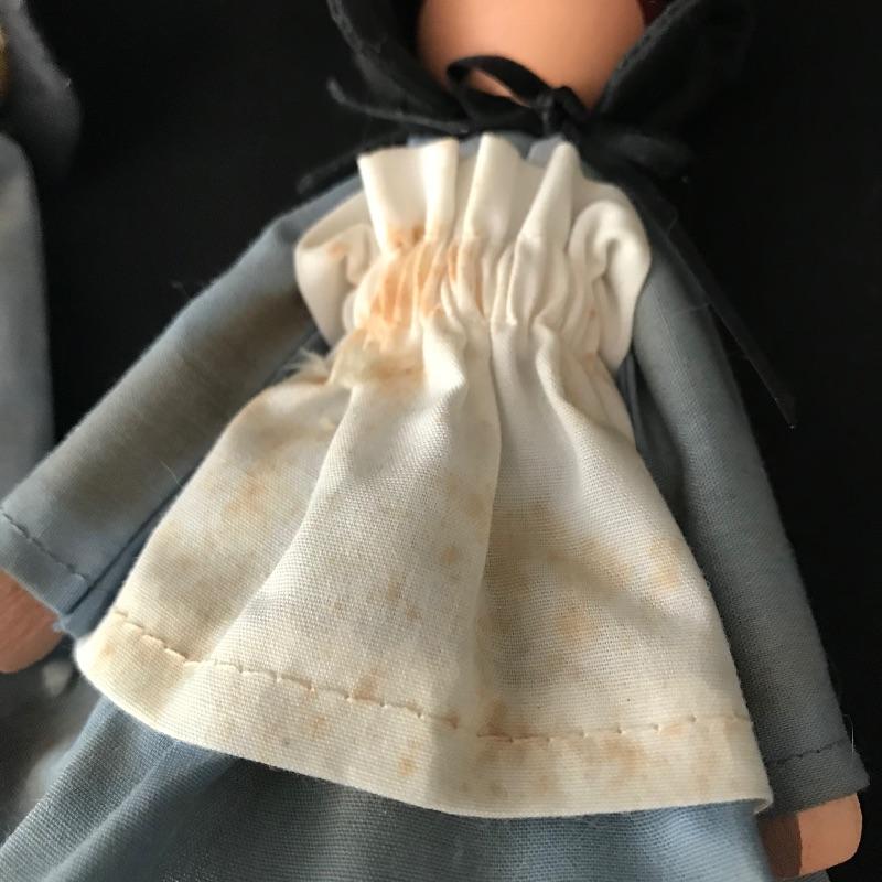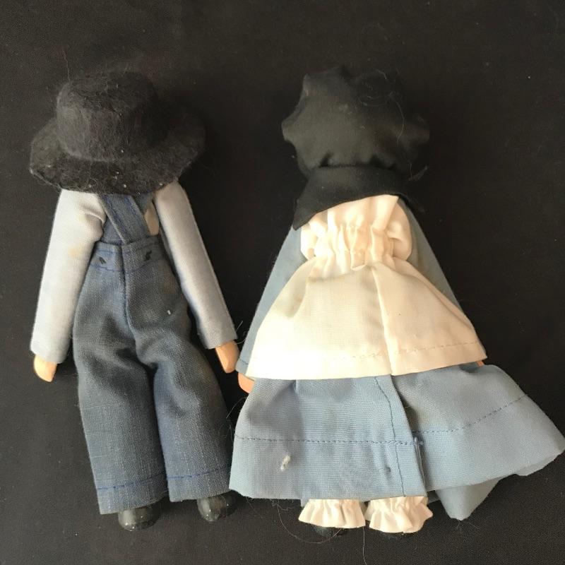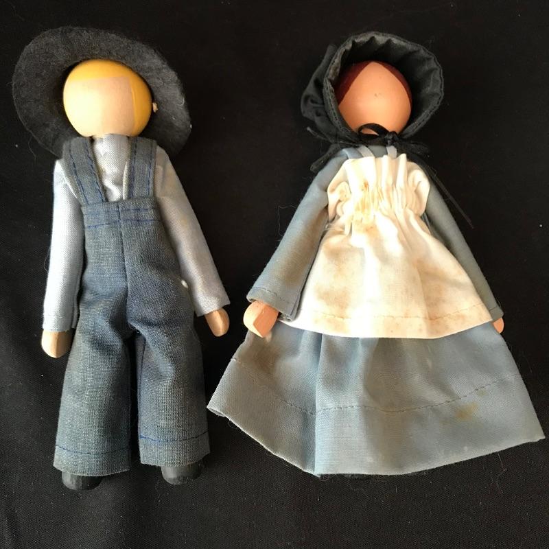 Three precious Amish dolls! The largest is 16” tall and is holding a finished doll sized quilt. She appears to be made completely of cloth. The smaller two 7” dolls have wood bodies, painted hair and lovely clothes and hats. All the dolls need some detailing, mostly dust, but also some spot cleaning on their clothes. See photos. Shipping available.