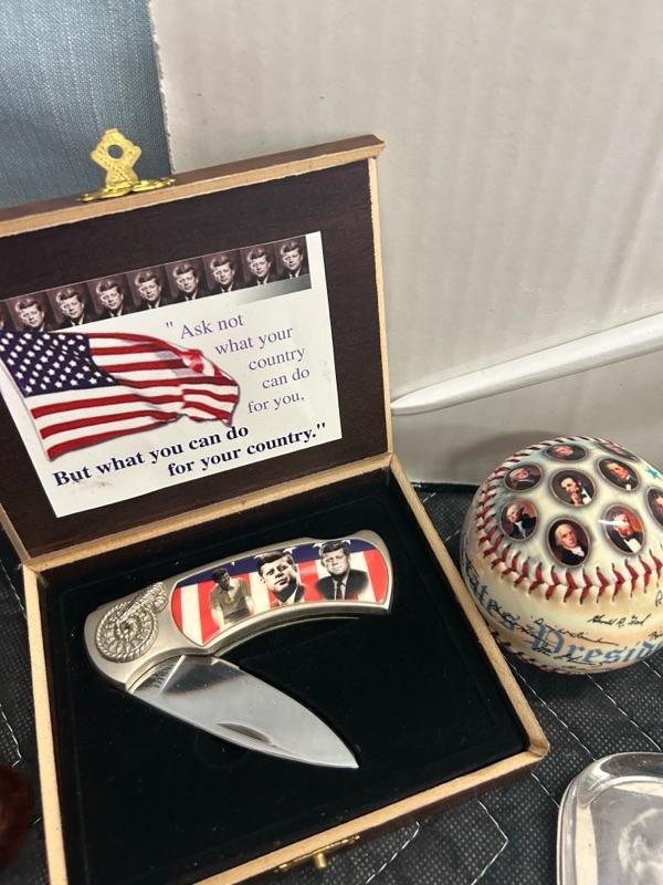 Various Kennedy home decor… paper weights, knife, pins, figurines, salt & pepper