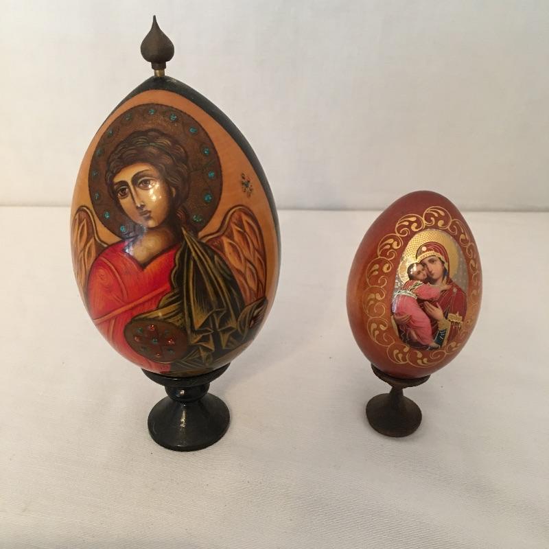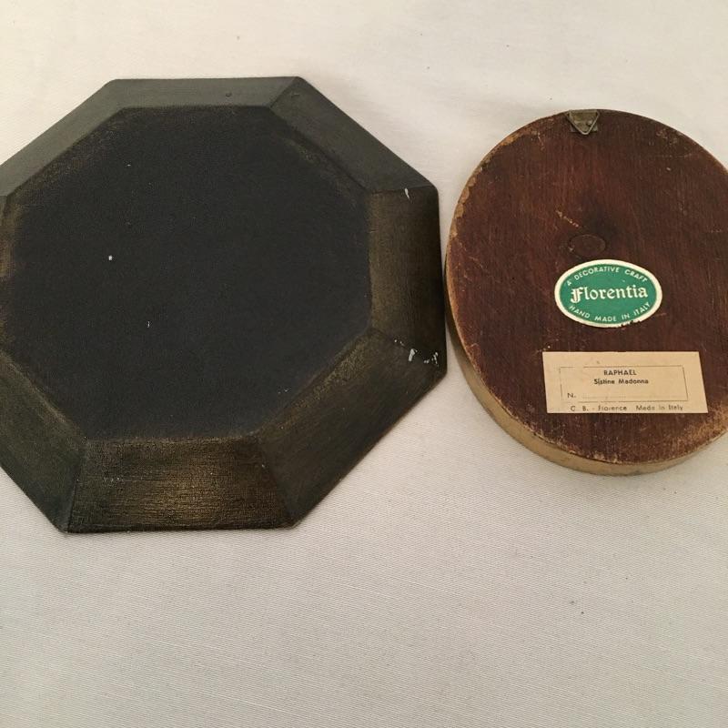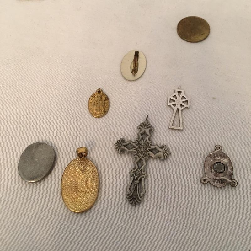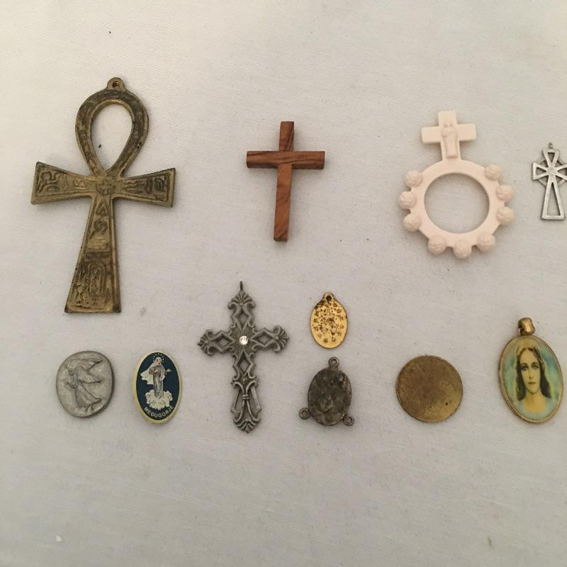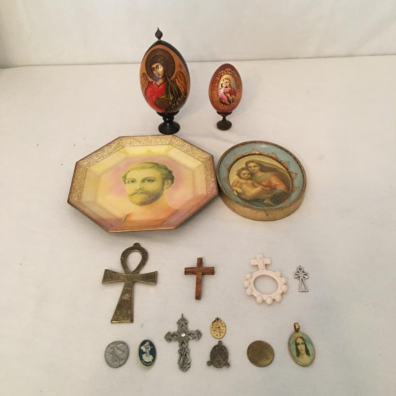 Some lovely vintage religious pieces here that includes two wooden egg shaped displays with biblical pictures on them, a plate, framed Madonna, small crosses and pendants.