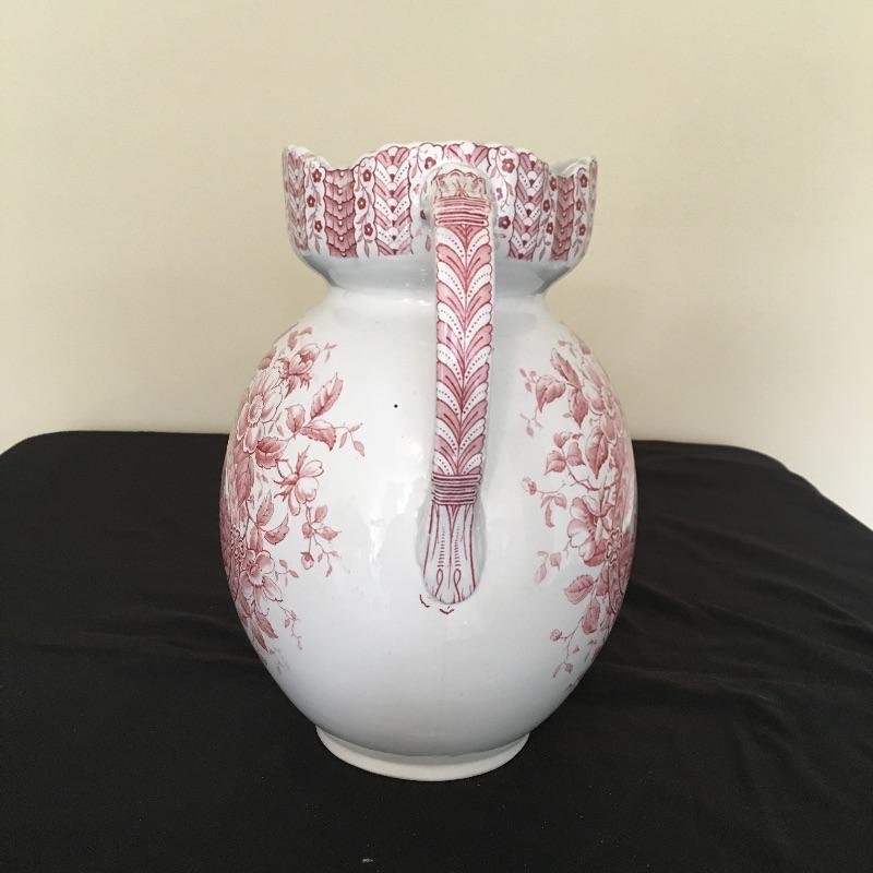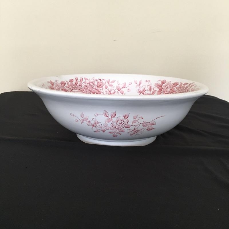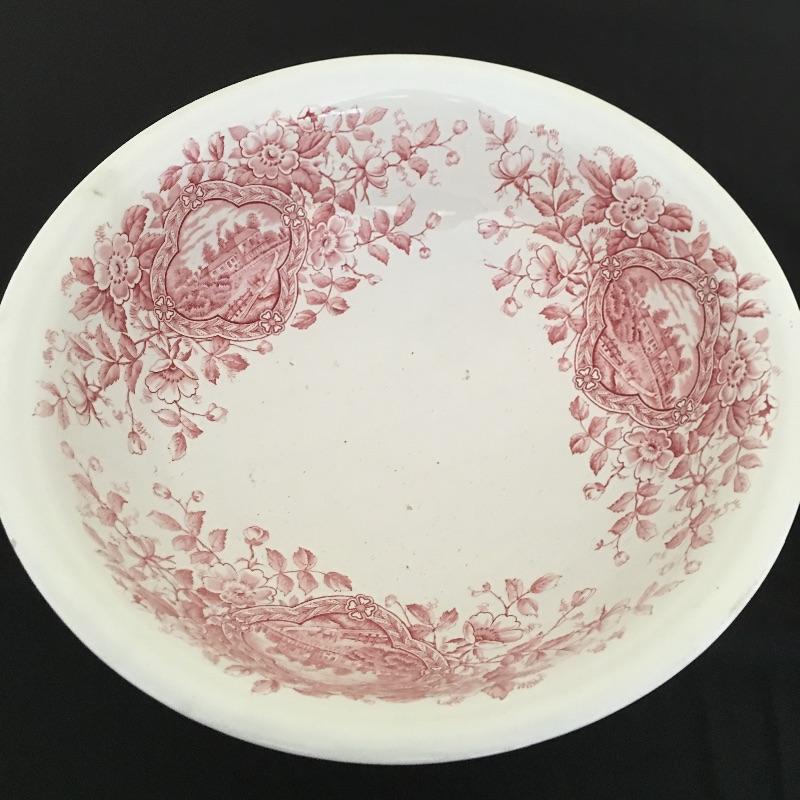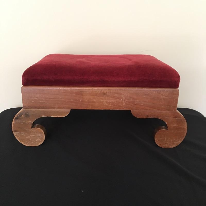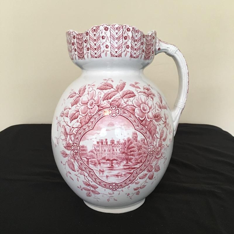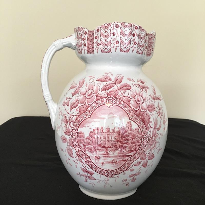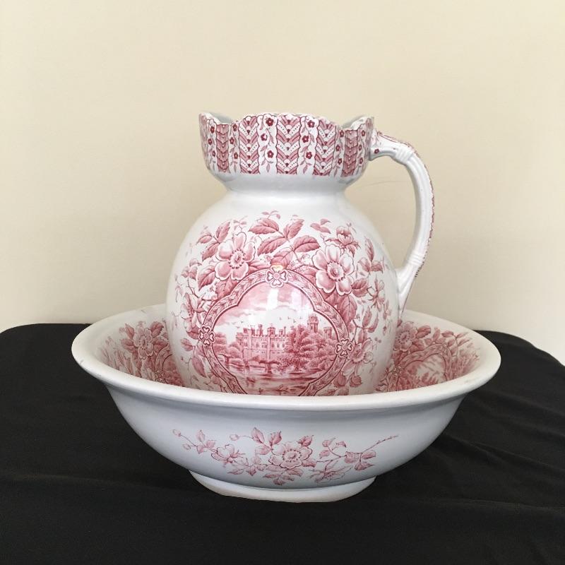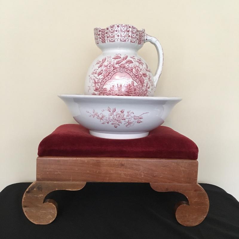 This Warwick basin has a floral design with a stately home on both sides of pitcher that will be a great addition to any collection. Lot also includes a wooden stool with a red velvet padded top.