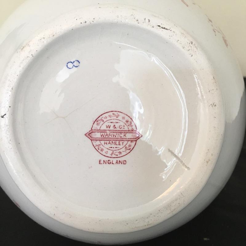 Basin and pitcher are marked Warwick Hanley England with basin measuring 14.25”D x 4.5” and stool measures 11.75” x 19” x 9”.