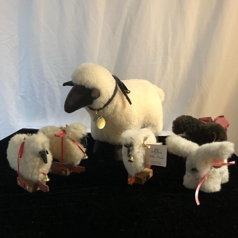 Add to your collection of Willie’s Woolies with this 6 piece array. Lot includes three sheep on wooden bases, larger sheep and two bunnies. These animals are handmade and made of pelts and natural fabric. Largest sheep measures 6” x 16” x 12”.