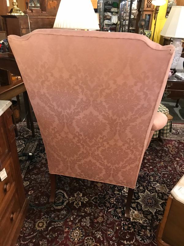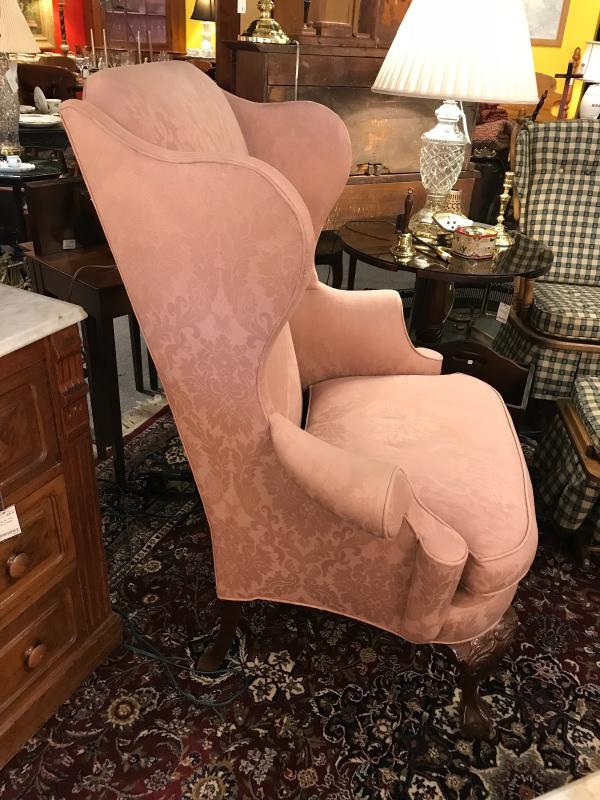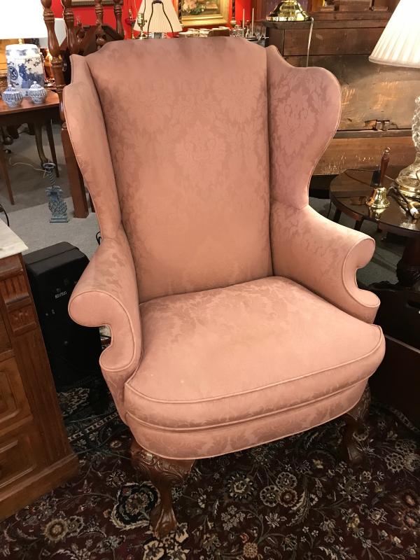 Very nice wing chair by Southwood Furniture. Features ball and claw feet with carved scrolls on the knees. Upholstered in light pink damask. Very comfortable and sturdy. 37" x 34" x 46" H