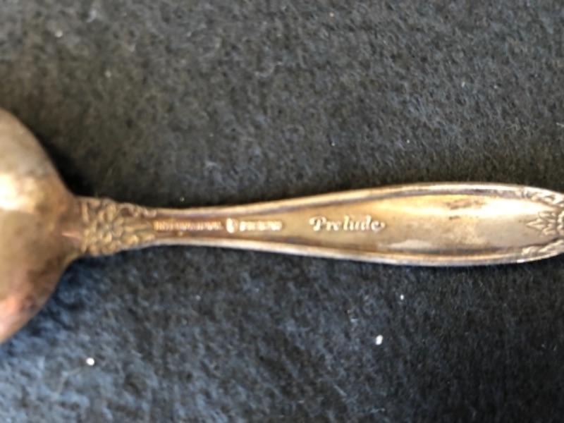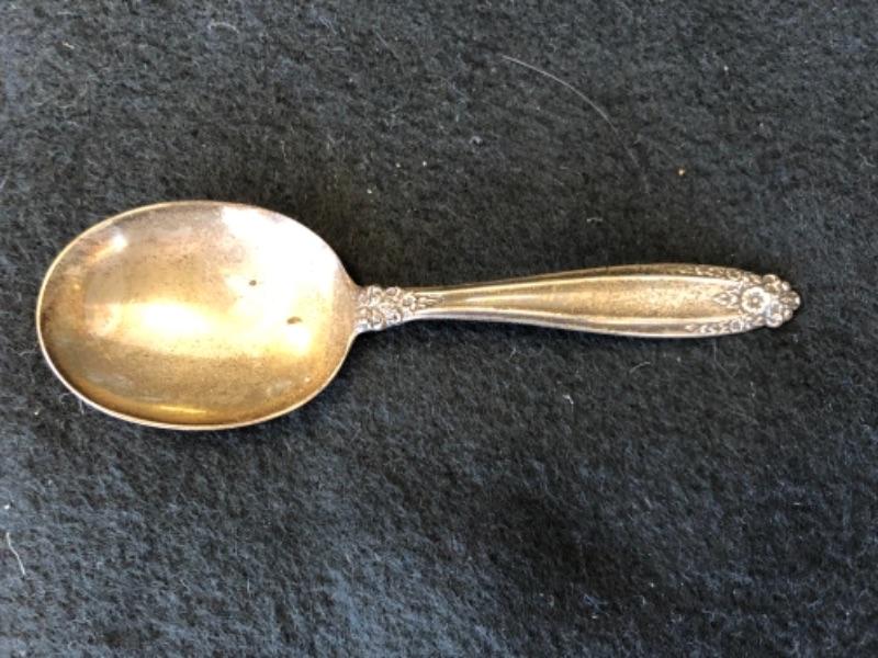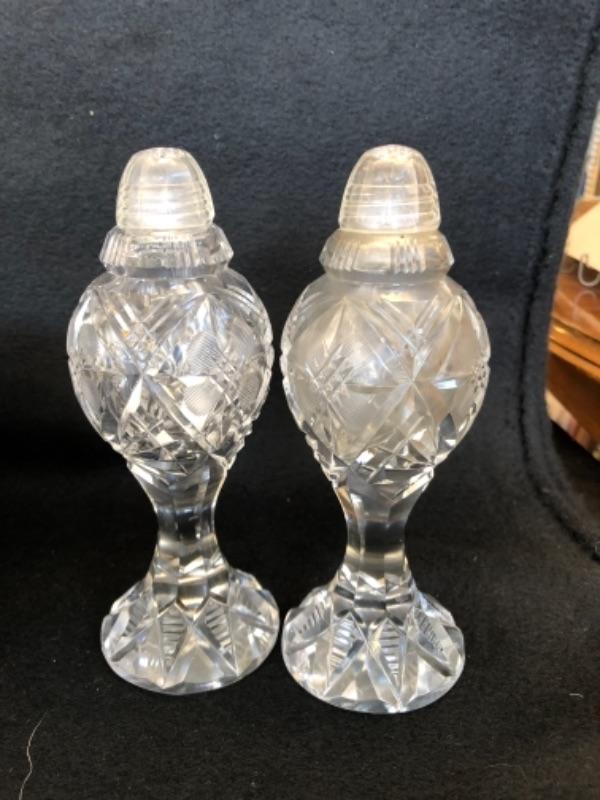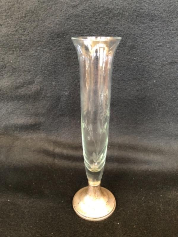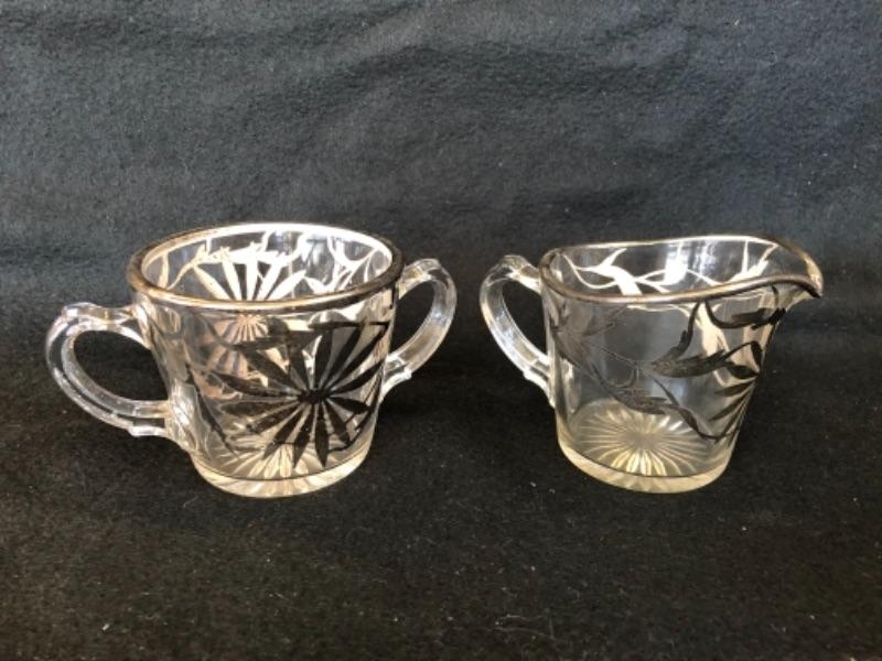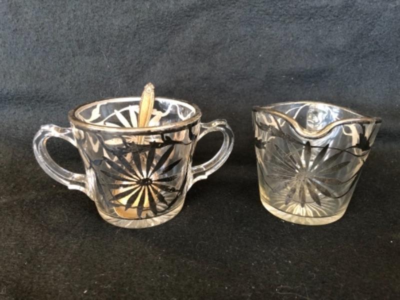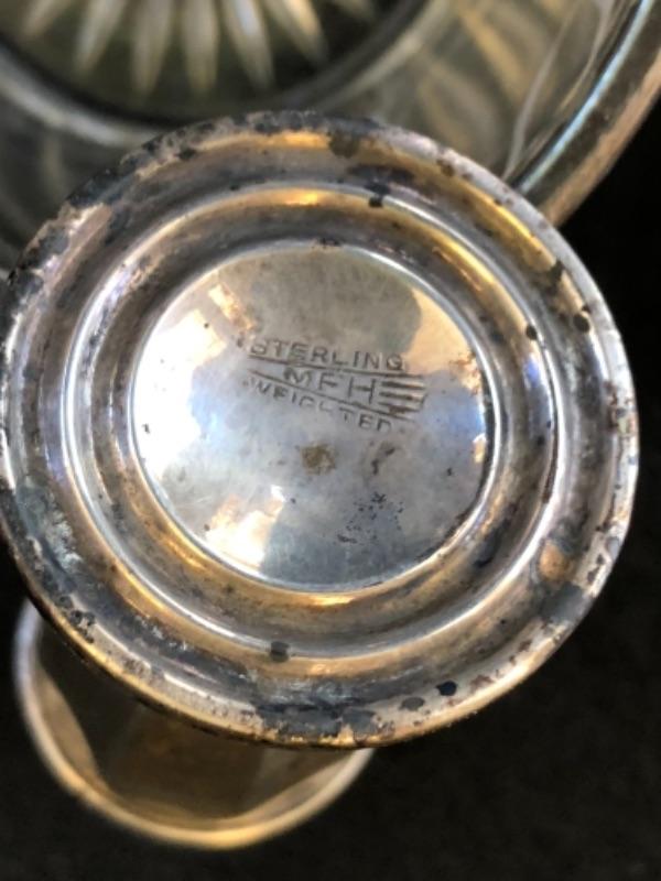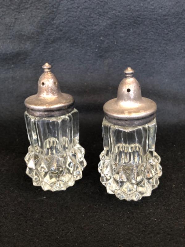 Lot 13P. Salt & Pepper set, crystal; Salt & Pepper set, crystal with sterling silver tops; Sterling Silver Salt and Pepper, weighted, MFH; Vintage open creamer & sugar set in glass with silver overlay, Art Nouveau style, Small Sugar spoon, Sterling International, “Prelude”; Silver Plate small bowl, Webster Wilcox International Silver Co.; Alvin Glass bud vase with sterling silver weighted base, S 288; Glass Cake Stand with Sterling Silver base, Candlewick style, Douchins Creation