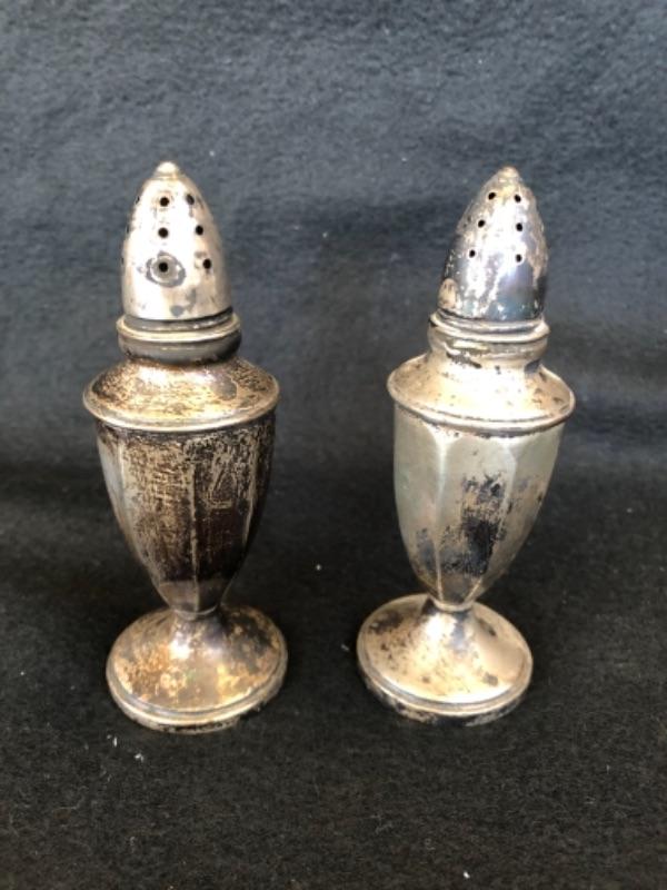 Lot 13P. Sterling Silver, Silver Plate Salt & Pepper sets, cream and sugar set, cake stand, bud vase, bowl “” $75