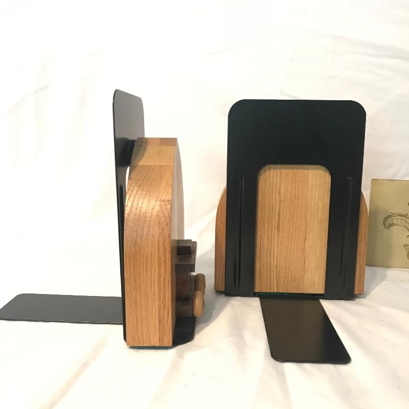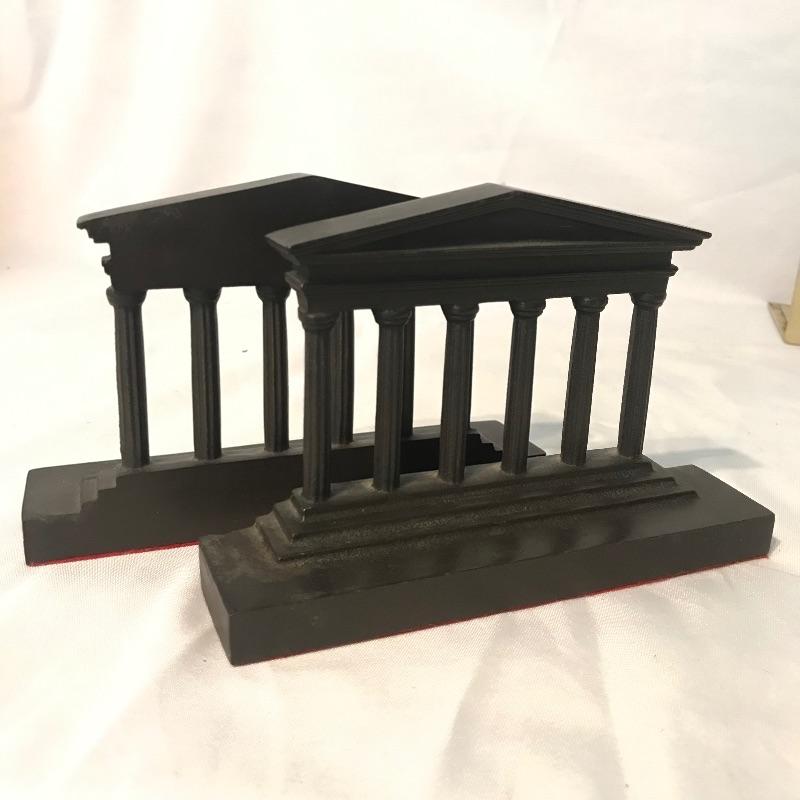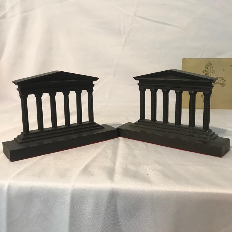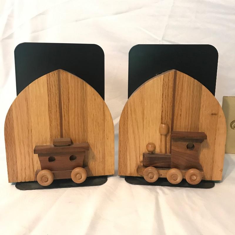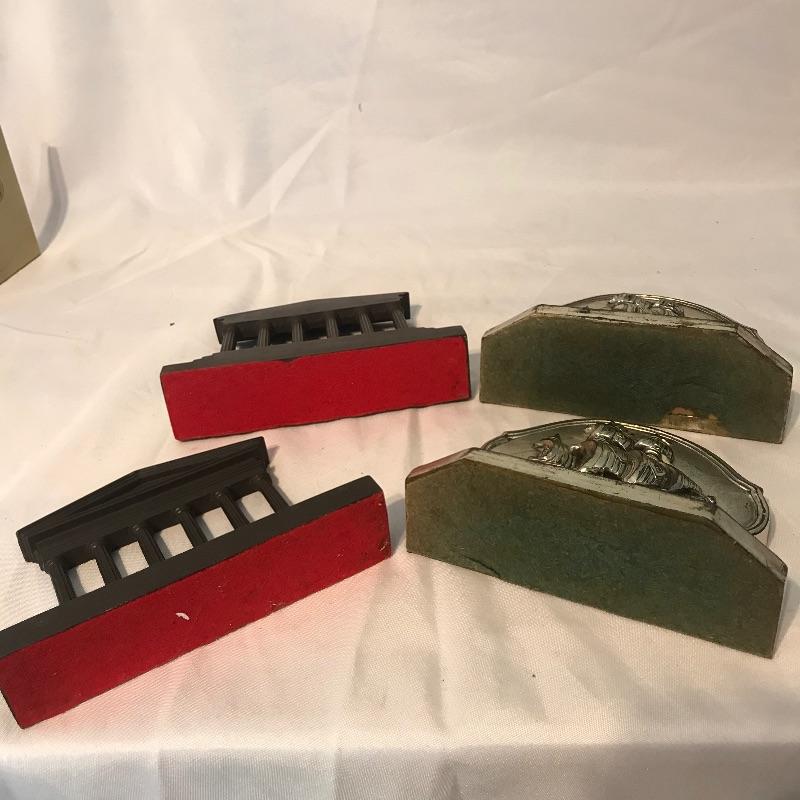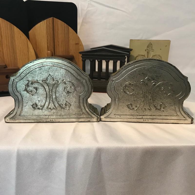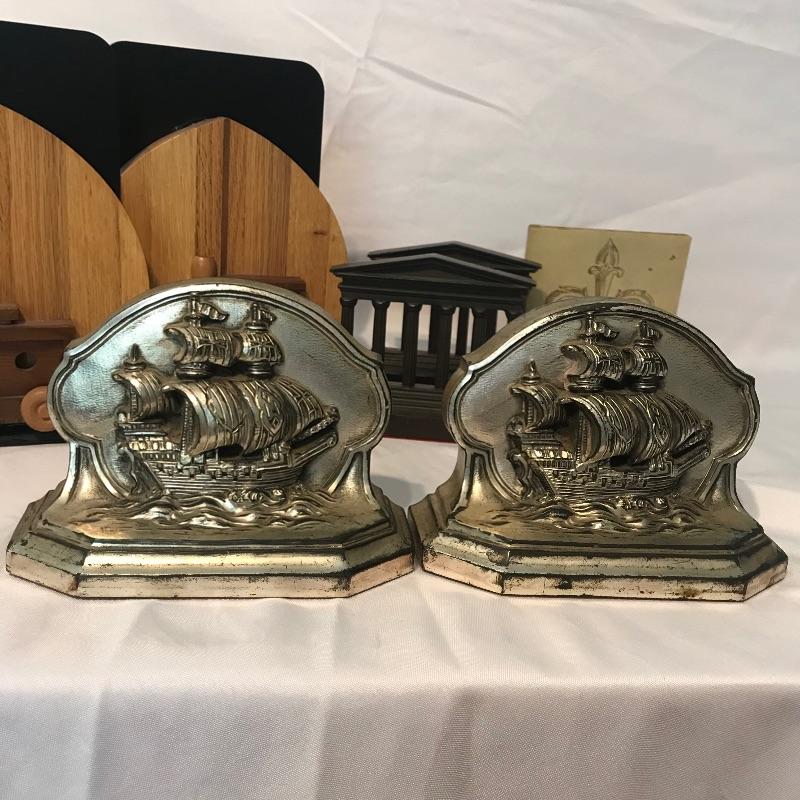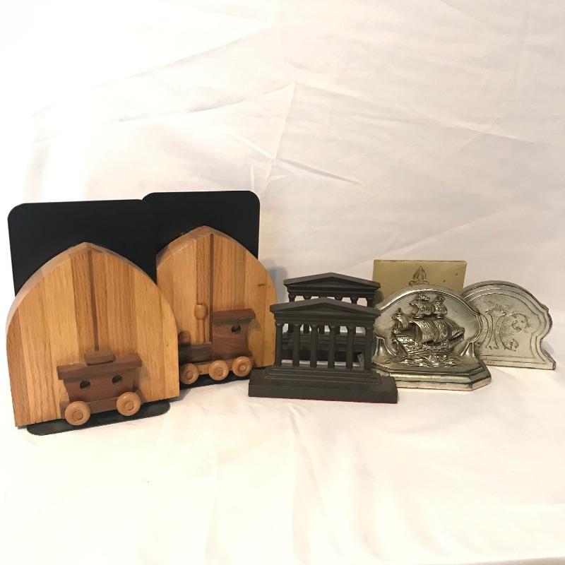We’ve got a pair of book ends for three areas of your house here. A shiny silver metal ship pair with 513 marked near the inside bottom, a pair of heavy metal Doric pillars, and a cute wooden train pair attached with Velcro to 9” tall office style metal ends. Lot also includes a vinyl like lightweight Fleur-de-lis bookend that is missing its pair. See photos. Shipping Available