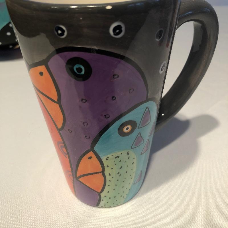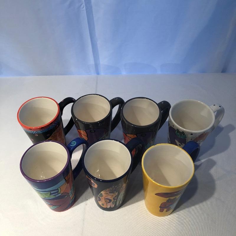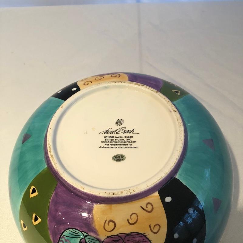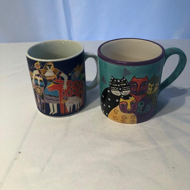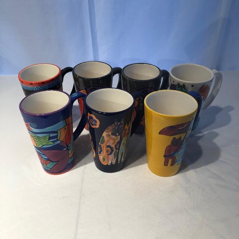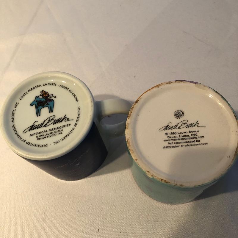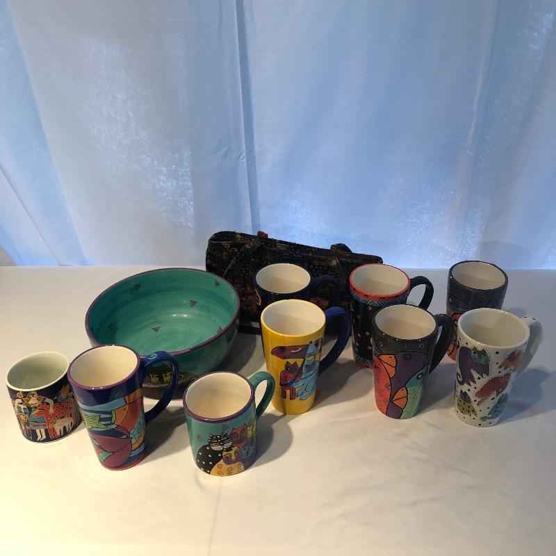 This lot includes 6 mugs, a purse, two matching mugs, and a matching bowl and mug set. Every piece has a laurel Burch print and a seal or tag. One of the mugs has a small chip at the top but it is not very noticeable. The bowl measures about 10in(w) x 4.5in(h). Shipping available.