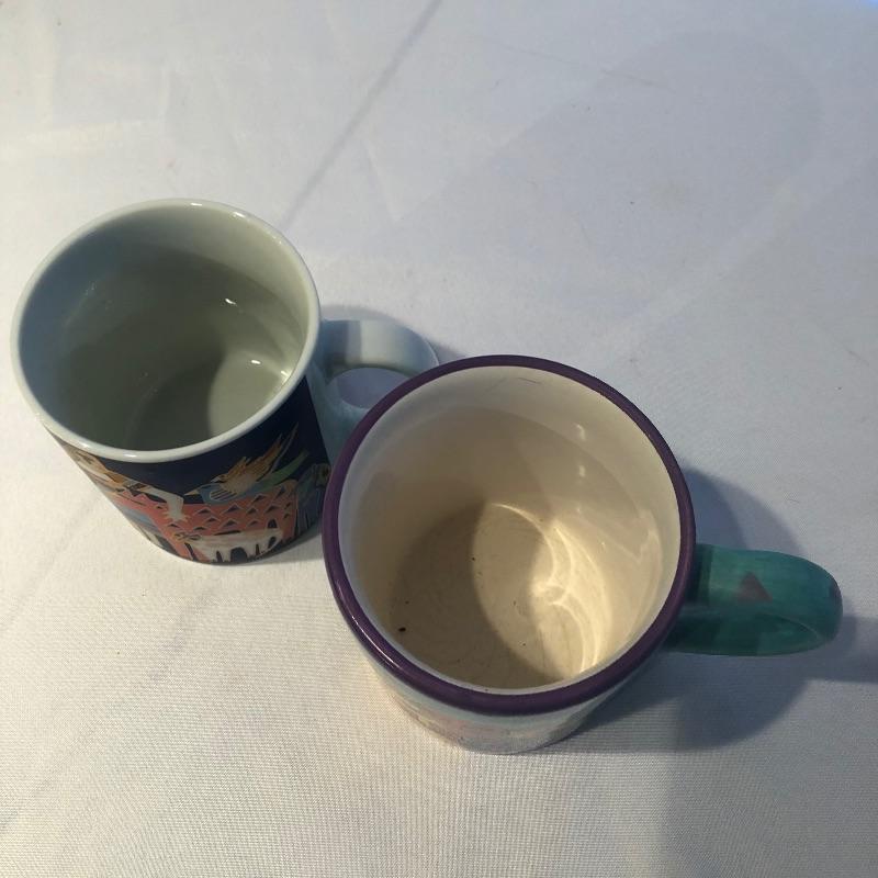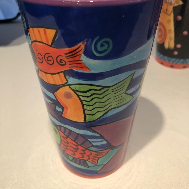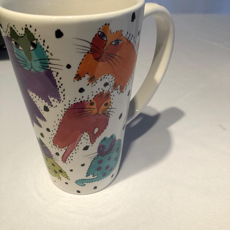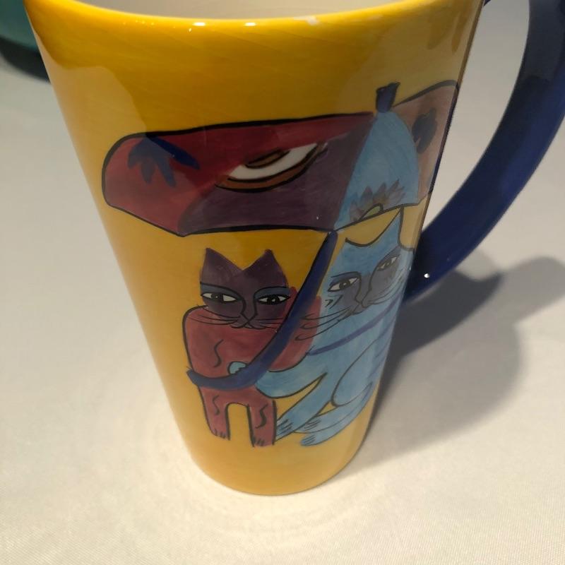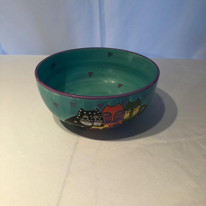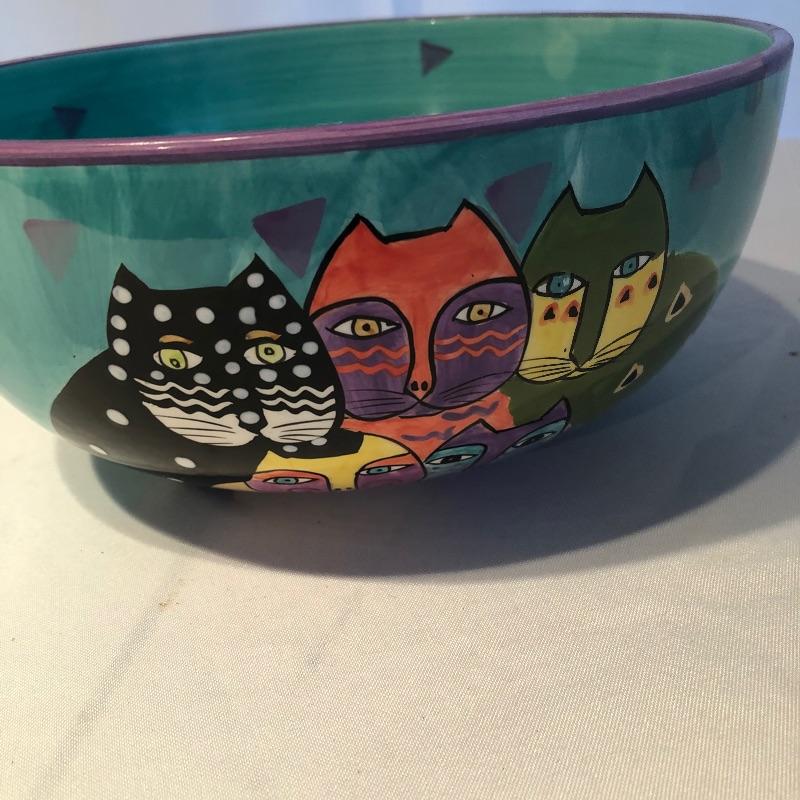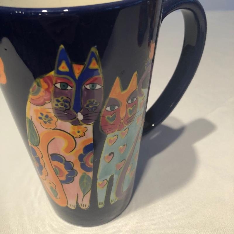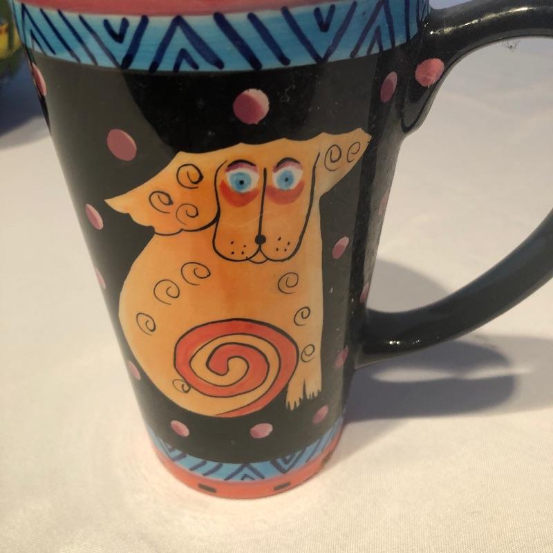 This lot includes 6 mugs, a purse, two matching mugs, and a matching bowl and mug set. Every piece has a laurel Burch print and a seal or tag. One of the mugs has a small chip at the top but it is not very noticeable. The bowl measures about 10in(w) x 4.5in(h). Shipping available.