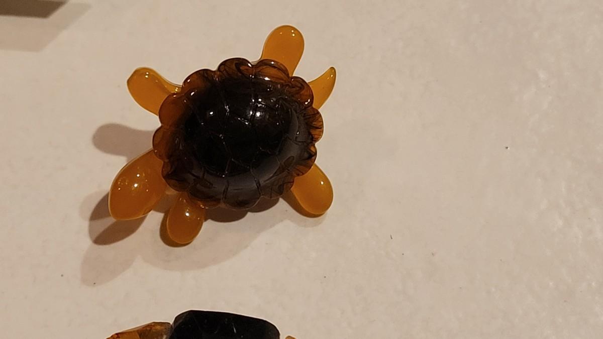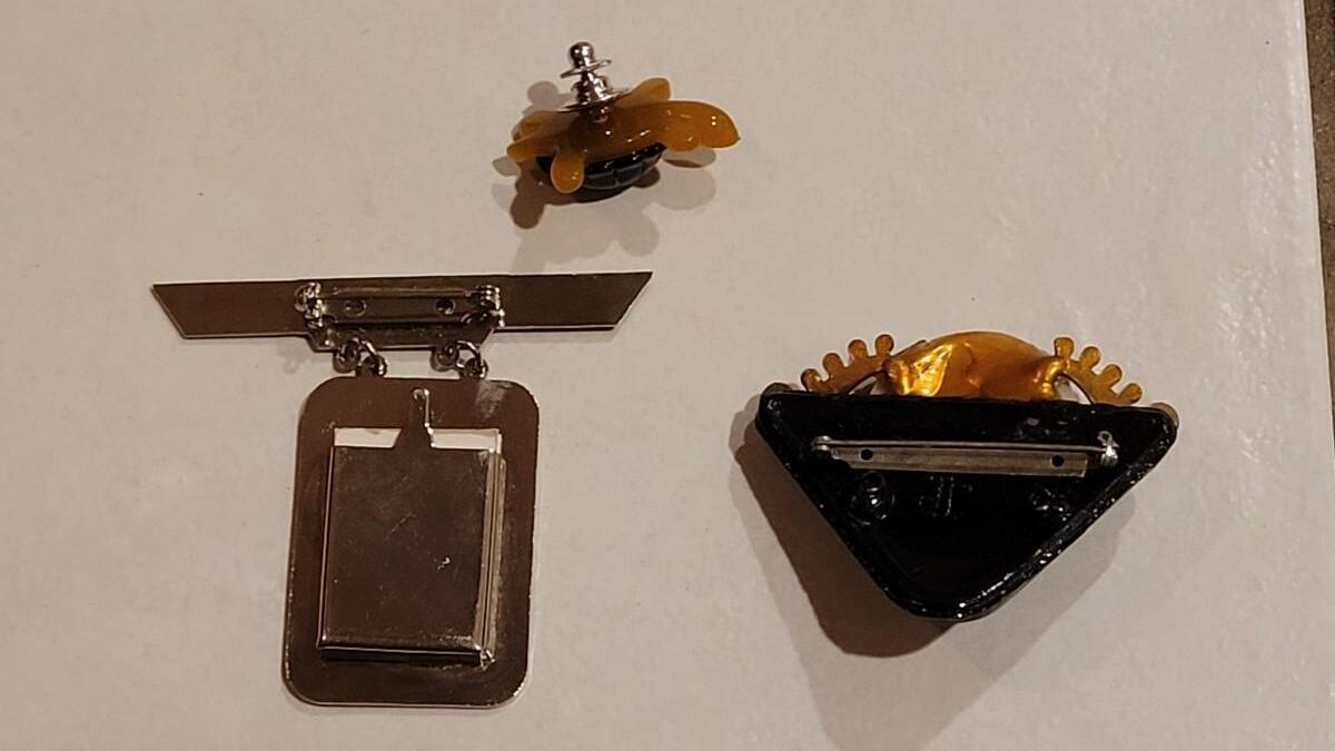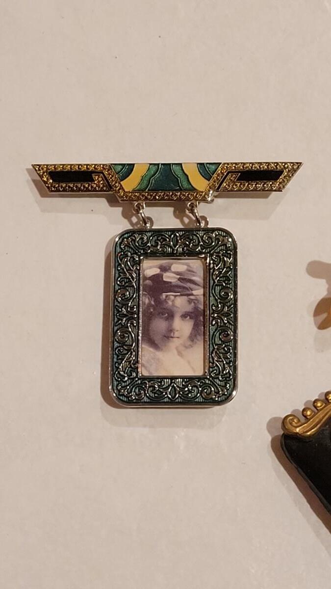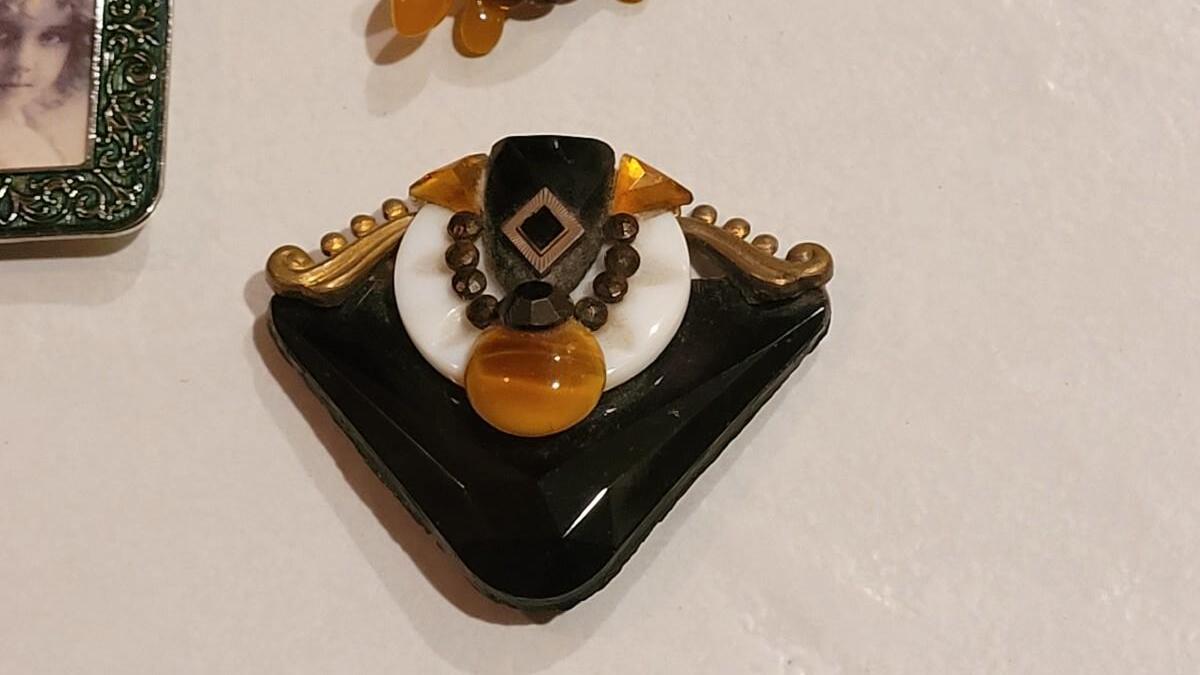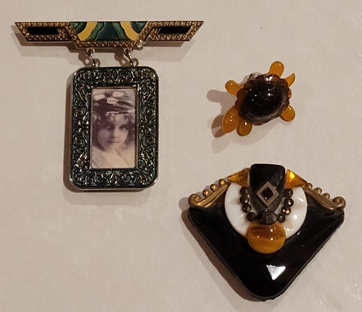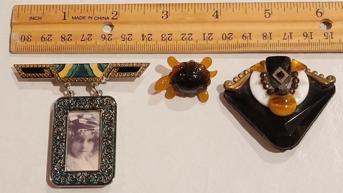 Art Deco Metal Photo Frame Brooch, Plastic turtle brooch, and Tiger's eye brooch with mixed materials.