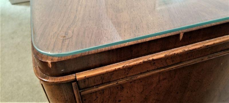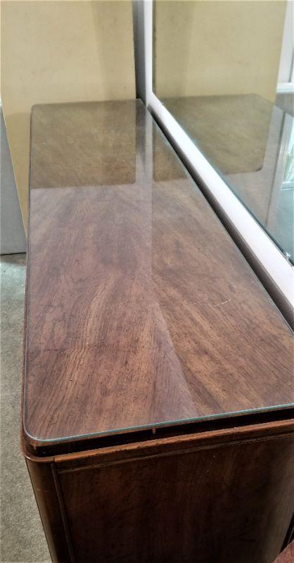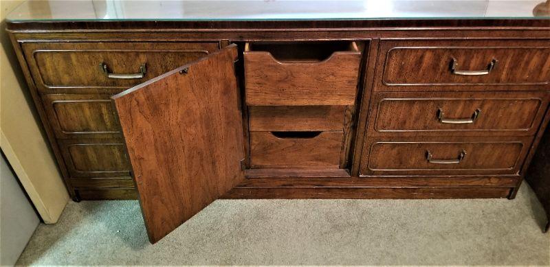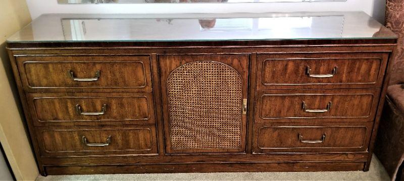 Vintage (1970's) 9 drawer dresser - heavy/solid wood. No maker noted. 72" long, 19.5" deep, 31" tall. Has a rounded edge glass top. Woven Cane insert hides three drawers. A few small chips to the wood (as shown). Good used condition.