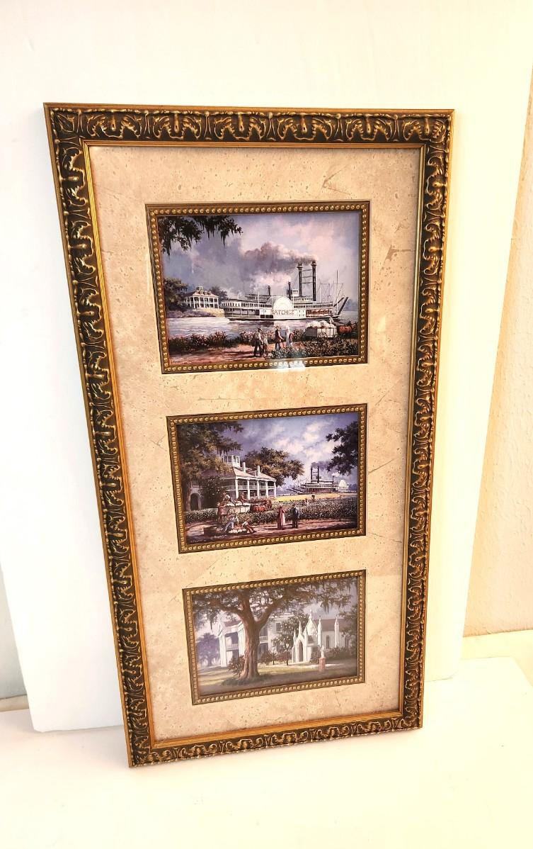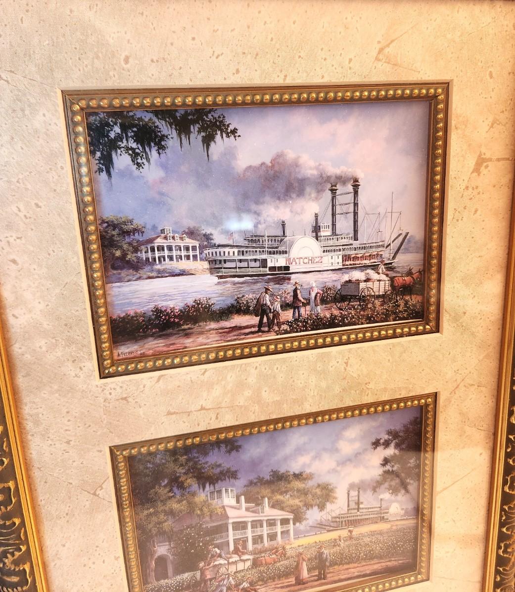 Decorative art prints by New Orleans artist Al Federico. Scenes include Manresa Retreat House, Cotton Picking, Natchez Steamboat. 13" across, 25" tall. Great condition.