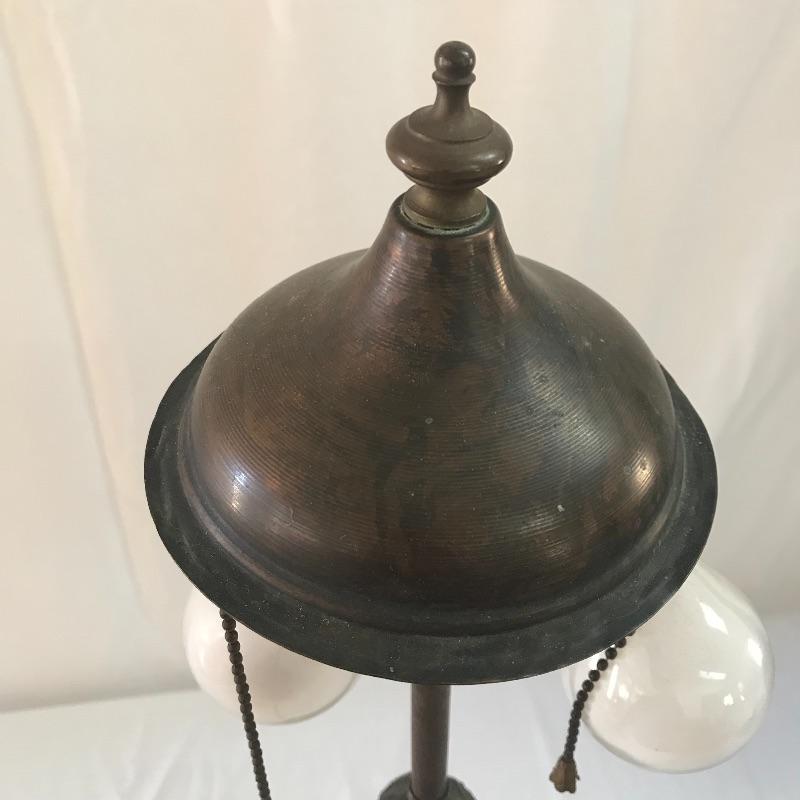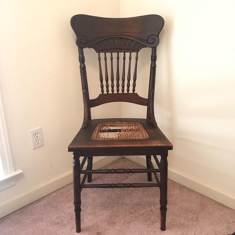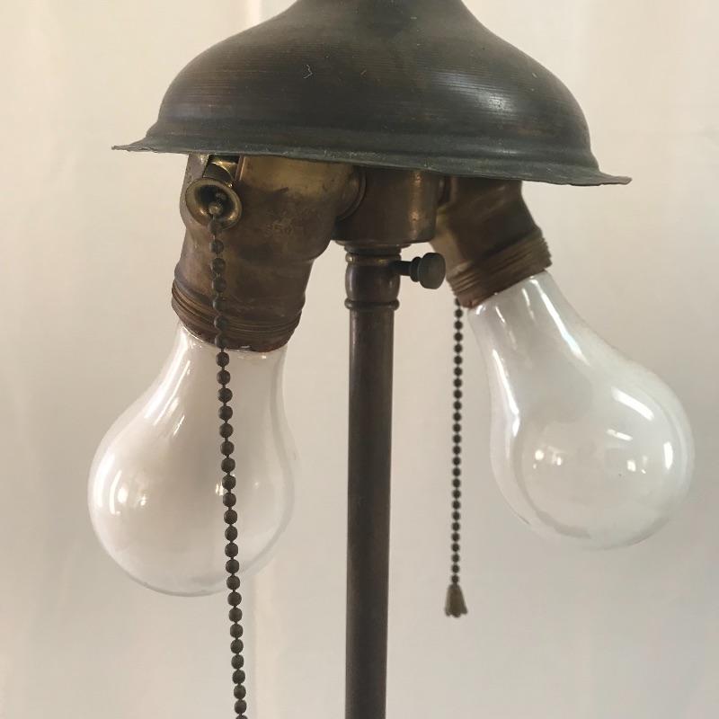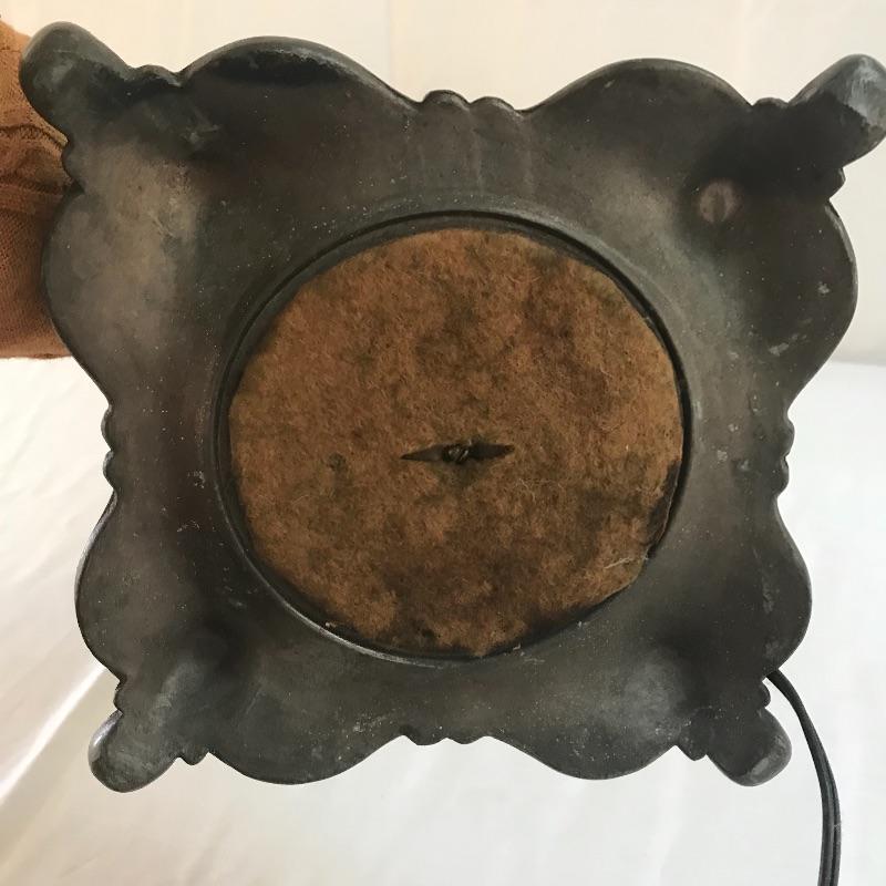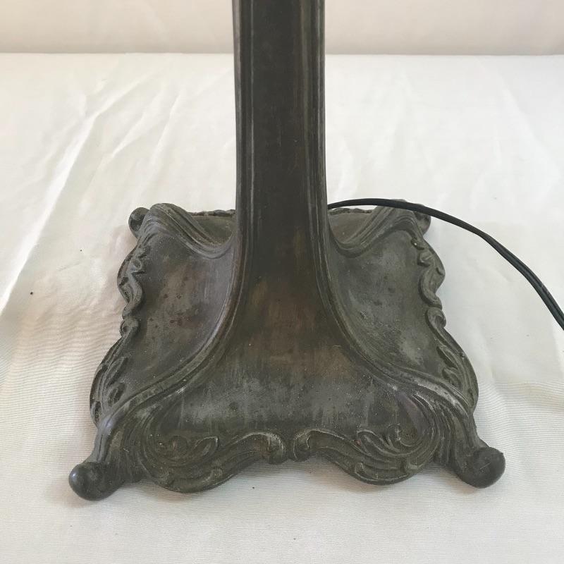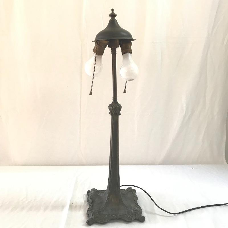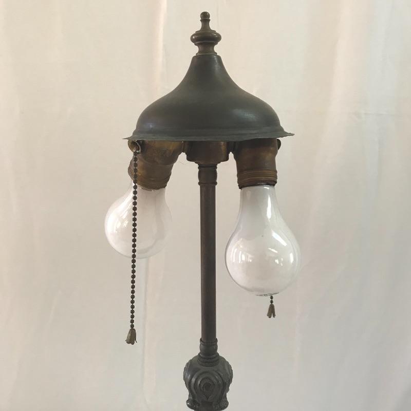 Perfect vintage duo! Fancy dark wooden chair with a seat in need of repair or add a cushion. Heavy metal antique lamp in is absolutely stunning. Both sockets work, but metal string hitch appears stuck in place. Chair measures 17.5” x 16” x 39”. No shipping.