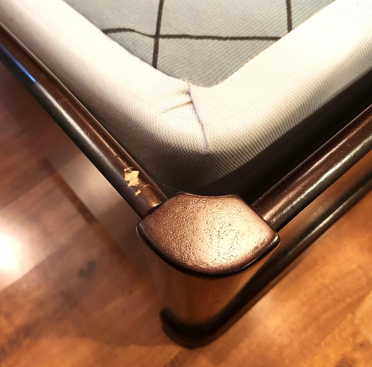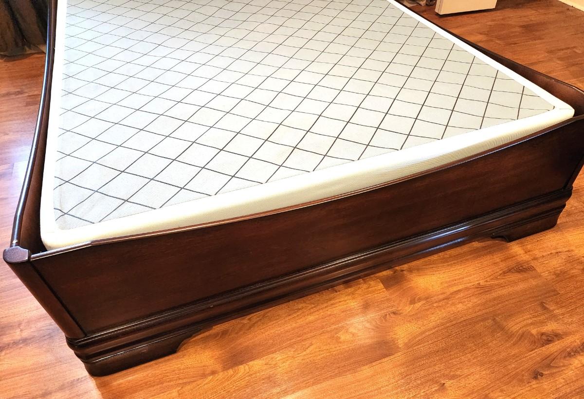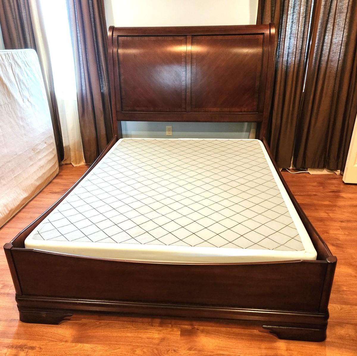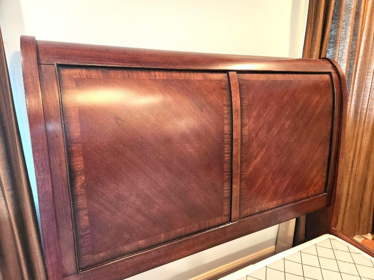 Note - this bed has a box spring only - no mattress. Also comes with headboard and frame. Ashley Furniture Co, Solid wood - one small "hickey" on frame (as shown). This piece is upstairs. If you don't want the boxspring, you can leave it. Bed is 63" across, 89" long, 60" tall. Matches the other pieces in the suite that were shown earlier.